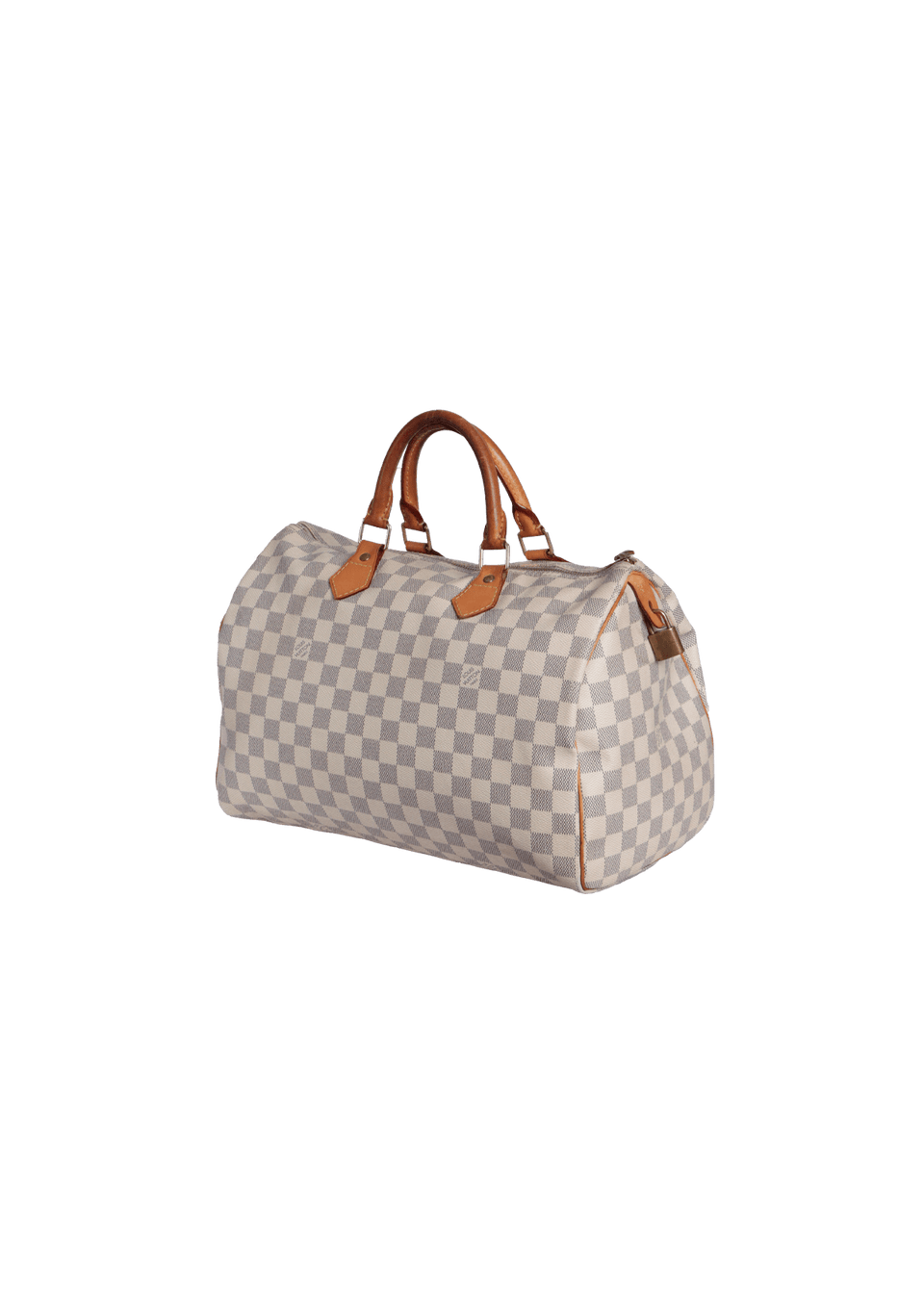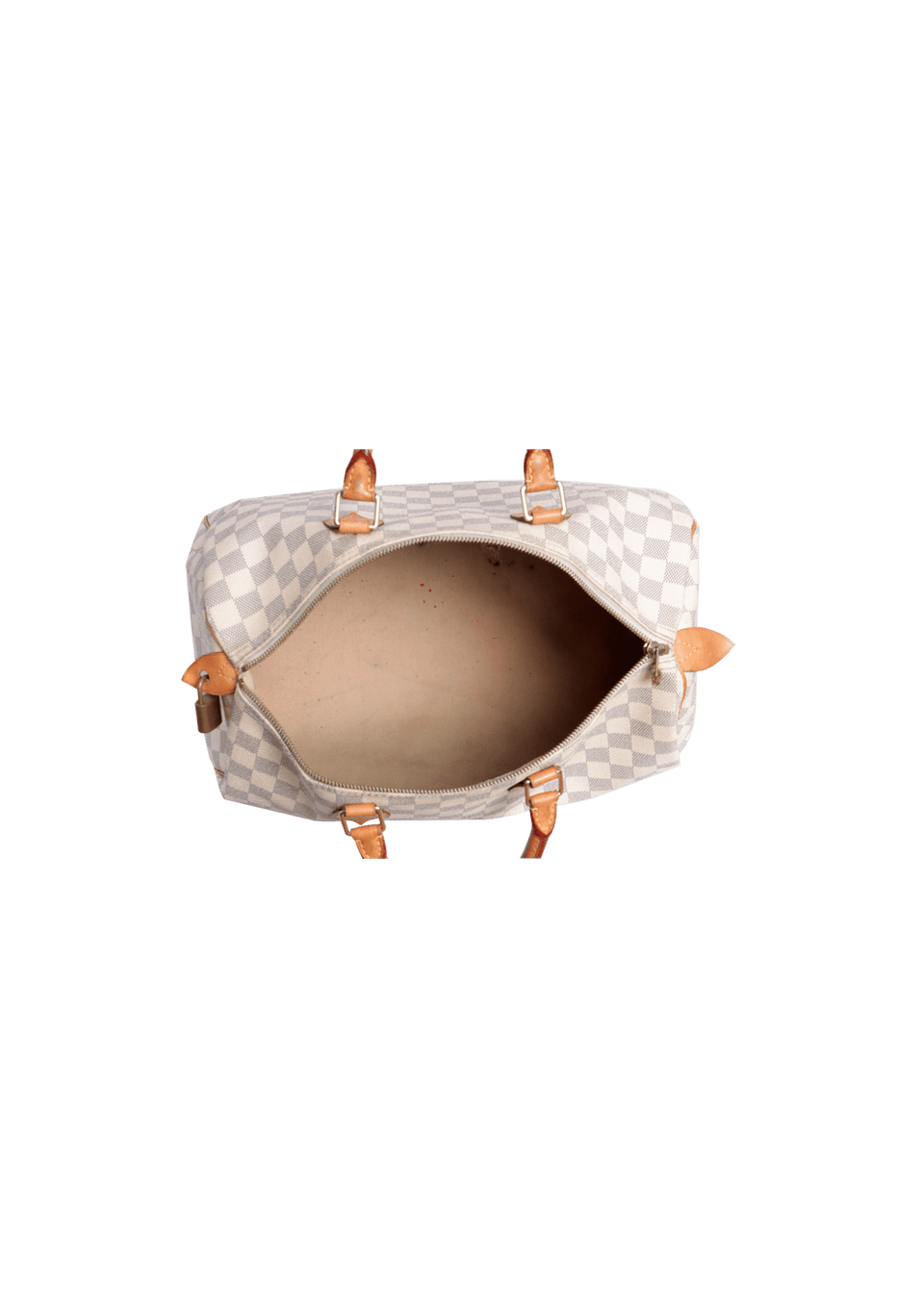 Condição: Regular. Apresenta ausência do puxador do cursor de fechamento, consideráveis manchas escurecidas e desgastes no couro vachetta, severas marcas de uso no forro, principalmente manchas escurecidas e de caneta, consideráveis desgastes e oxidações das ferragens, consideráveis desgastes no canvas dos cantos inferiores, notáveis desgastes nas selagens das alças de mão e notáveis deformações no canvas das laterais da bolsa.