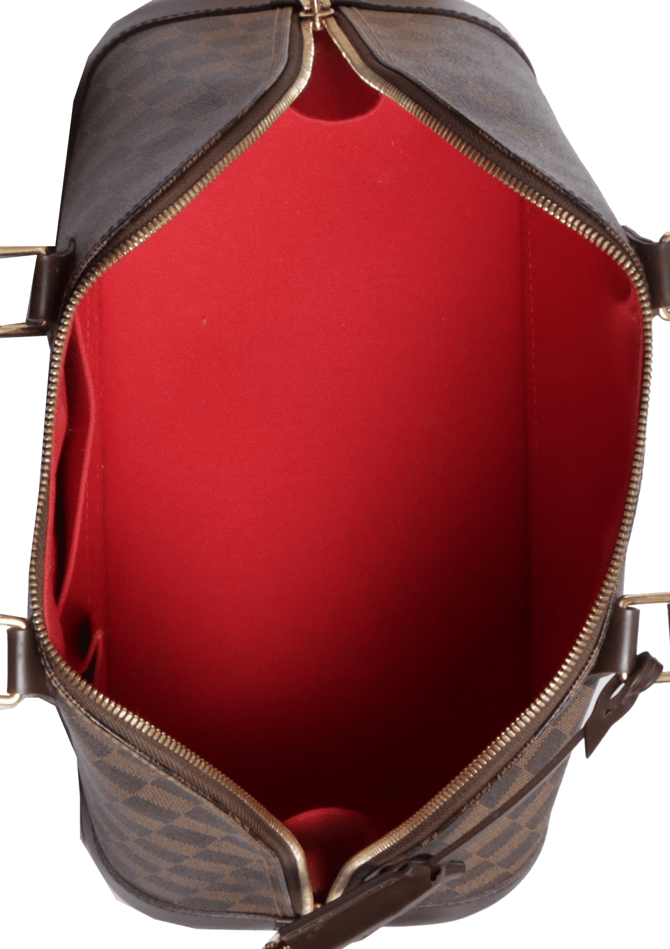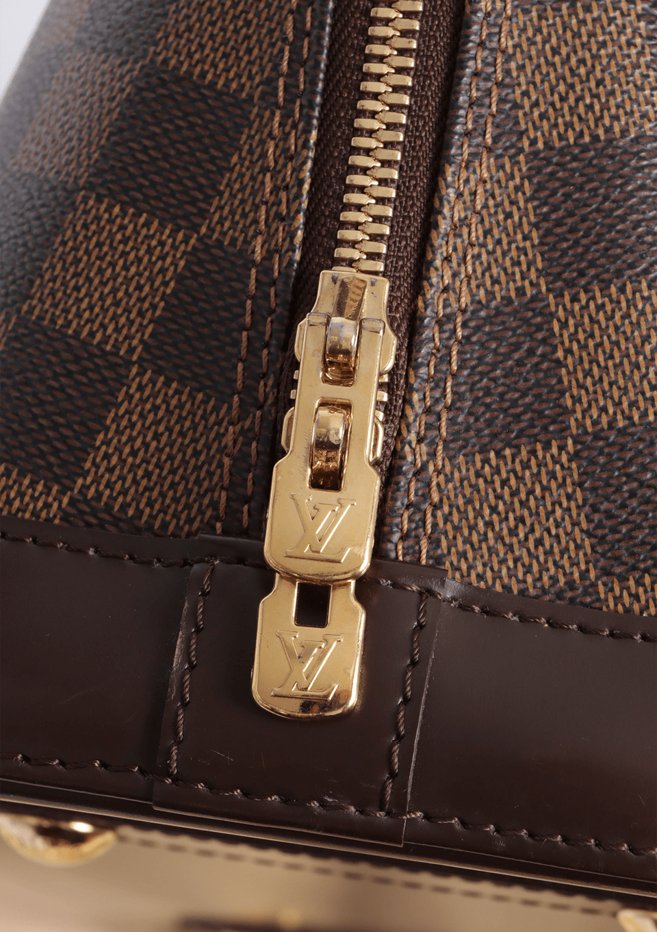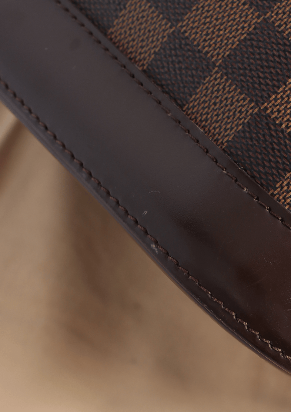 - Canvas Damier Ébène e couro calfskin marrom com acabamento escovado;