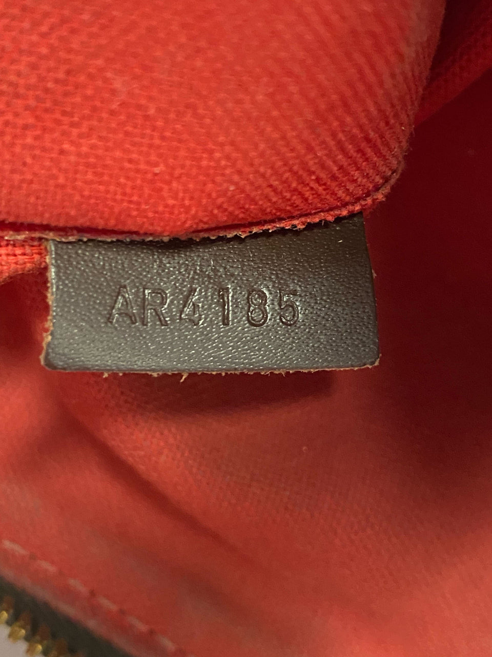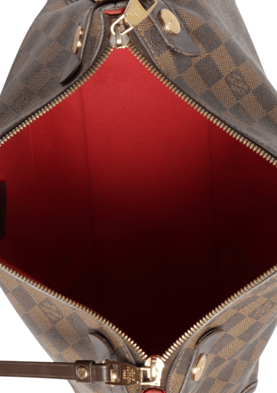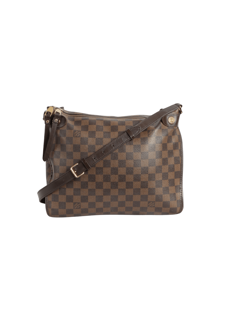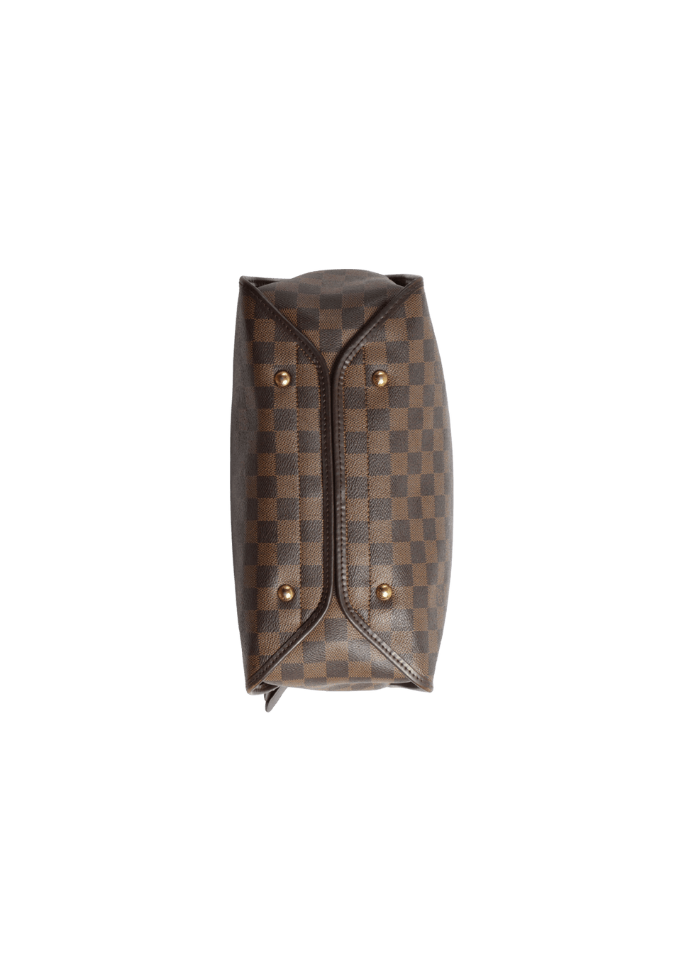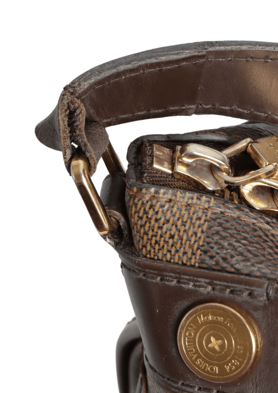 - Canvas Damier Ébène e couro calfskin com acabamento escovado marrom;