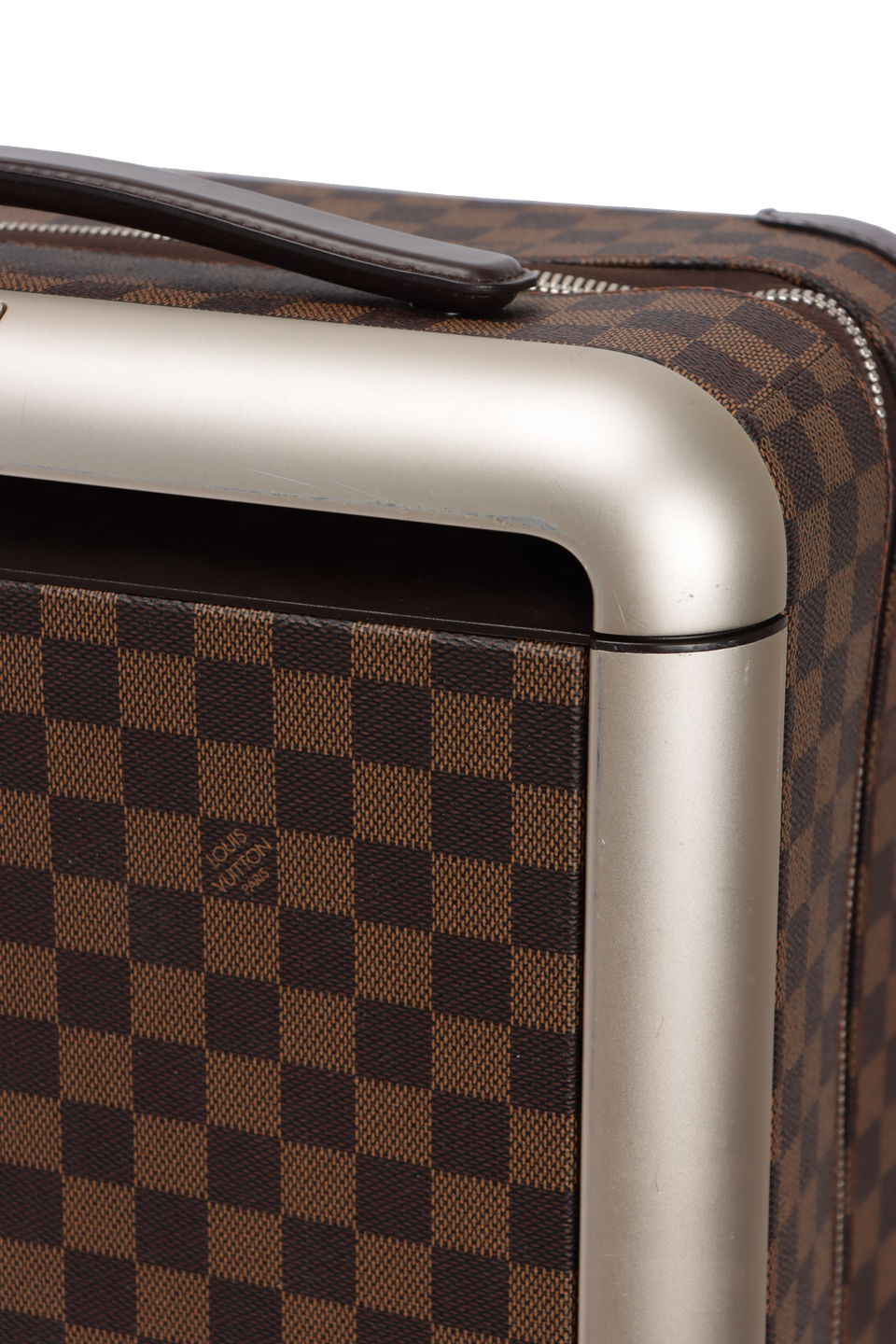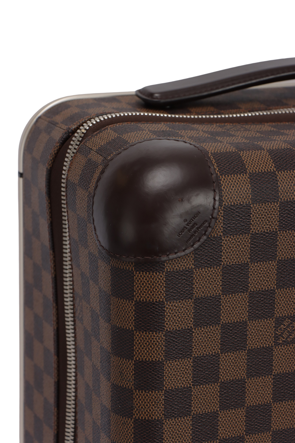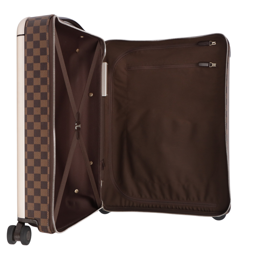 Descrição do Material: Canvas Damier Ébène com detalhes em couro calfskin marrom, plástico preto enrijecido e alumínio