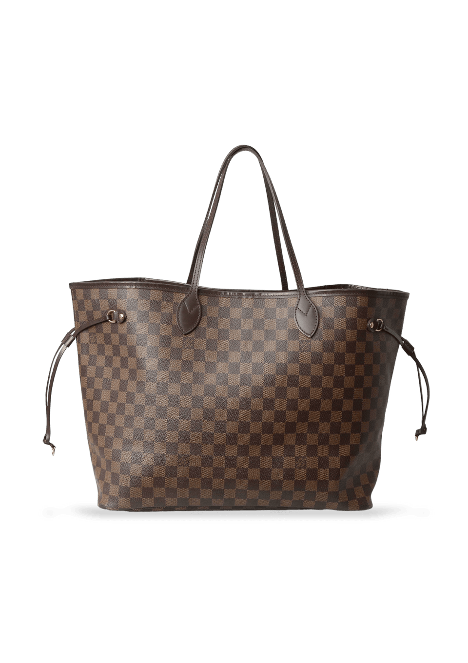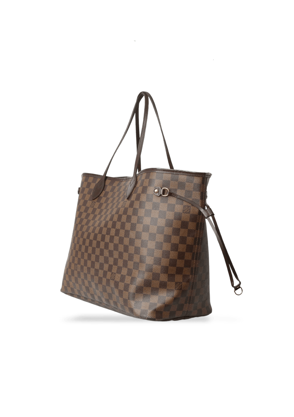 A bolsa Louis Vuitton modelo Neverfull em tamanho GM (grande) confeccionada no canvas Damier Ébène com acabamento em couro natural marrom. Possui cordões laterais com acabamento de ferragens em tom dourado, alças finas e confortáveis para uso sobre o ombro ou braço, forro interno em tecido vermelho e um bolso com zíper.