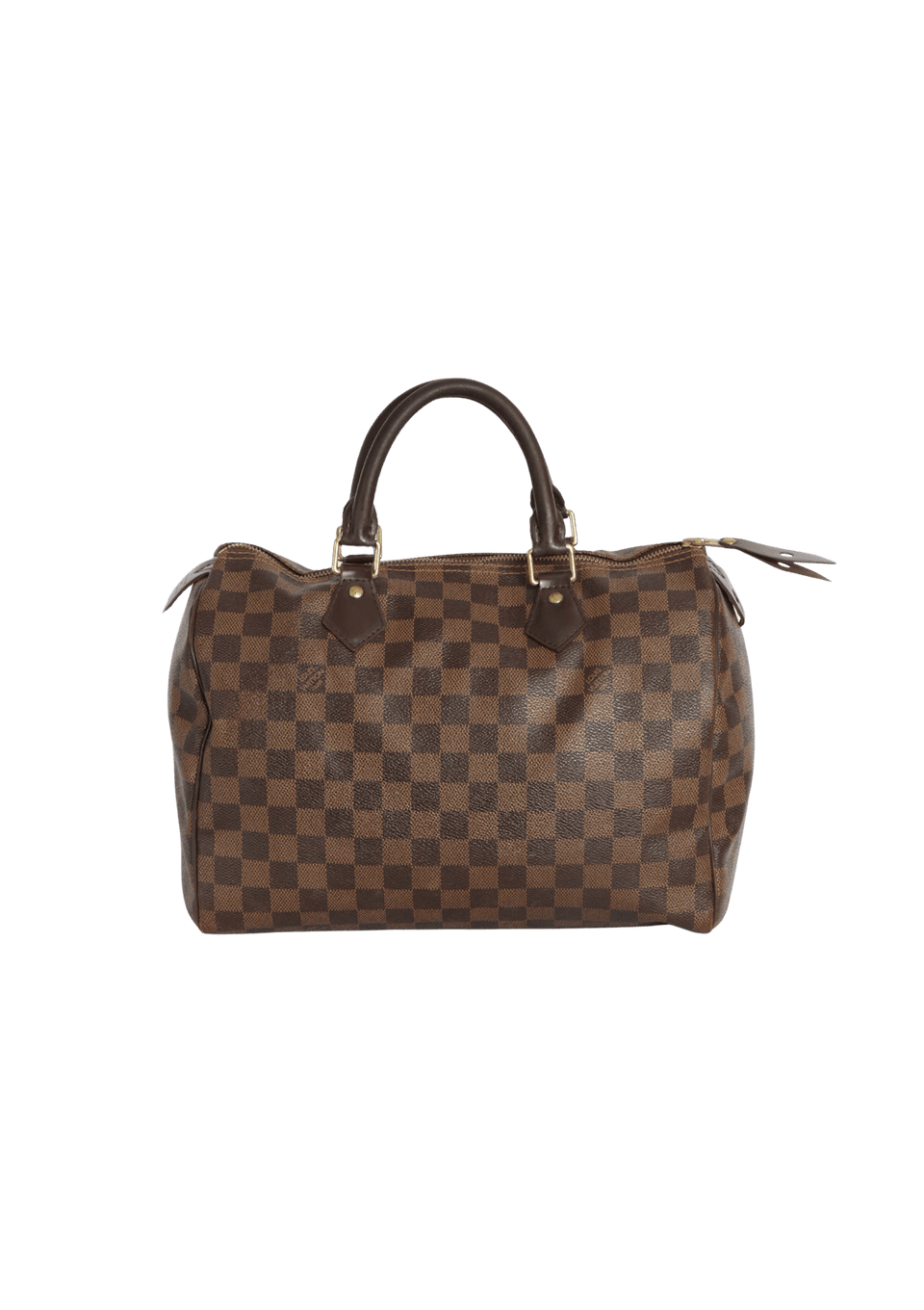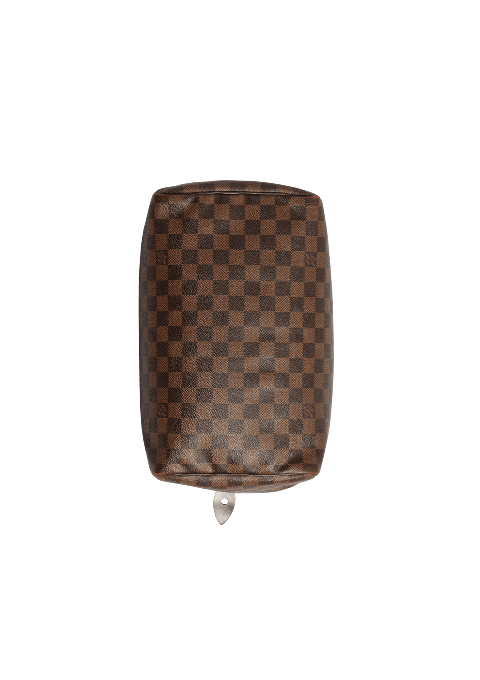 - Couro calfskin com acabamento escovado marrom e canvas Damier Ébène;