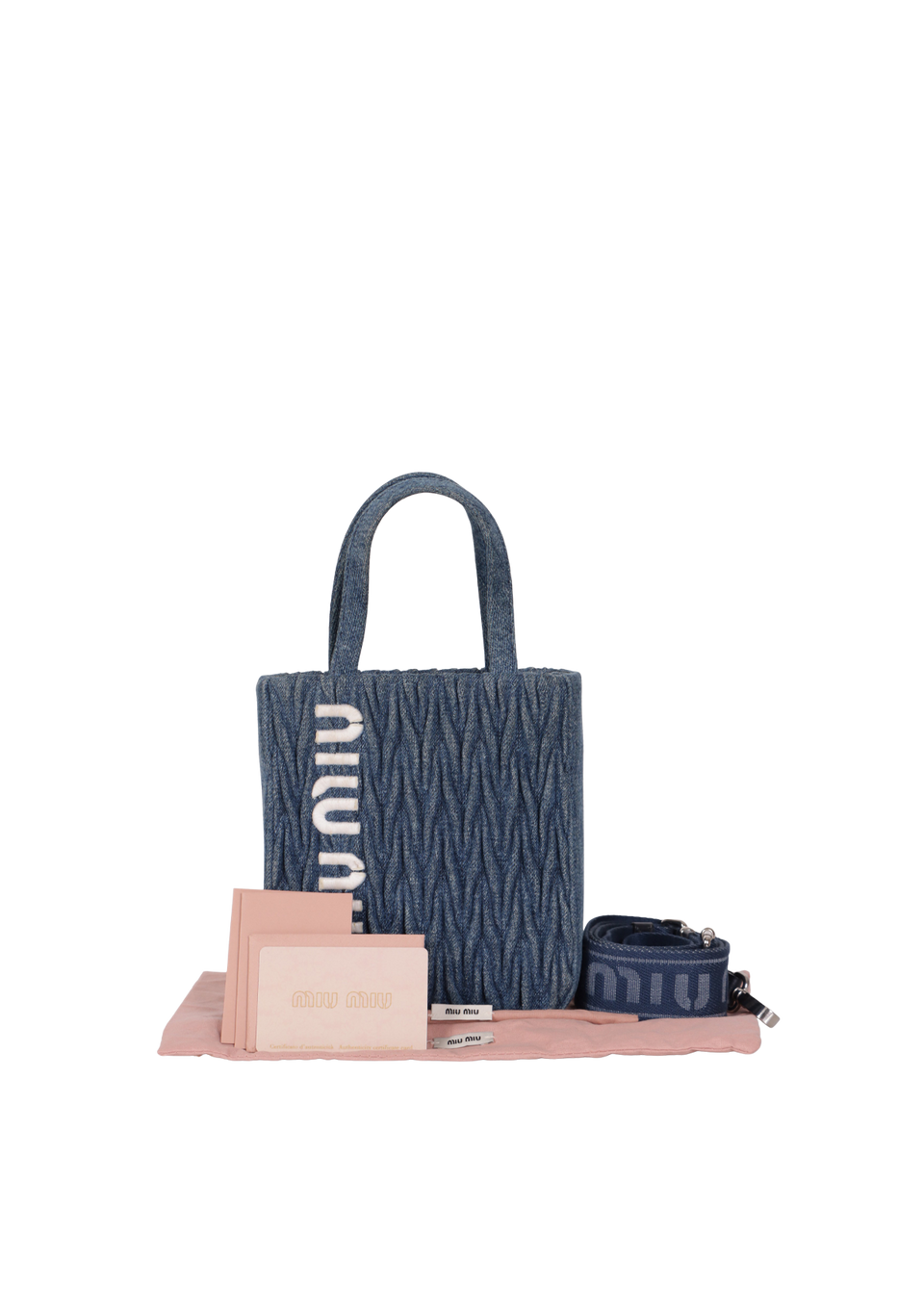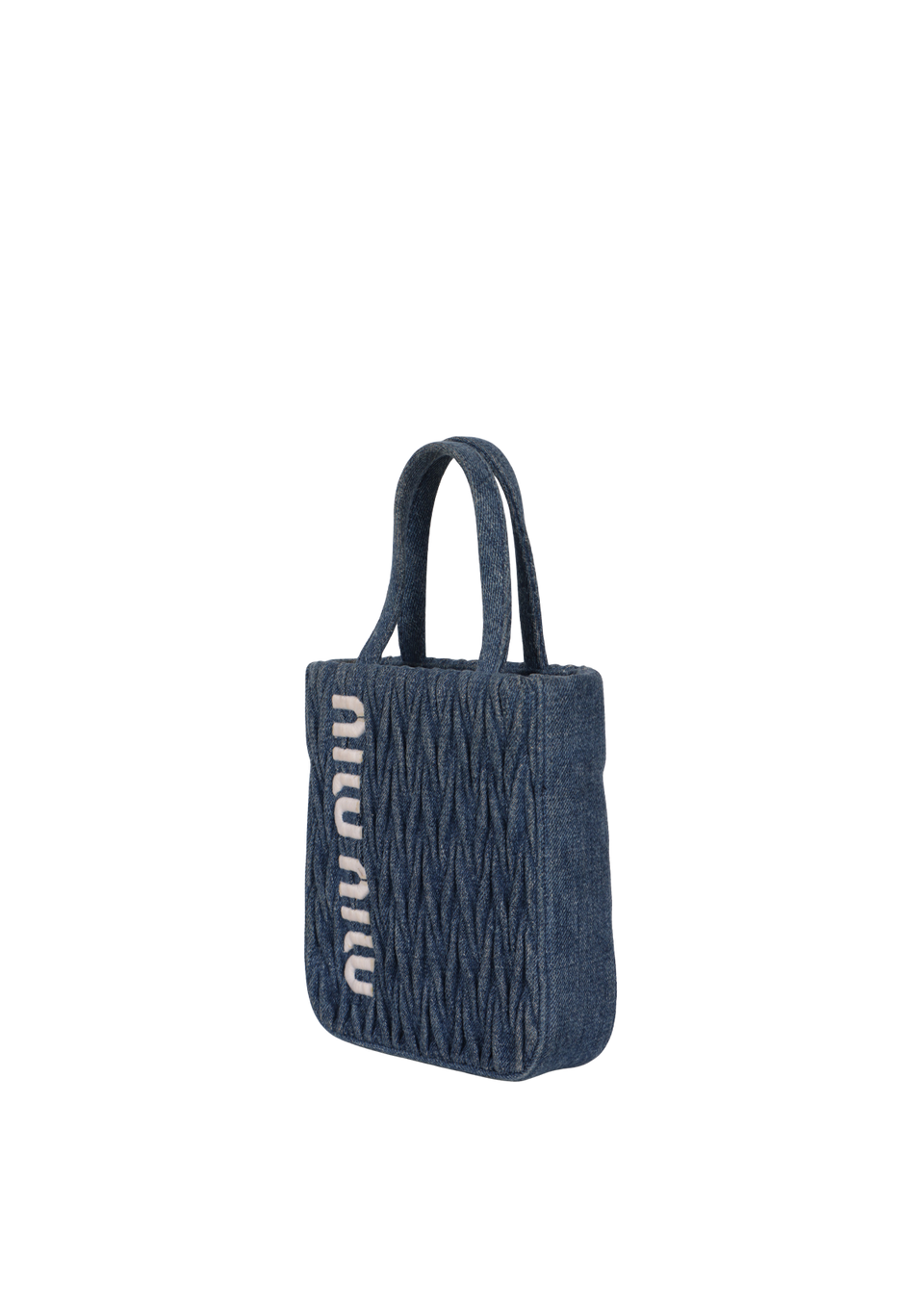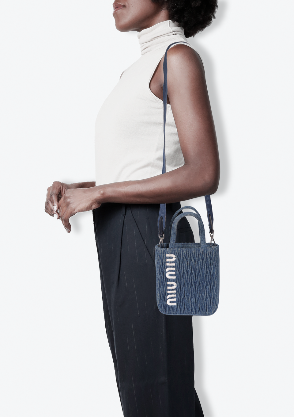Descrição do Material: Denim azul com detalhes em couro calfskin azul