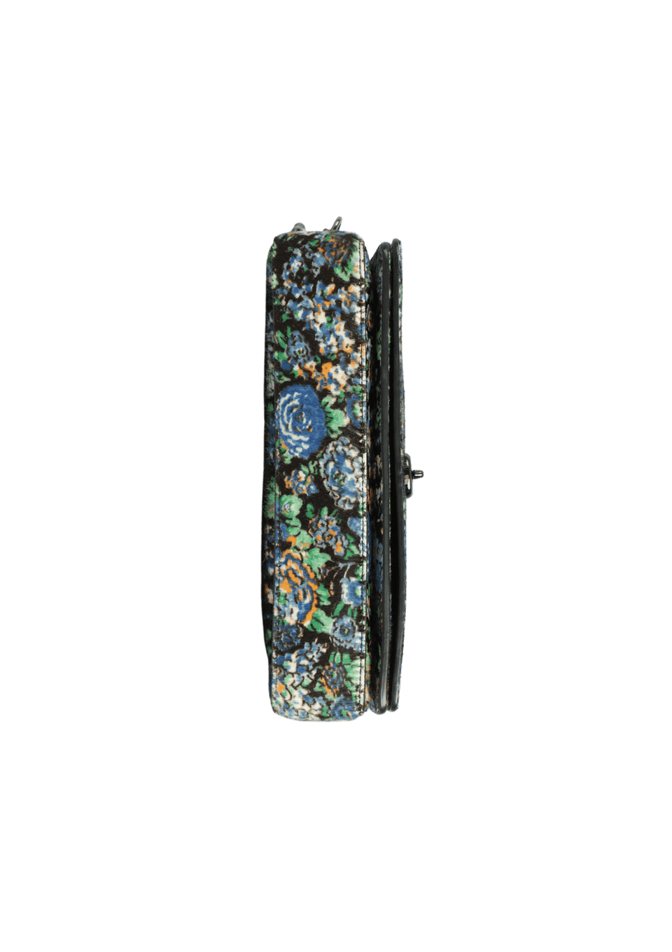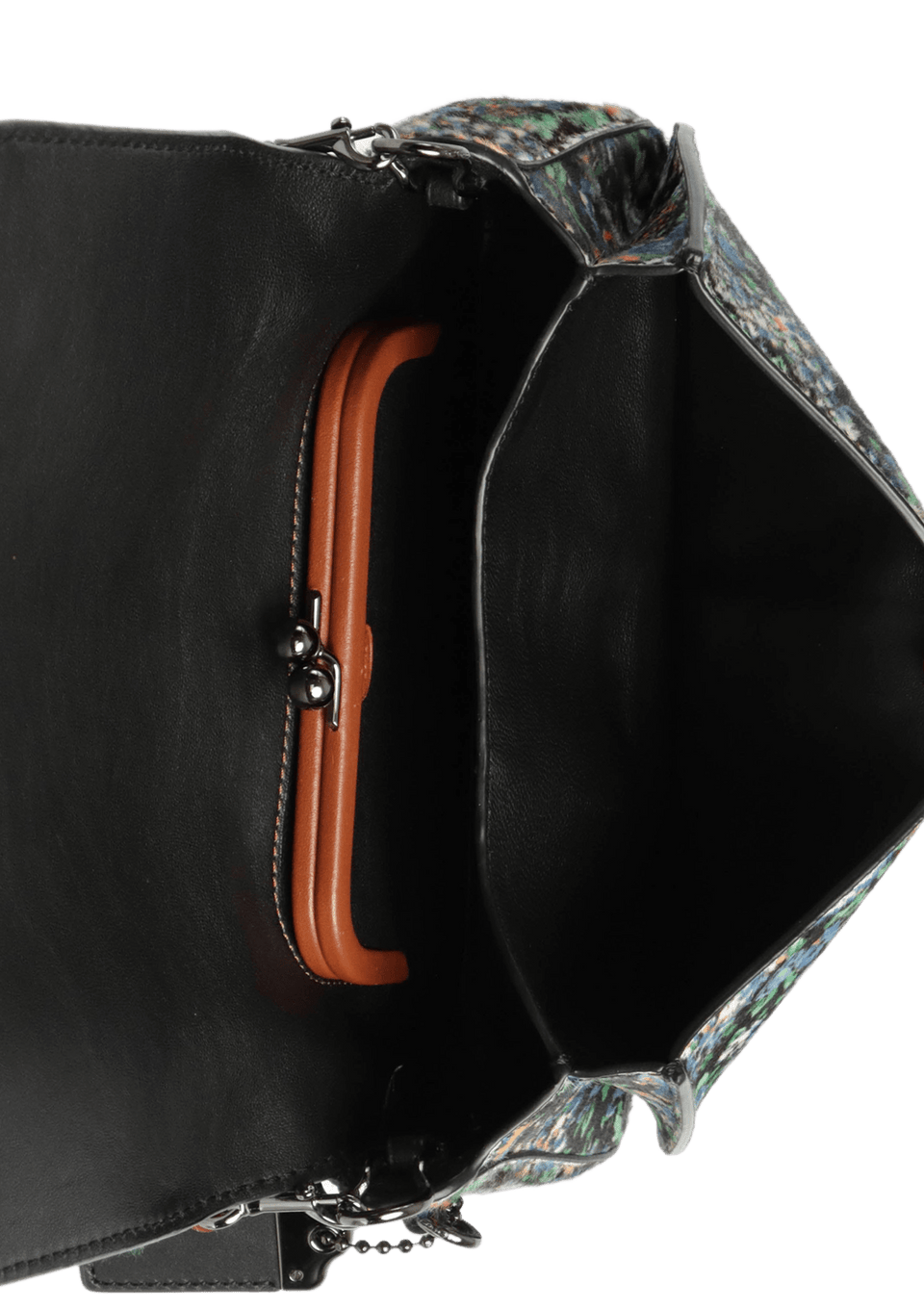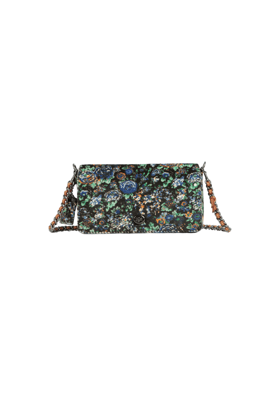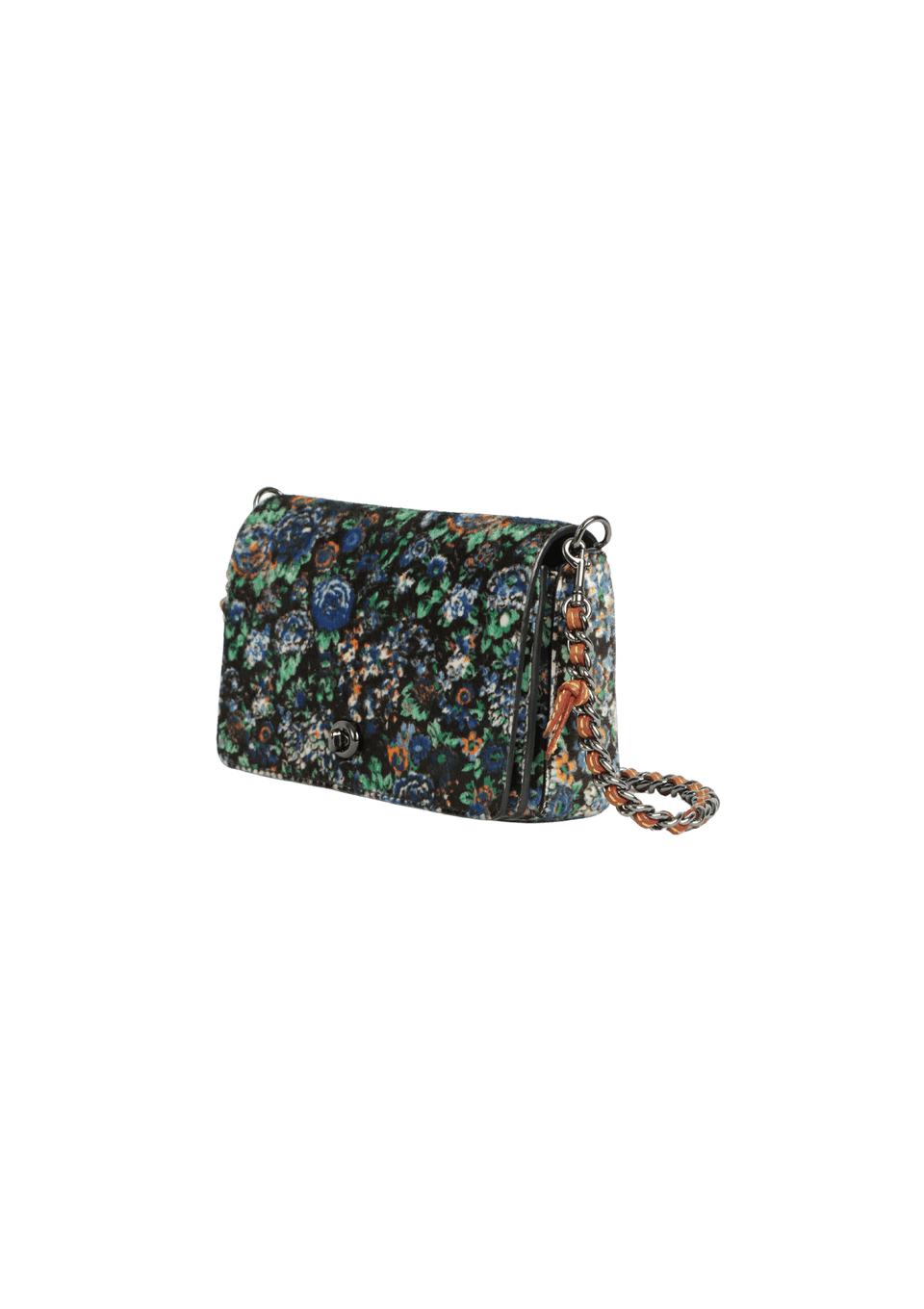 - Calf hair preto com estampa floral nas cores azul, verde, branco e laranja e couro caramelo na alça;