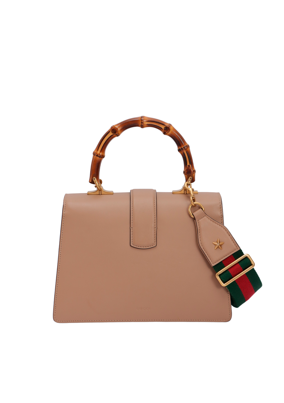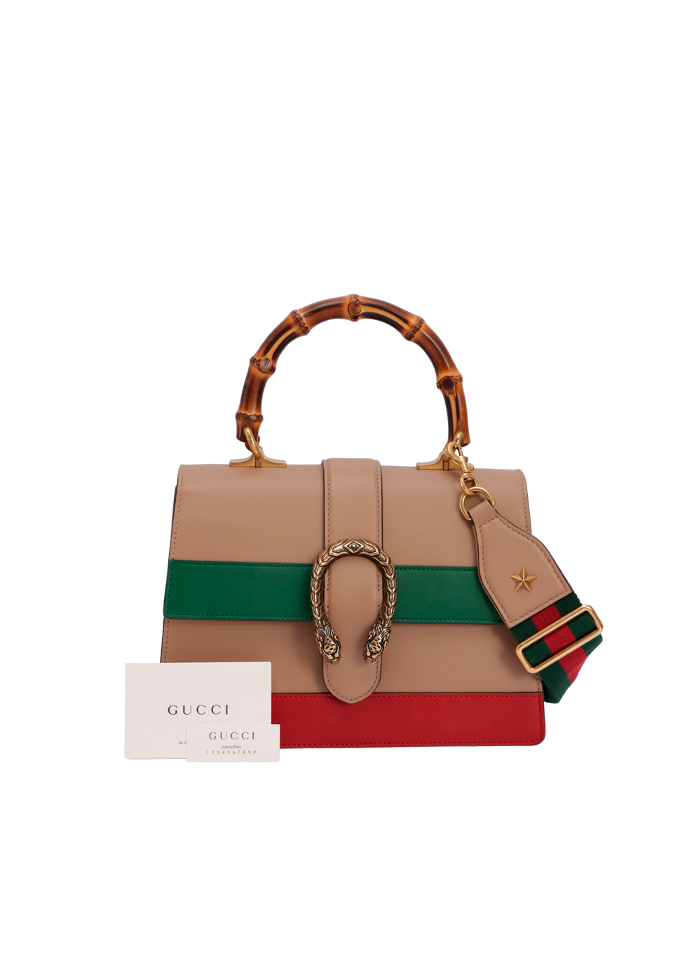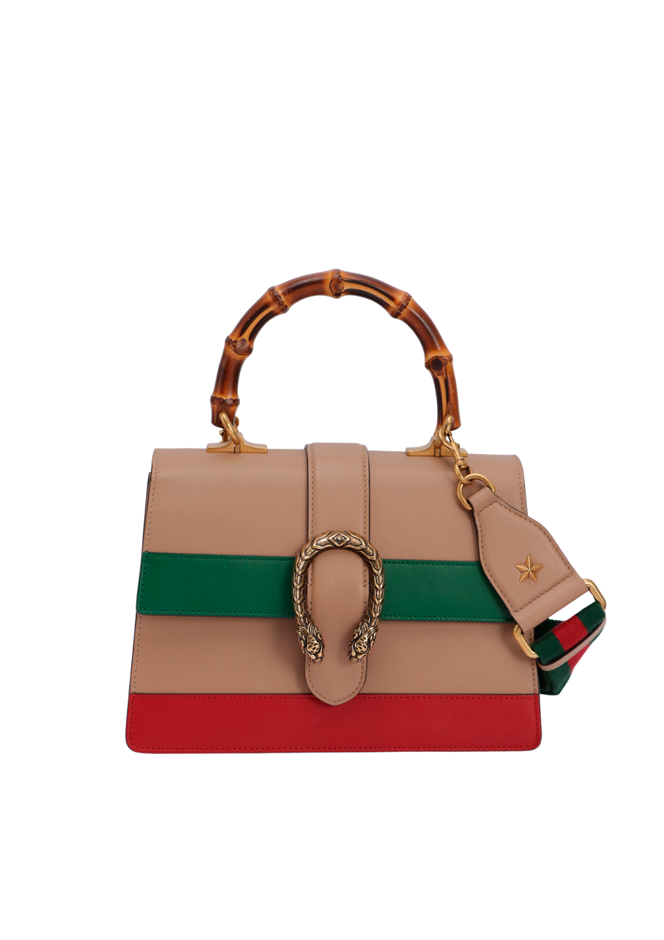 Descrição do Material: Couro calfskin bege com detalhes verde e vermelho e alça de bambu natural