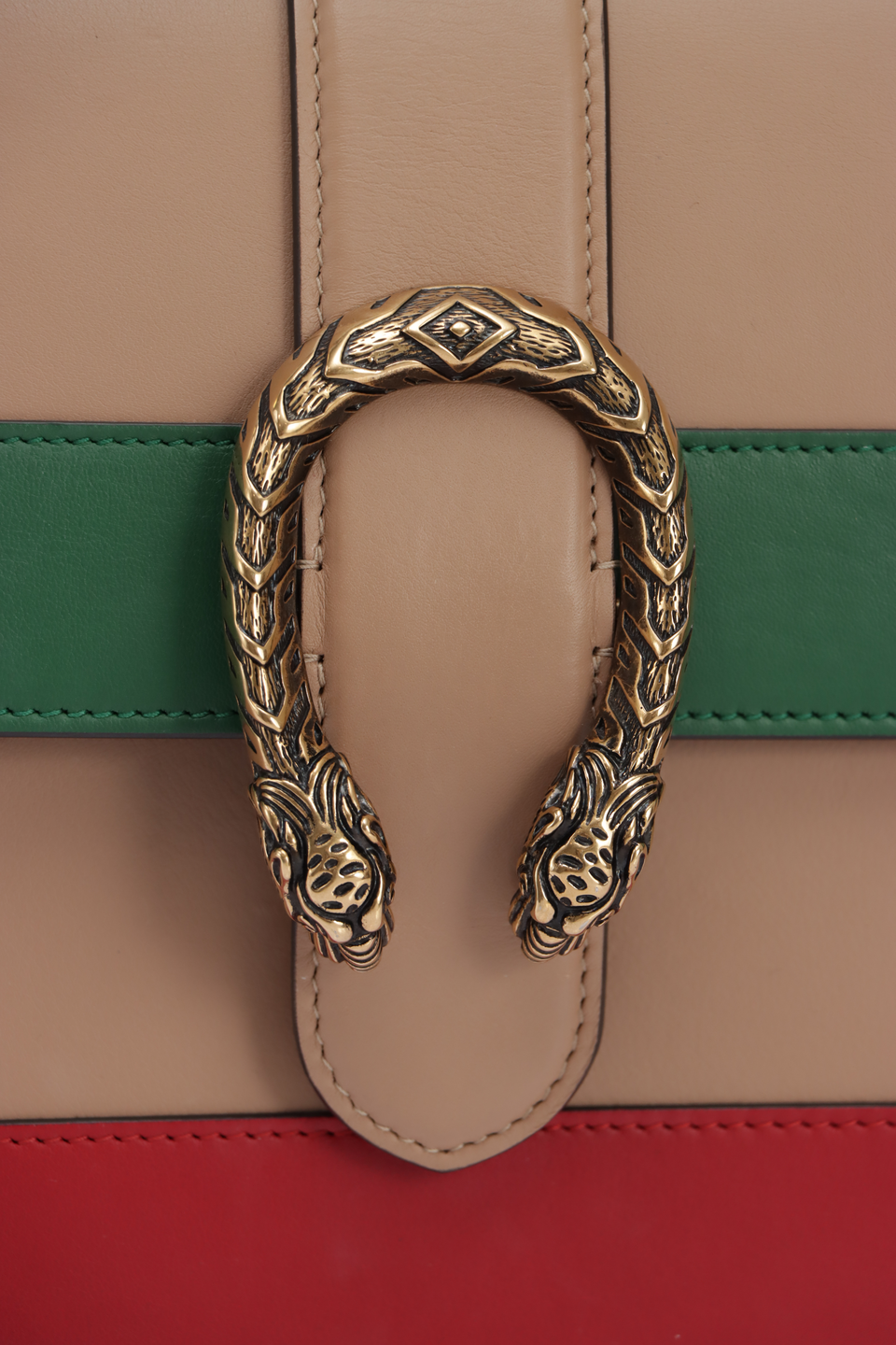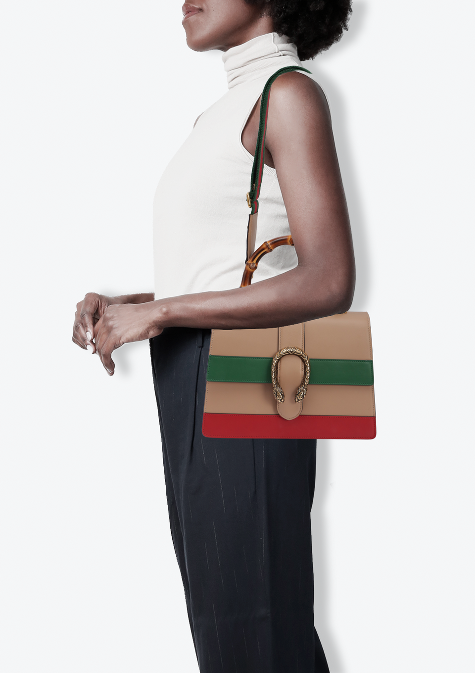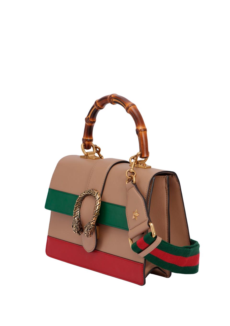 Descrição do Material: Couro calfskin bege com detalhes verde e vermelho e alça de bambu natural