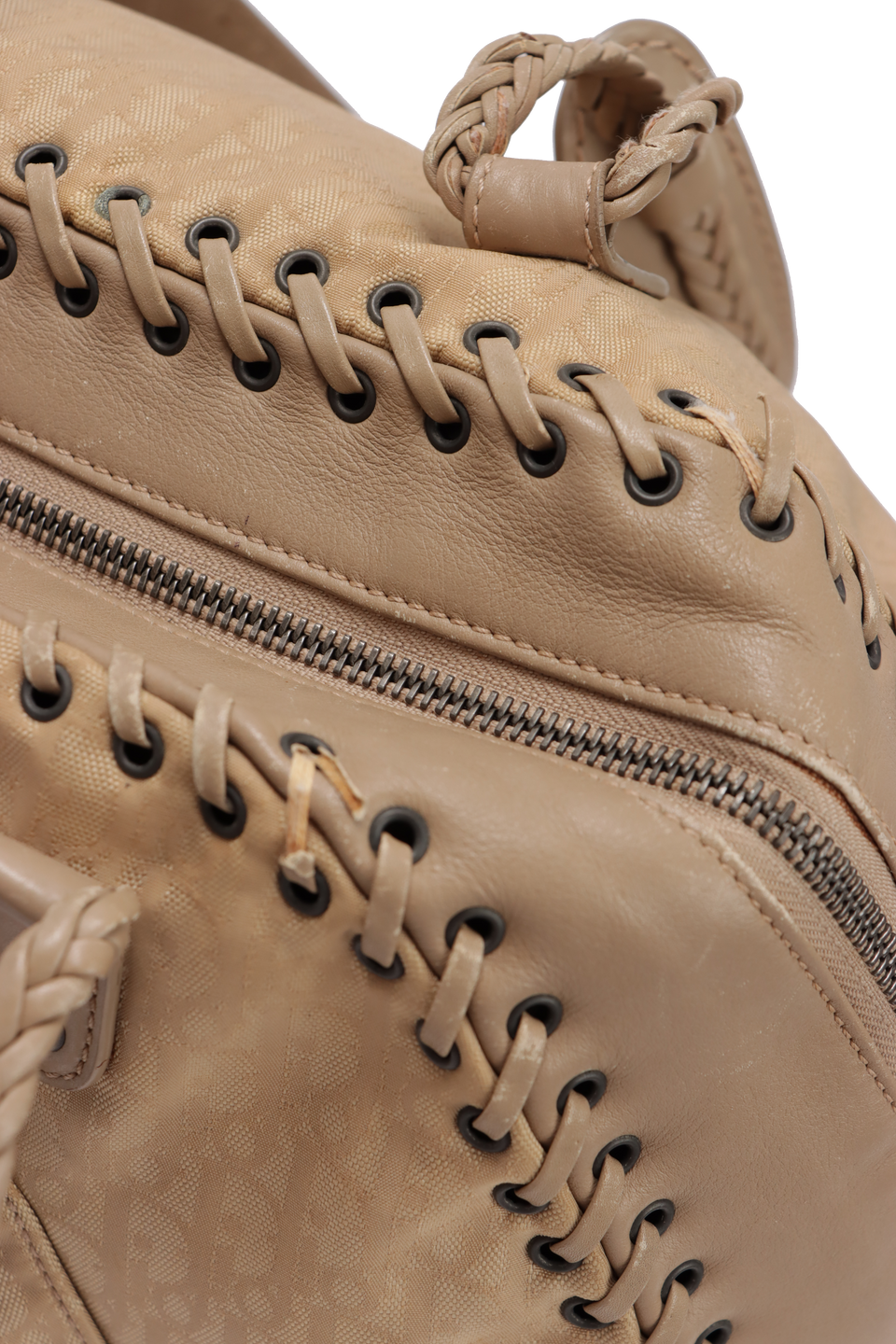 Regular. Apresenta severos rompimentos e desgastes nos acabamentos das tiras, especialmente nas extremidades superiores do lado direito, nas alças e nos cantos da base, notáveis deformidades pela estrutura, principalmente do lado esquerdo inferior, severas marcas de uso e desgastes nos detalhe em couro da aba do bolso frontal, nas laterais, parte superior e alças, consideráveis manchas de uso no canvas, especialmente na parte inferior frontal e do lado direito de trás, notáveis descolorações e marcas de uso nas ferragens, couro levemente ressecado e pequenas marcas e manchas de uso pelo forro.