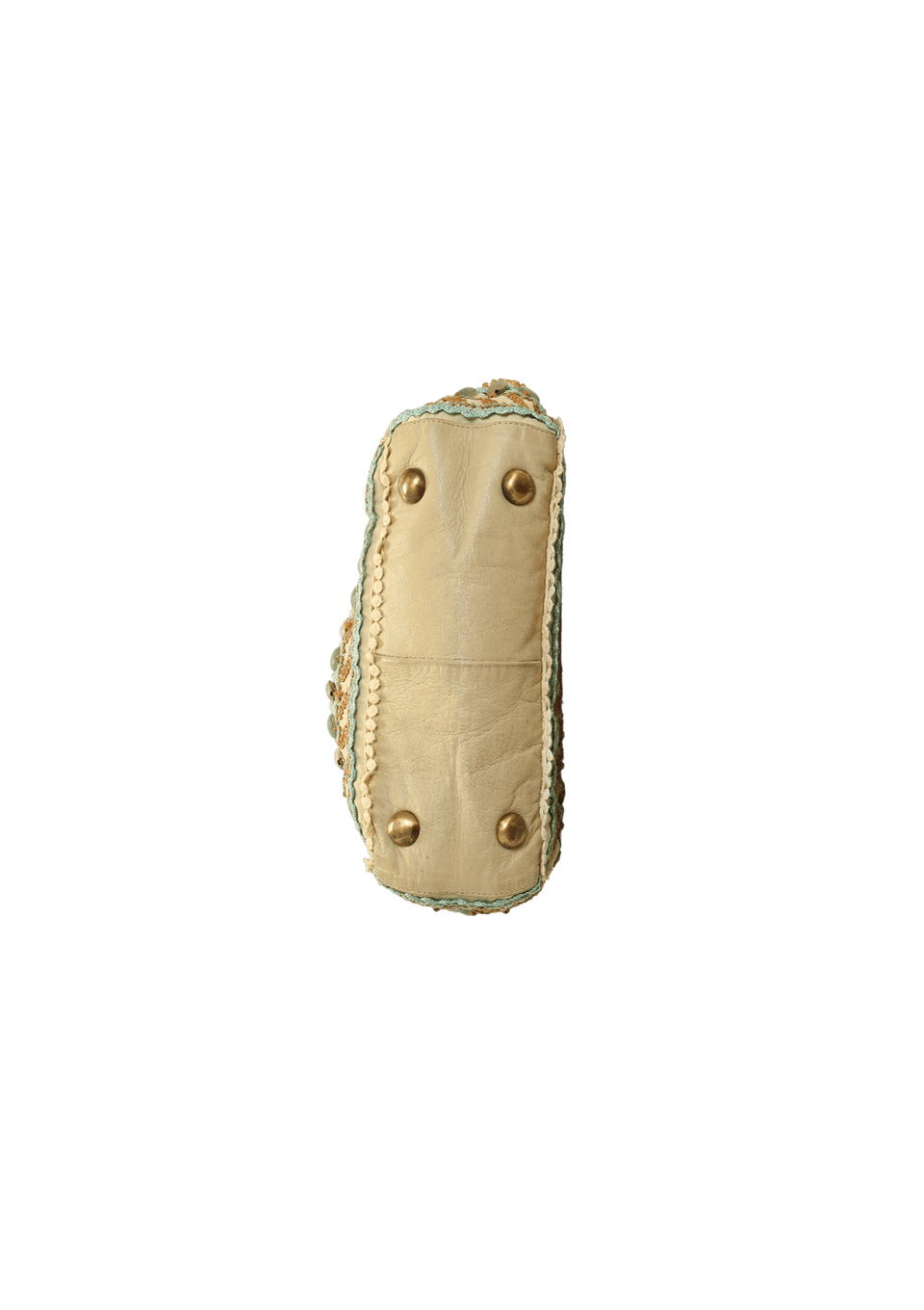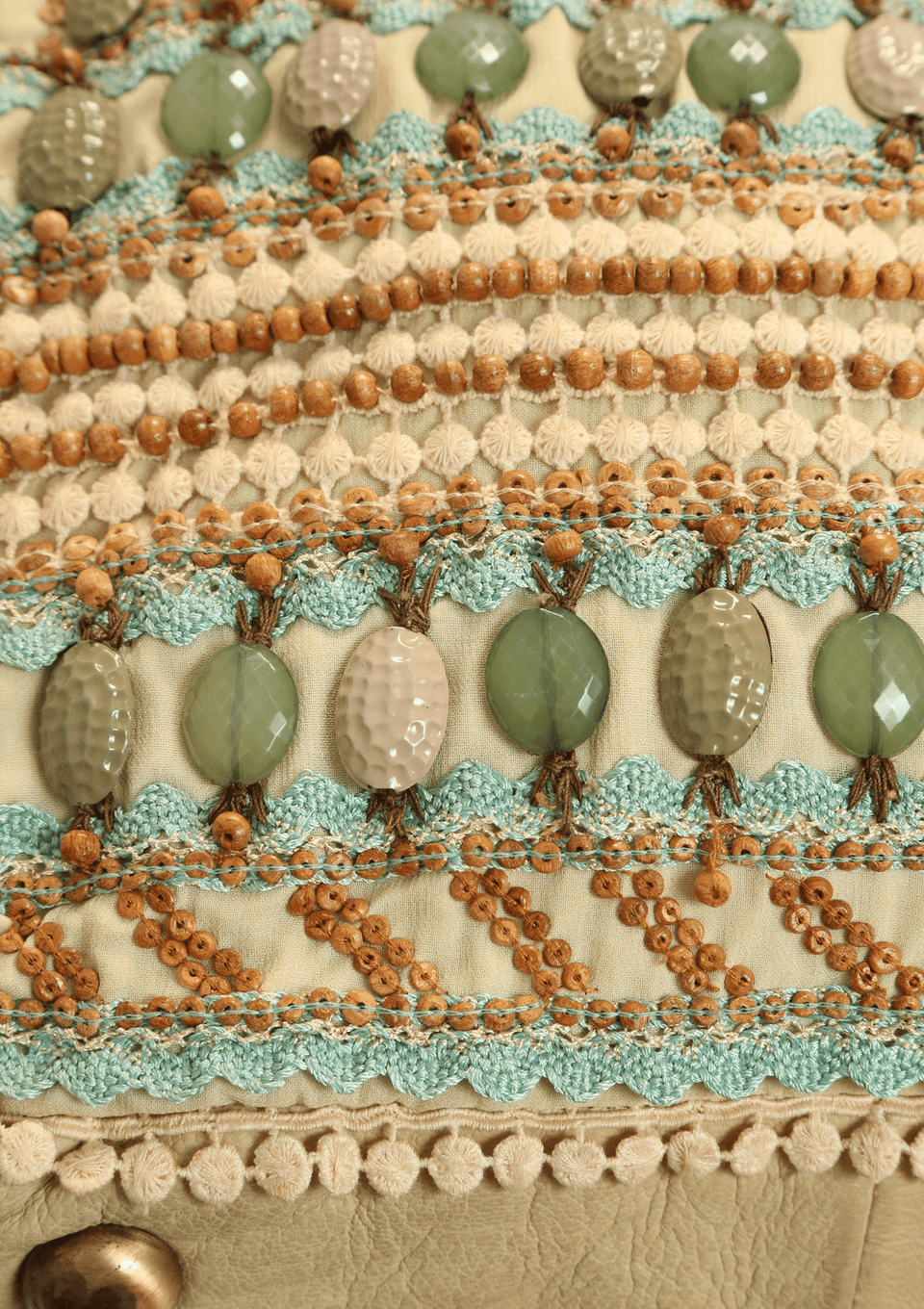 - Algodão bordado e couro bege;