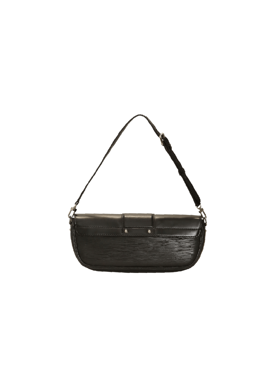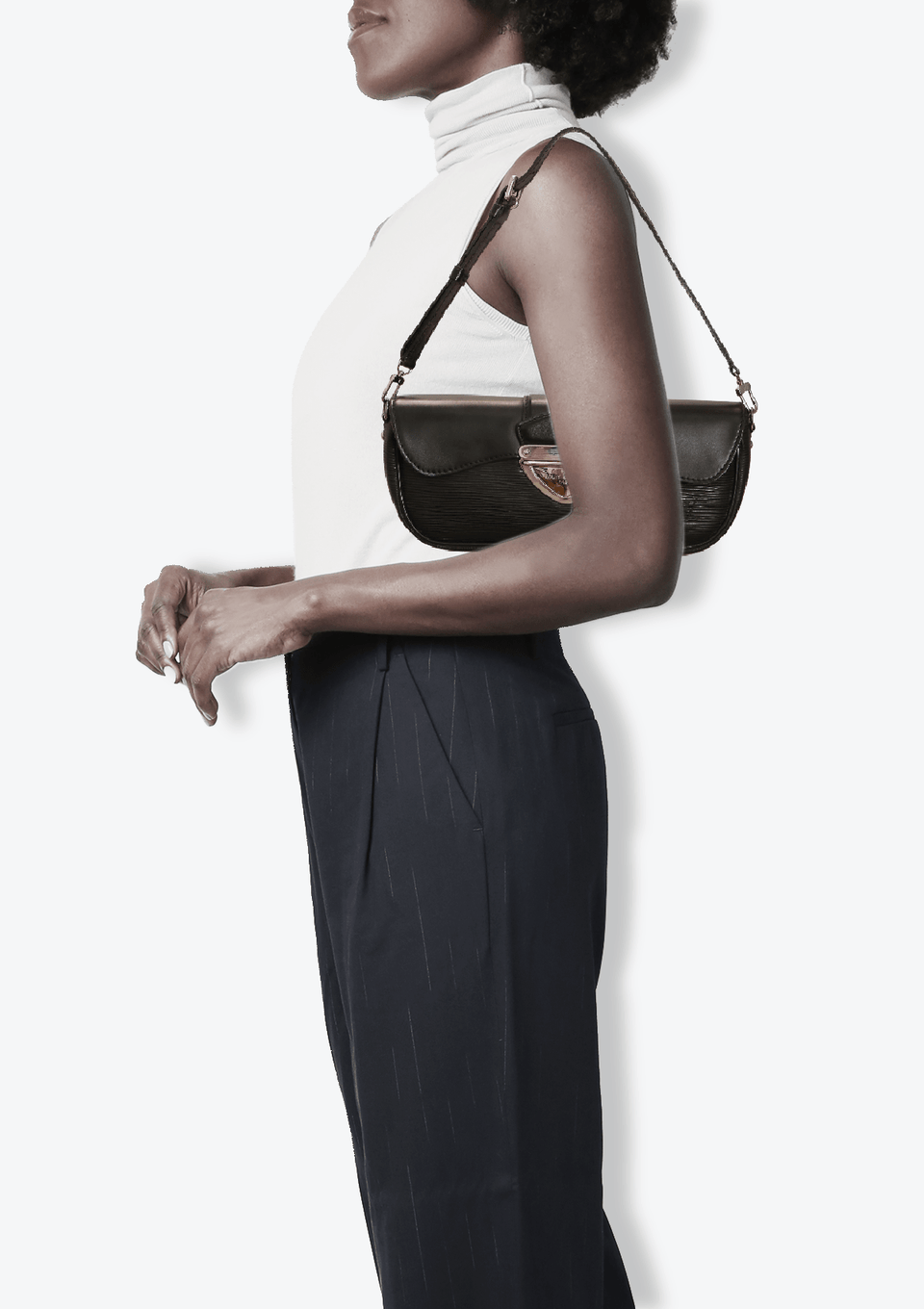 Condição: Muito bom, com aparência de seminovo. Apresenta leve descoloração nas argolas laterais, mínimas marcas no couro e riscos nas ferragens.