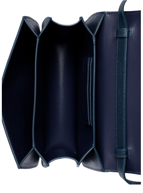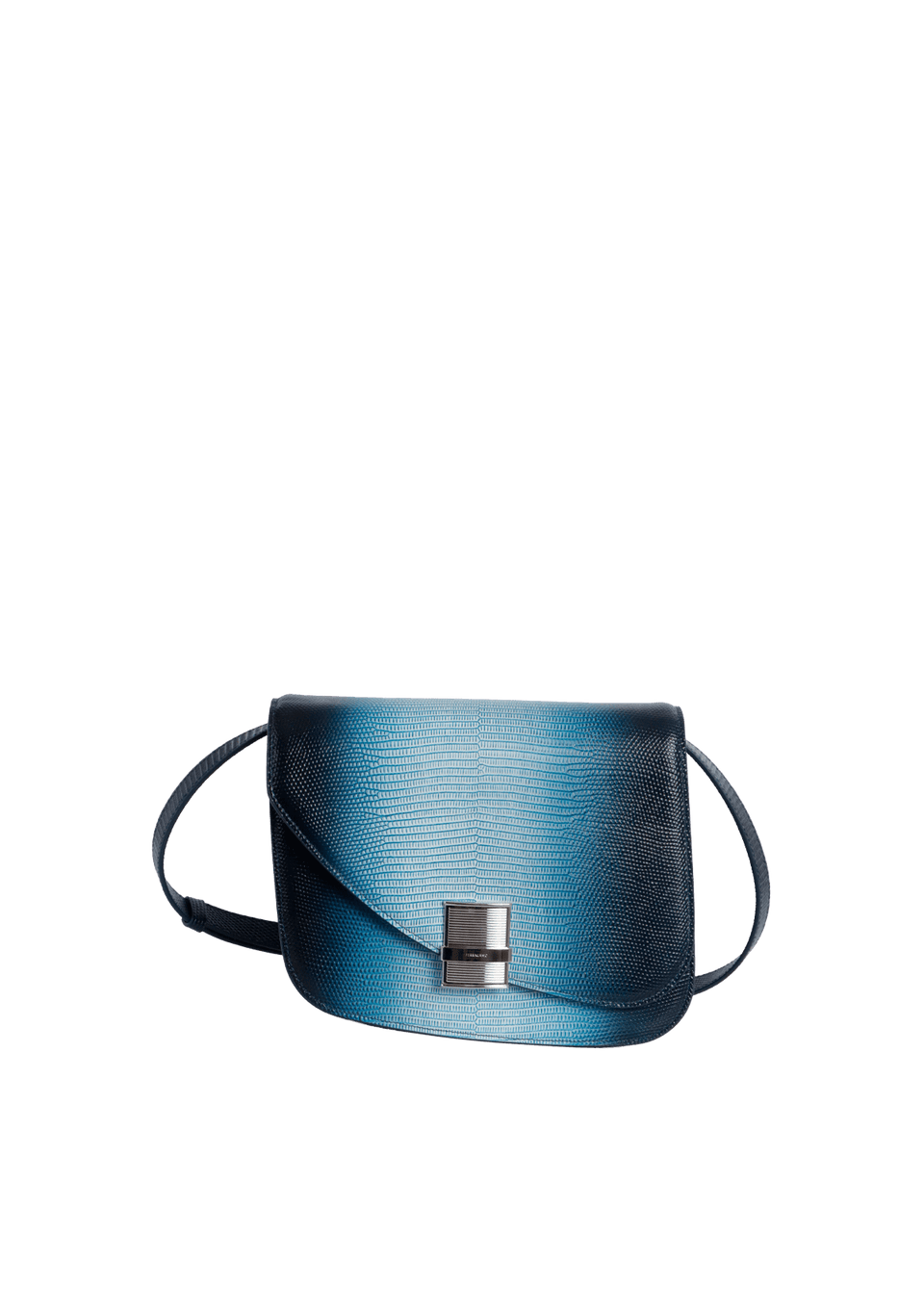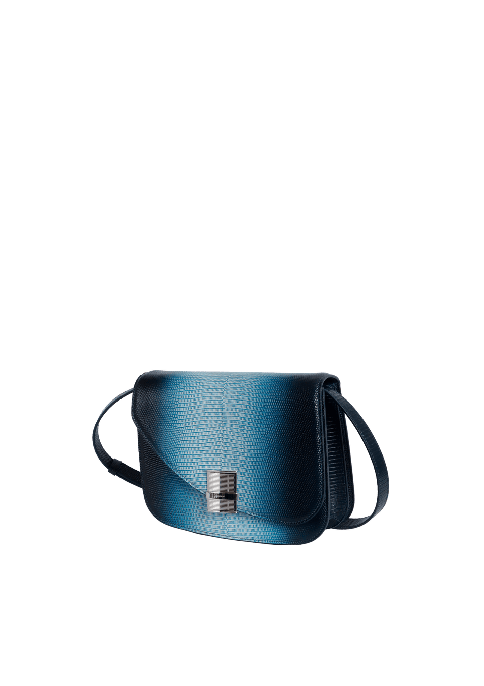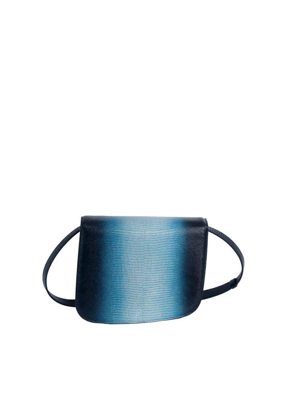 - Couro calfskin em tons de azul com acabamento Embossed com efeito de pele de lagarto;