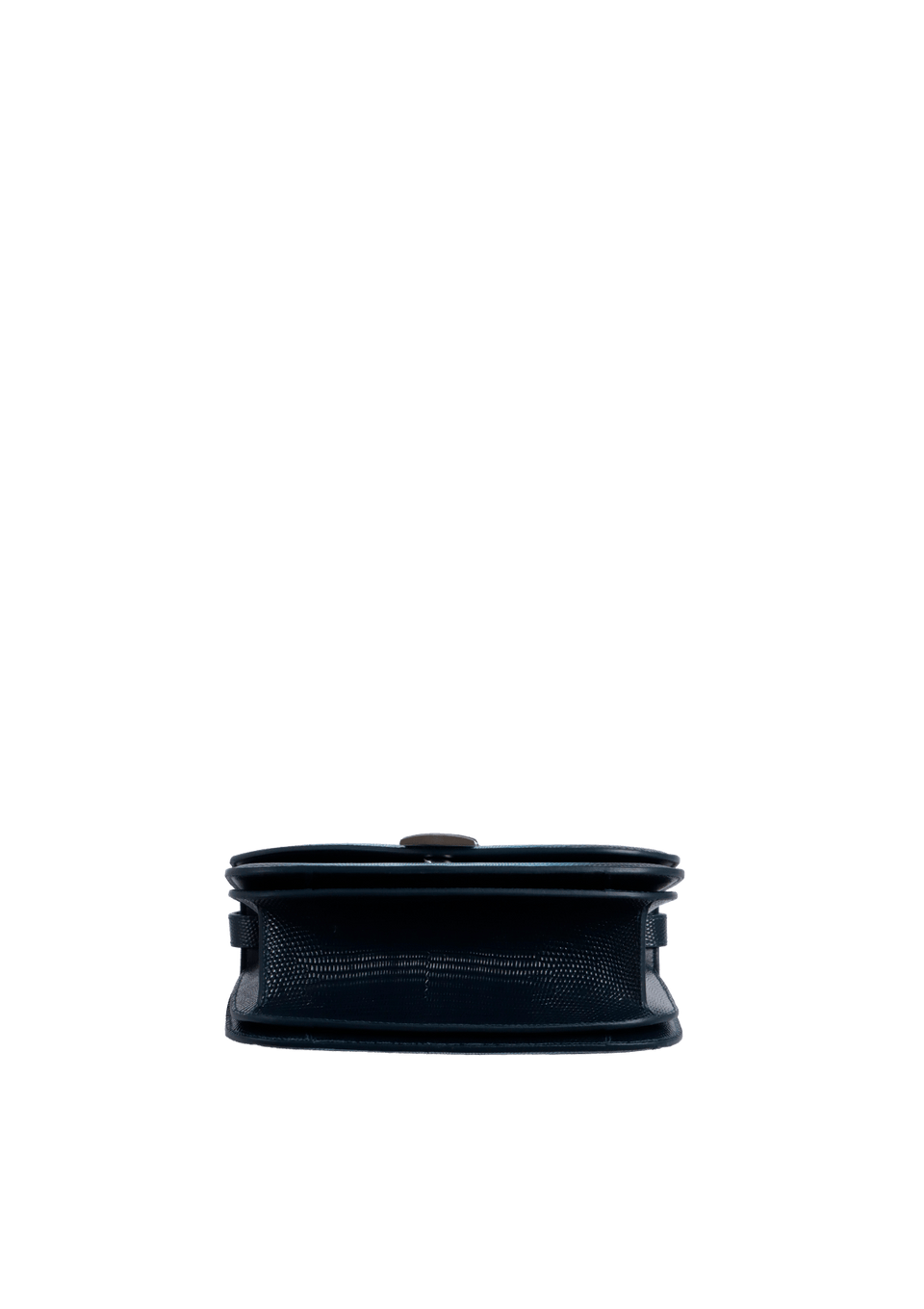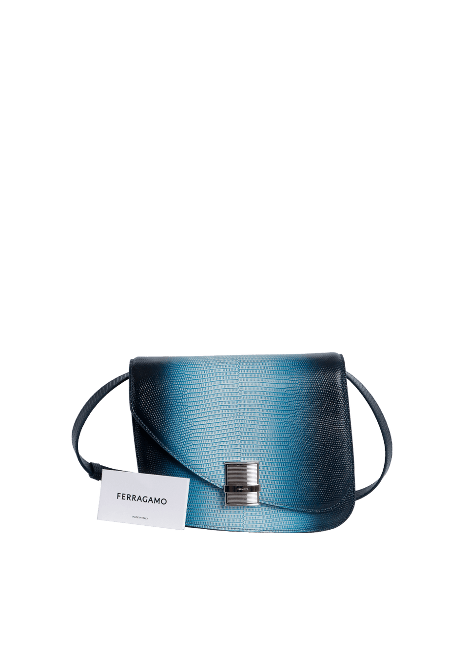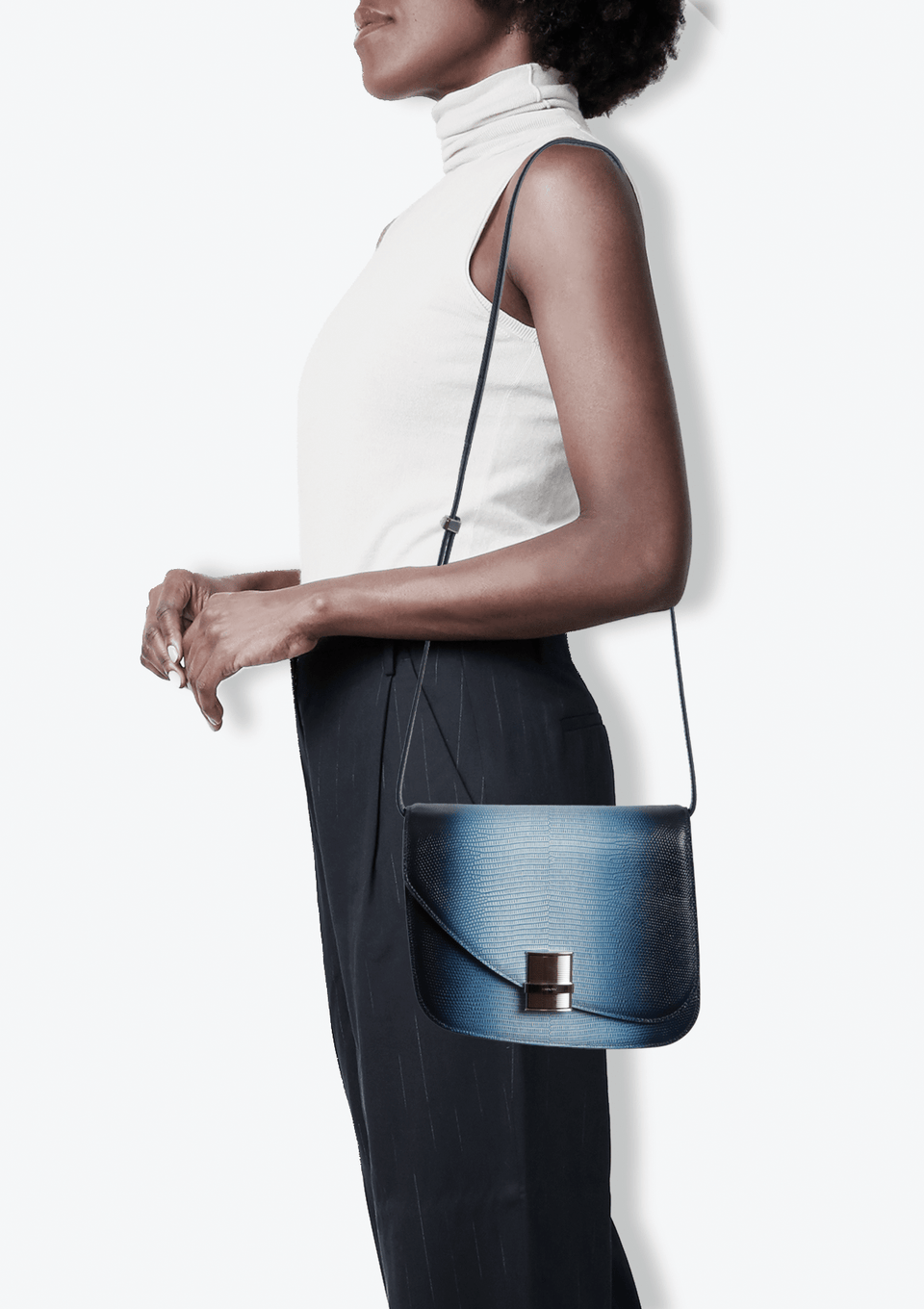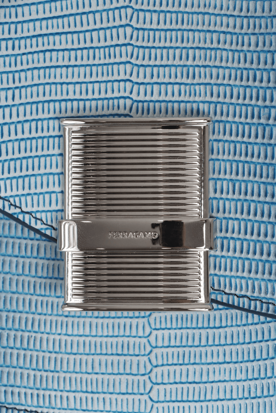 - Couro calfskin em tons de azul com acabamento Embossed com efeito de pele de lagarto;