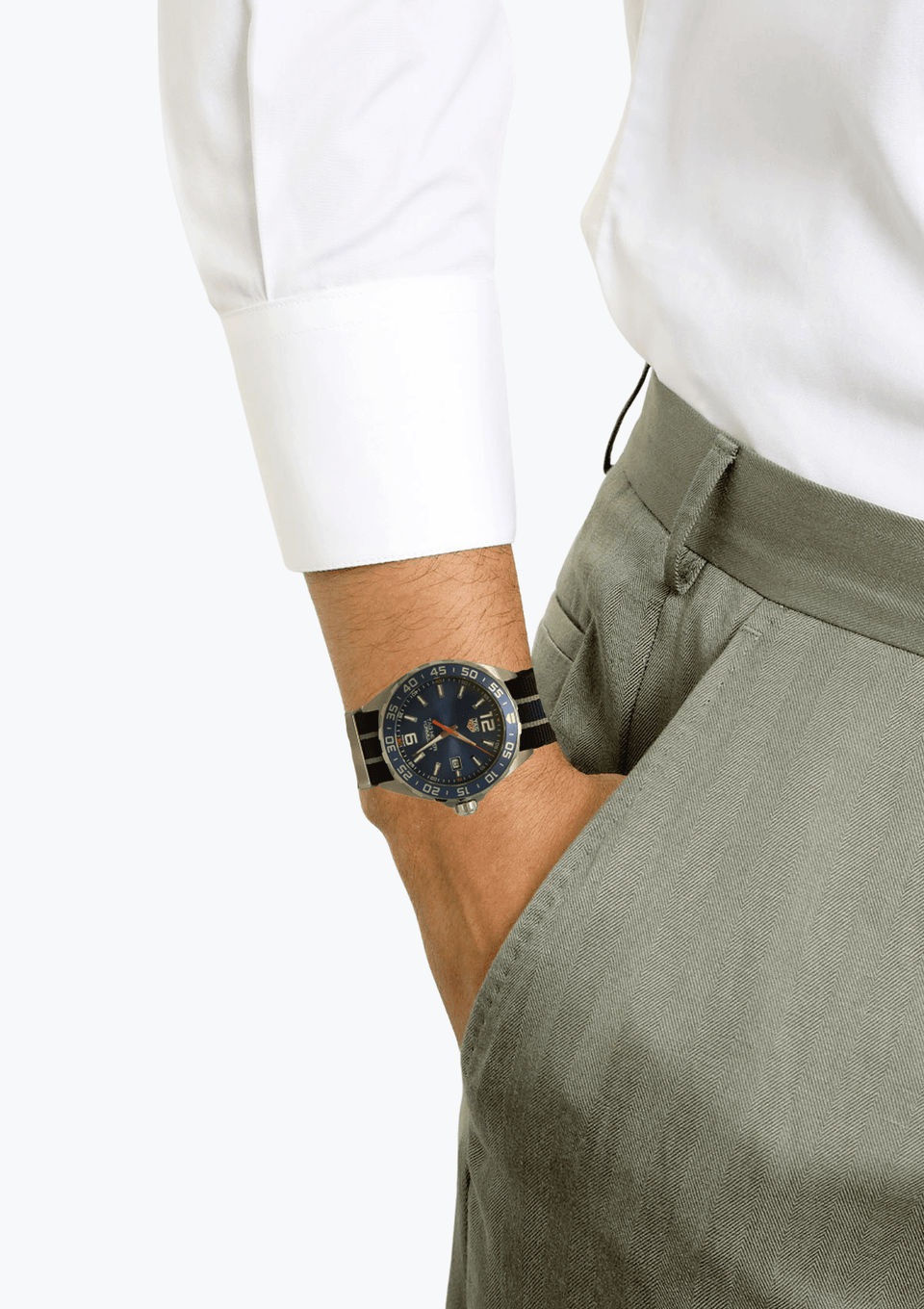 • Vidro de safira, caixa de aço inoxidável escovado e alumínio;