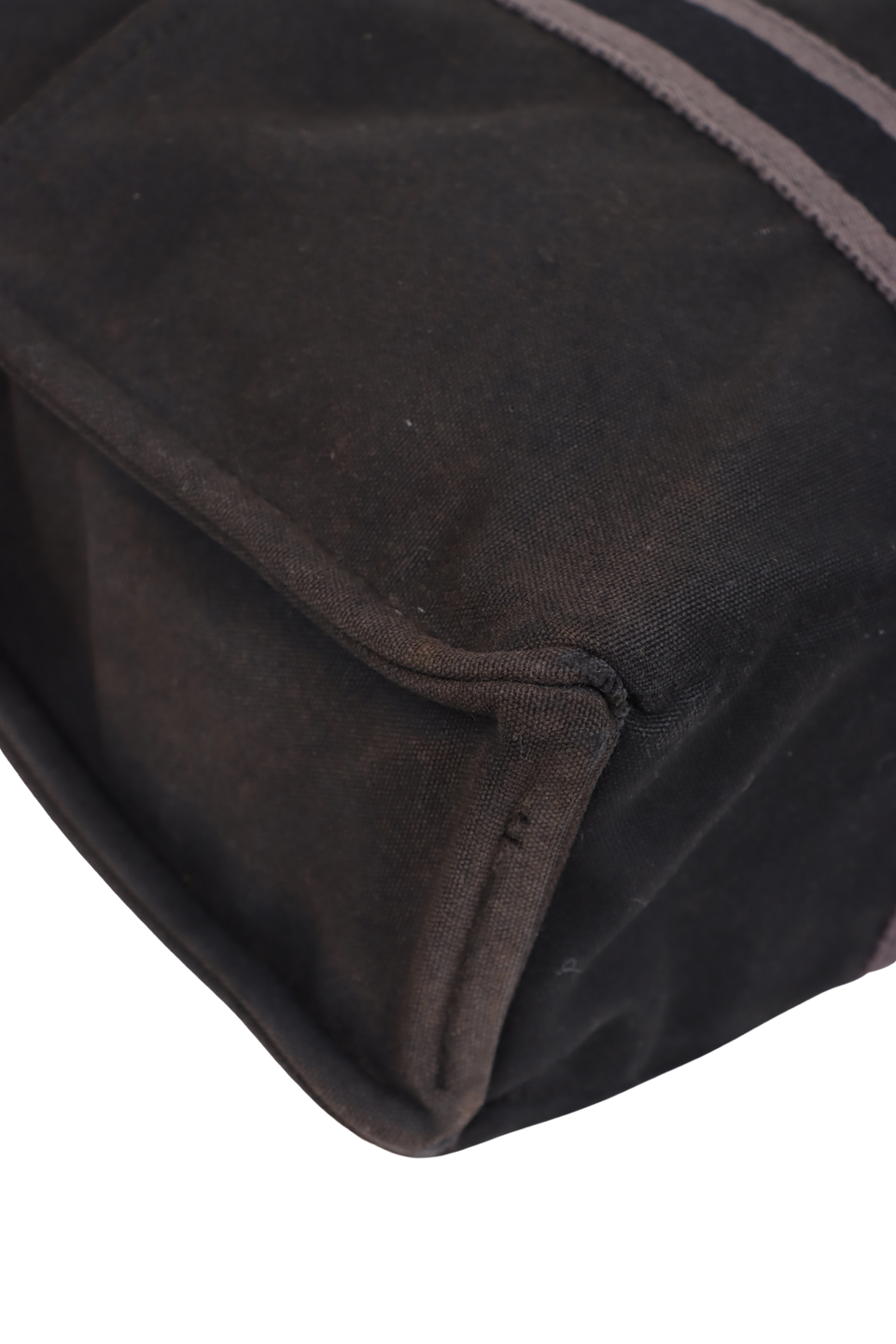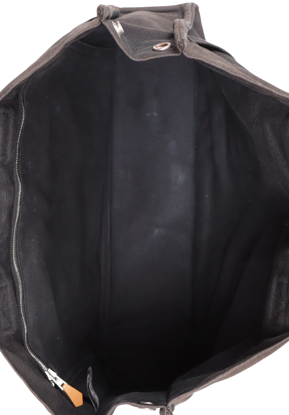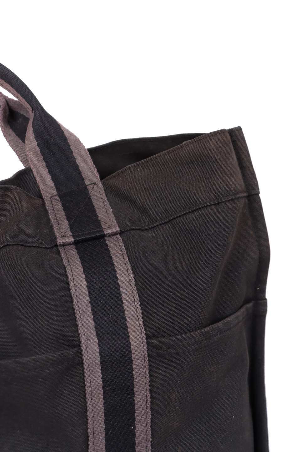 Regular. Apresenta notável deformaçāo na estrutura da peça, especialmente nas laterais inferiores e parte central superior, severos desgastes, manchas de uso e de desbotamento por todo o canvas, consideráveis puídos e pelos de contato pela parte externa, principalmente nas faixas centrais e notáveis marcas de uso pelas ferragens.