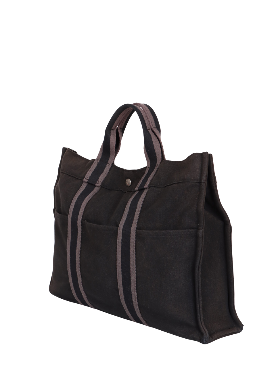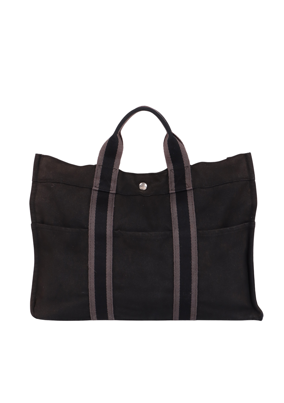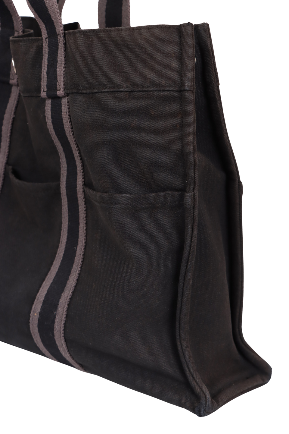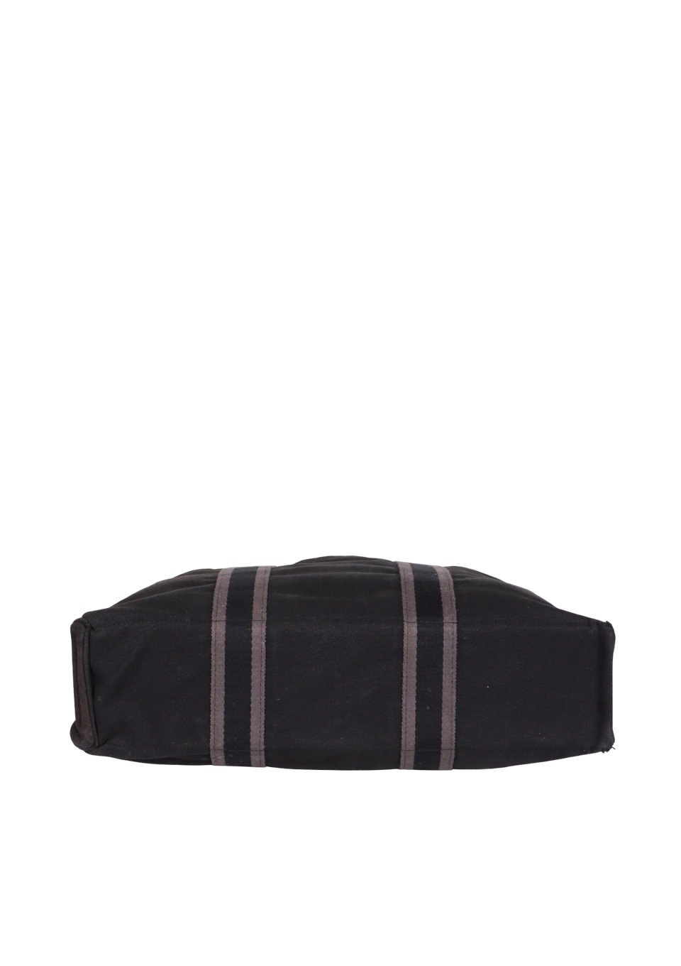 Regular. Apresenta notável deformaçāo na estrutura da peça, especialmente nas laterais inferiores e parte central superior, severos desgastes, manchas de uso e de desbotamento por todo o canvas, consideráveis puídos e pelos de contato pela parte externa, principalmente nas faixas centrais e notáveis marcas de uso pelas ferragens.