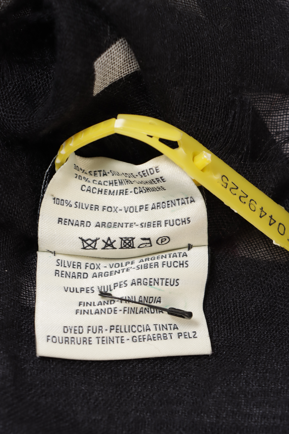 Descrição do Material: Tecido Cashmere preto estampado com aplicações de pele de raposa prateada