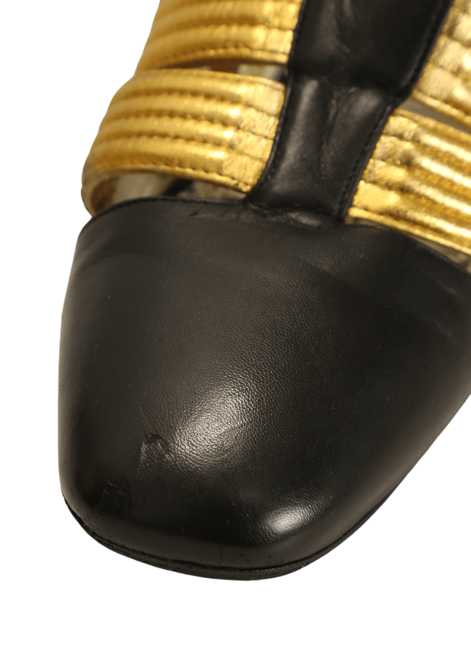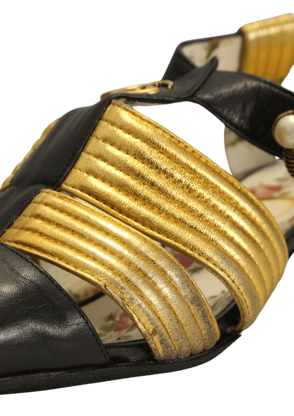 Condição: Regular. Apresenta desgastes e descamação nas tiras de couro do fecho, desgastes e fissuras (dobras) pelo couro da parte externa, aplicação de antiderrapantes nas solas, manchas e desgastes nas solas e palmilhas, oxidações nas ferragens, desgastes nas decorações de pérolas e marcas de atrito nos saltos.