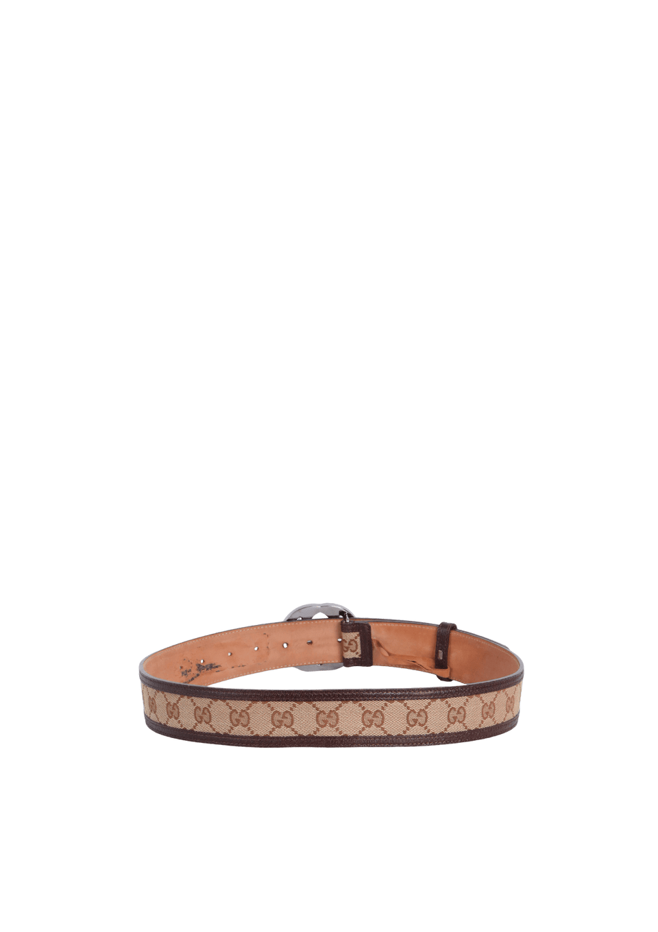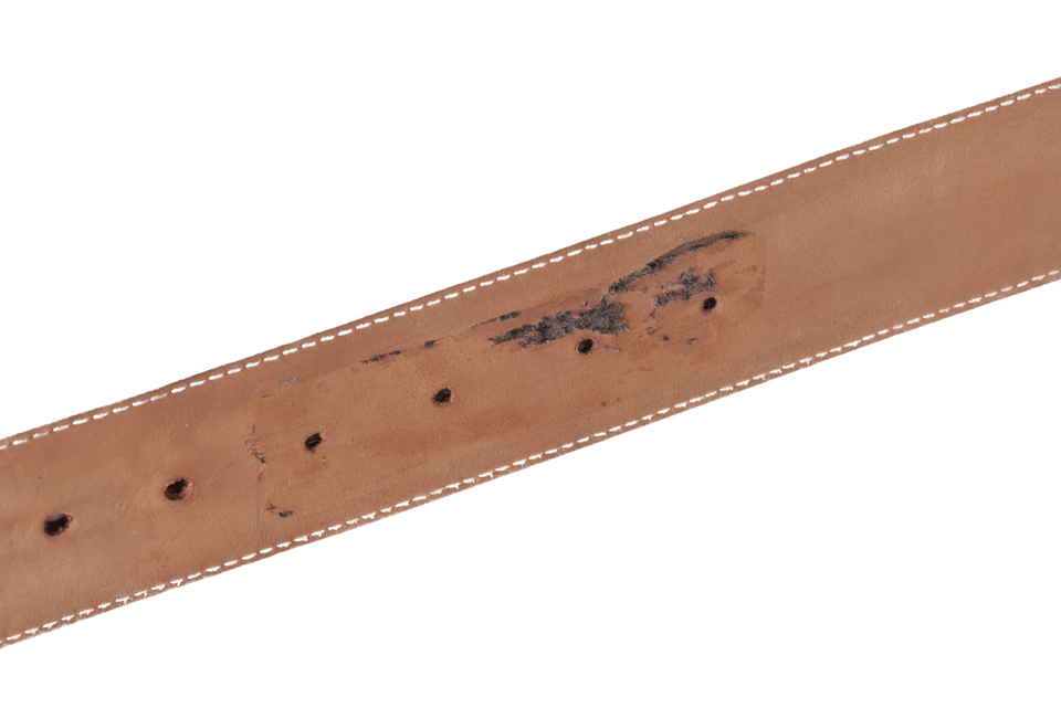 Condição: Regular. Apresenta notável perda do formato original do cinto, severos desgastes e manchas escurecidas por toda a parte interna do couro, principalmente próximos aos furos de ajuste, notável deformação do passante, consideráveis desgastes na fivela e cinco pontos de ajuste não originais do modelo.