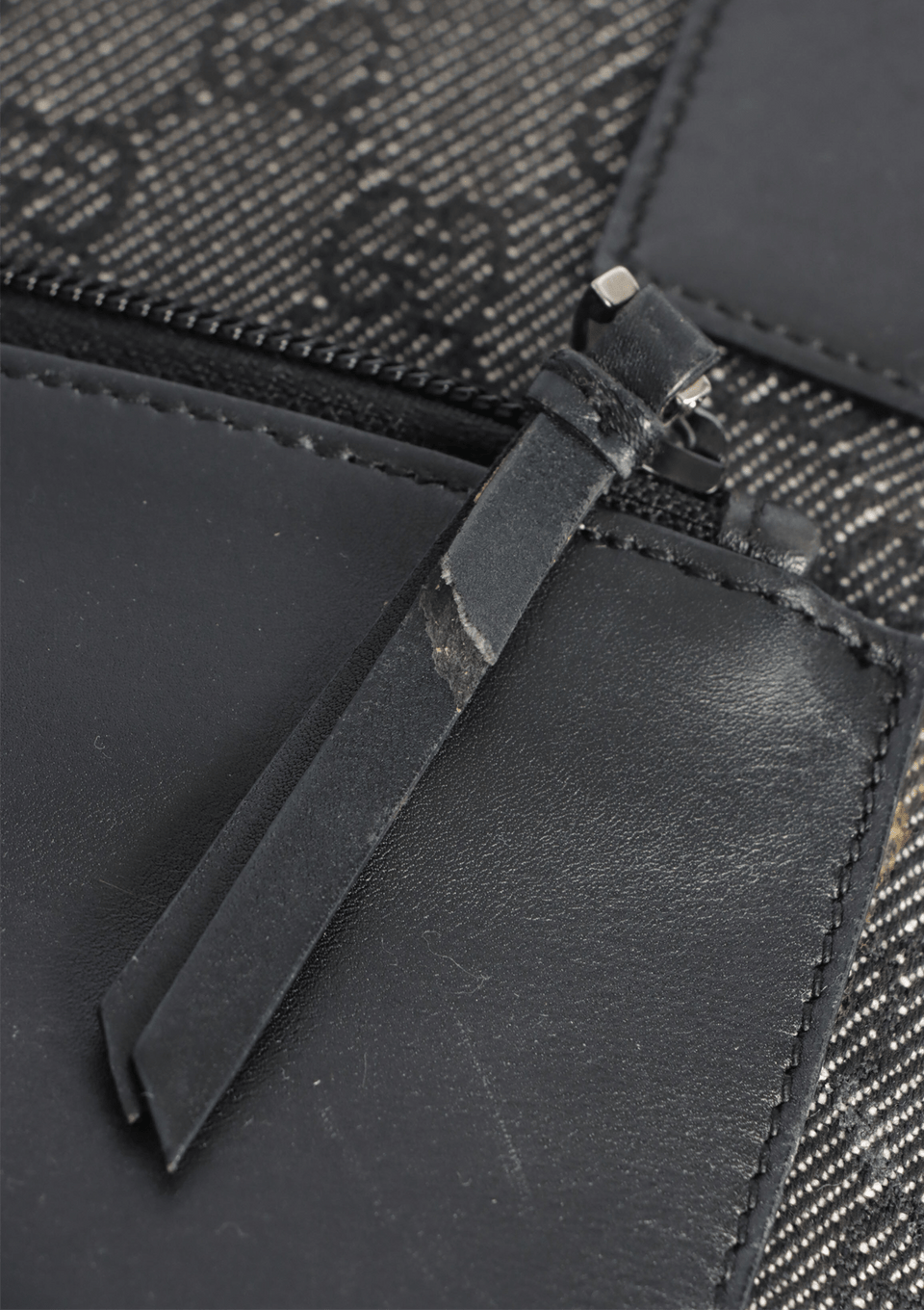 Condição: Regular. Apresenta severas aberturas nos cantos da base, principalmente do lado esquerdo, na parte da frente, severo rasgo na tira de couro do puxador do bolso frontal, leves marcas de uso pelo couro no bolso frontal e acabamento das alças, leve odor de item guardado e ausência do puxador do fechamento.