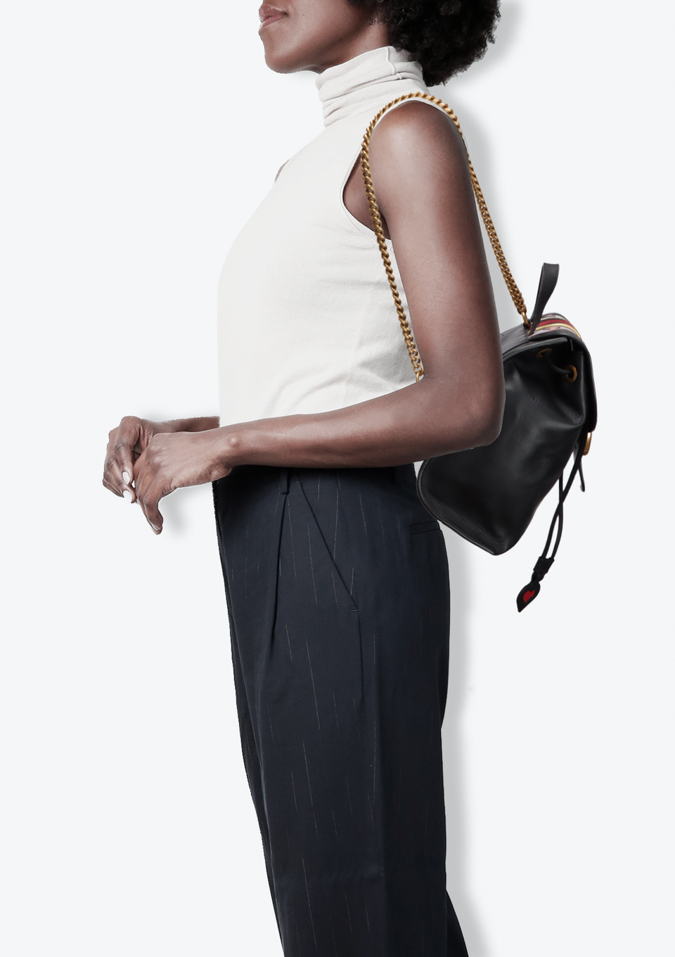 Descrição do Material: Couro calfskin preto com detalhes em azul, dourado, rosa, amarelo e faixa Web