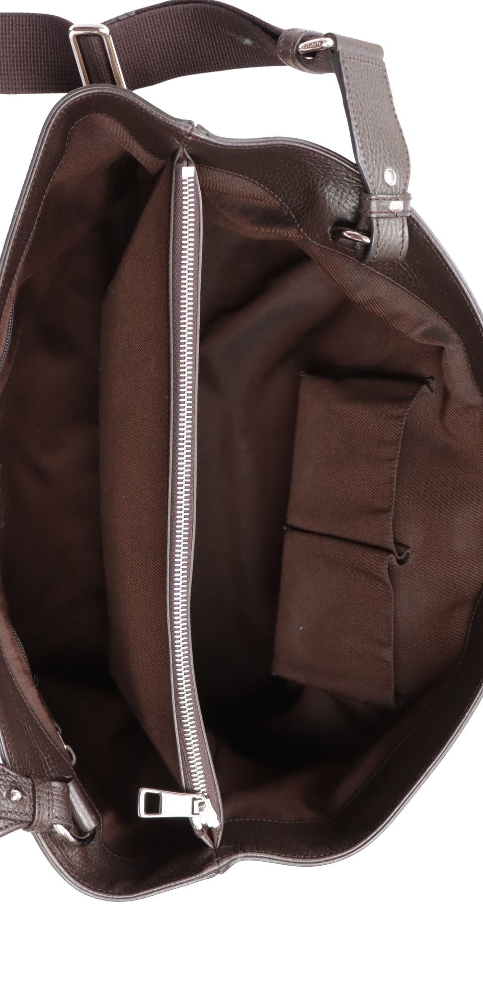Muito bom, com aparência de seminovo. Apresenta mínimas marcas de uso nas ferragens das alças e nos puxadores dos cursores internos, levíssimas fissuras nas selagens das partes inferiores das alças, mínimos puídos pelo tecido da alça de ombro e levíssimas manchas pelo forro, especialmente no compartimento frontal.