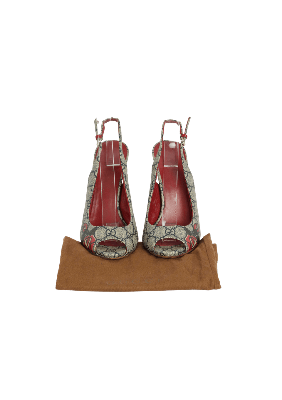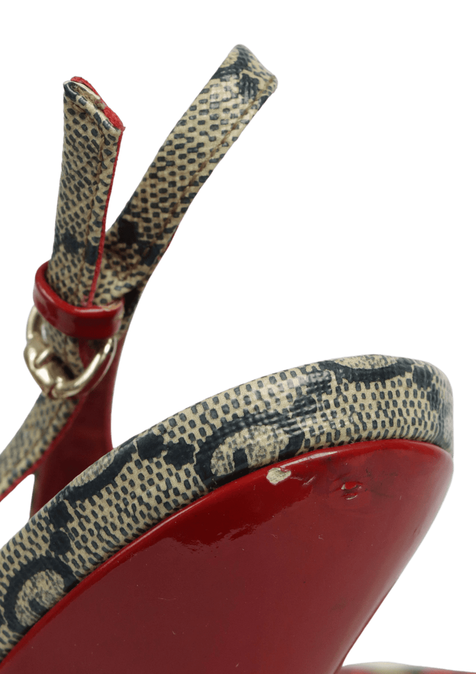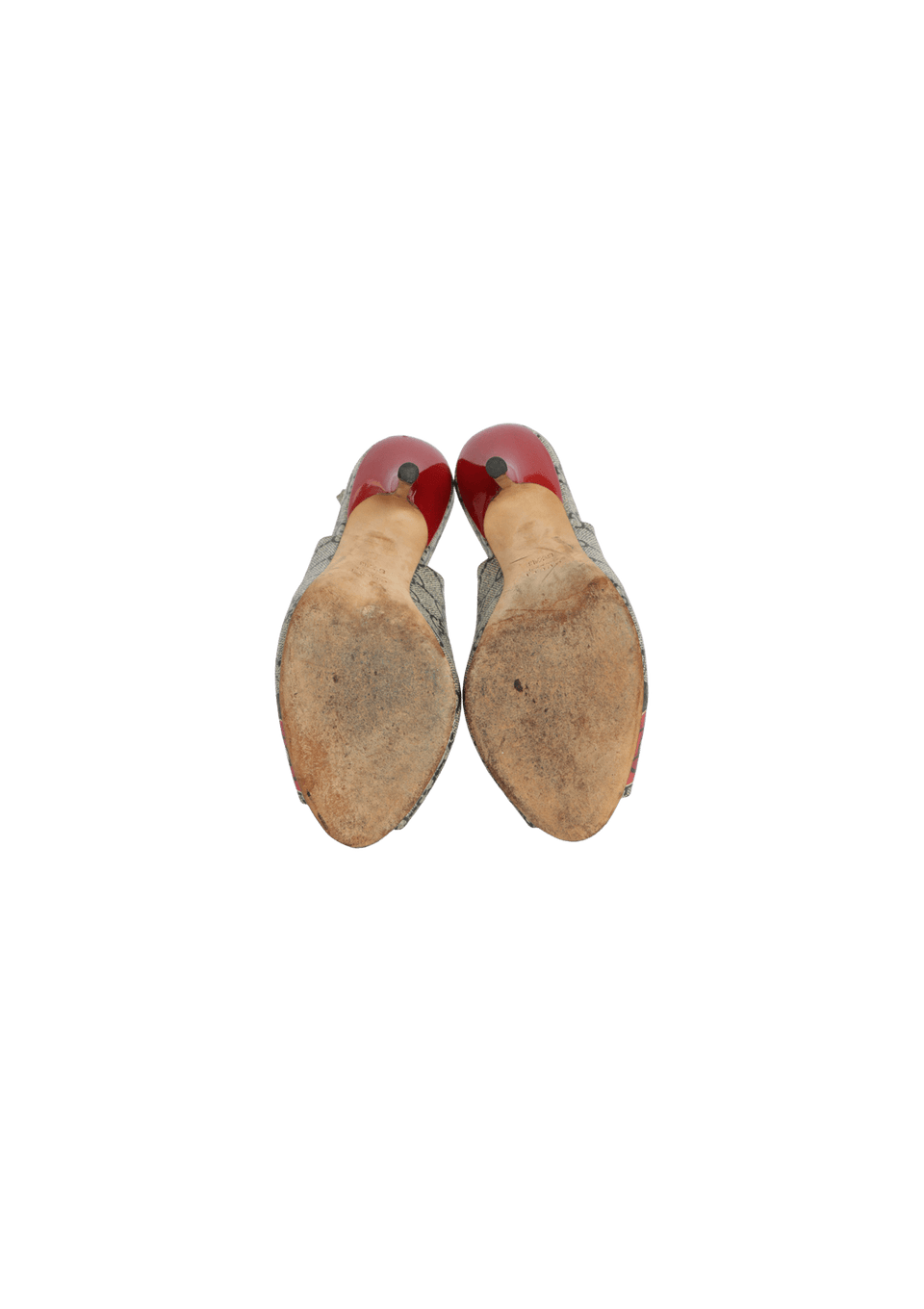 Condição: Regular. Apresenta manchas e desgastes severos nas solas, marcas de atrito no salto do pé esquerdo, manchas nos dois saltos e pequenas manchas e marcas de uso nas palmilhas e parte interna. Dust bag da marca apresenta pequenos desgastes.