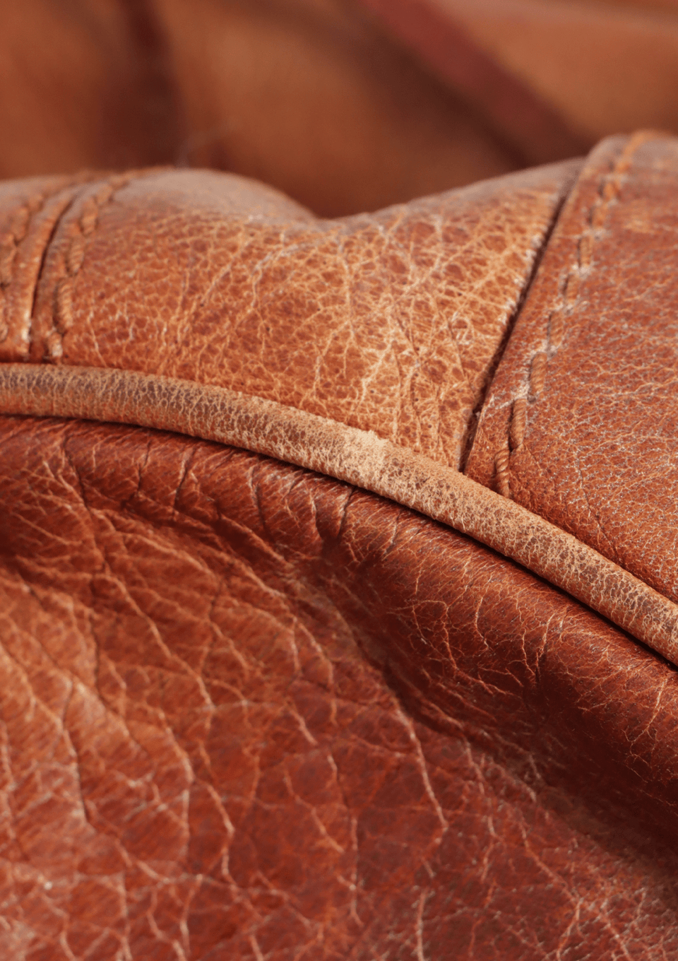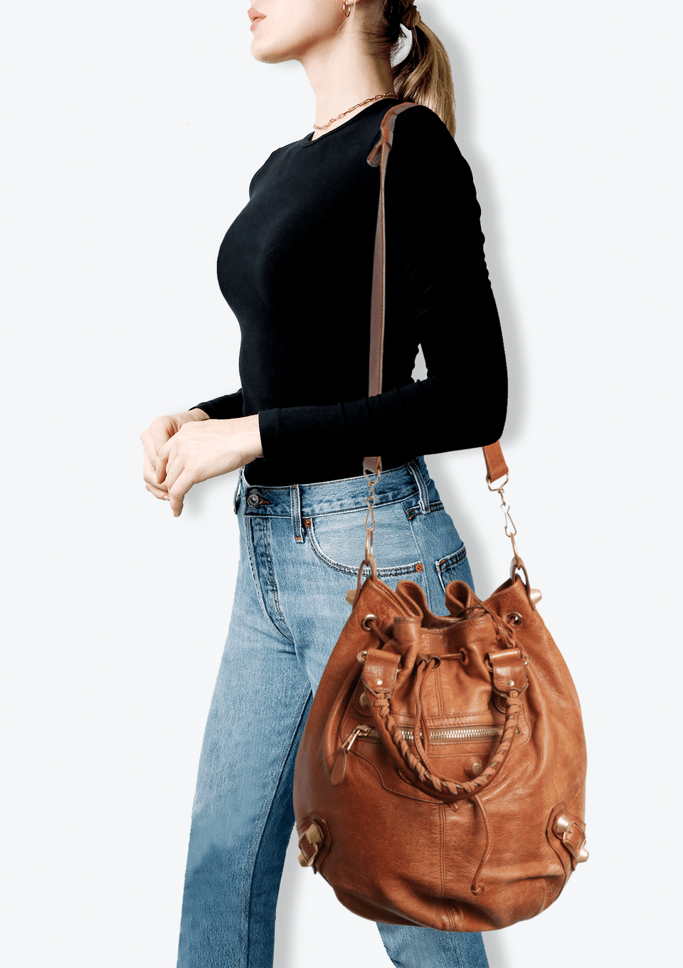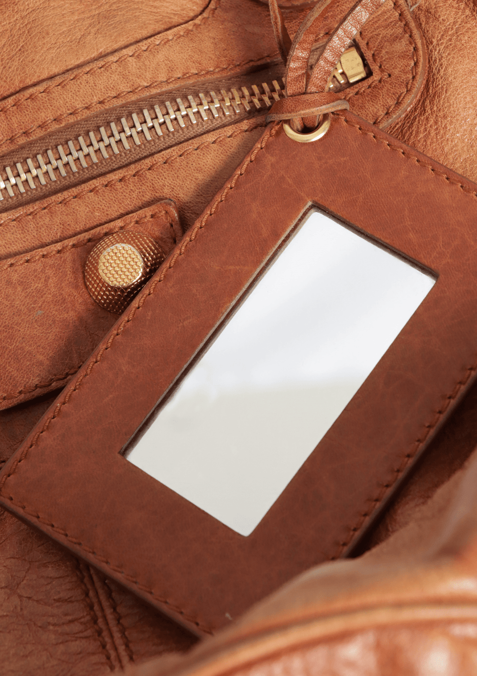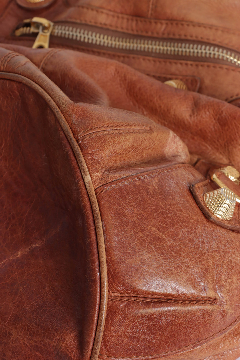 Condição: Regular. Apresenta consideráveis desgastes por todo o couro, especialmente nos cantos inferiores e nas laterais da bolsa, notáveis desgastes e fissuras nas selagens, principalmente nas alças de mão e ombro, consideráveis manchas escurecidas no couro da parte posterior inferior, notável deformação na estrutura das tiras de ajuste, consideráveis desgastes nas ferragens, notáveis marcas de uso nos forro, especialmente manchas esbranquiçadas e severo odor de item armazenado.
