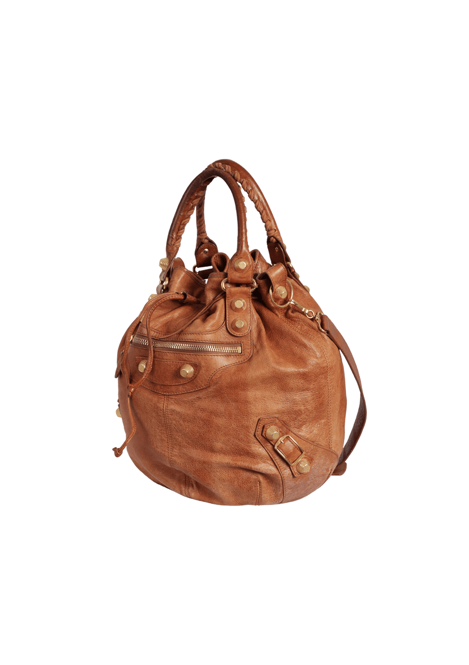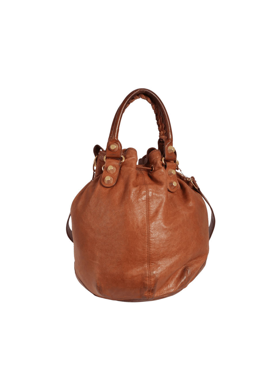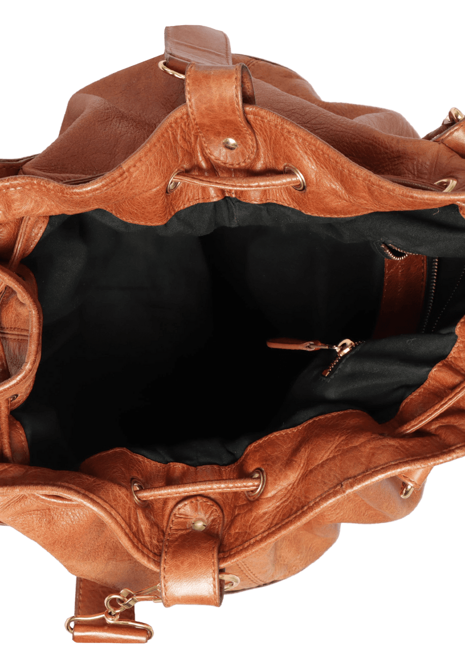 Condição: Regular. Apresenta consideráveis desgastes por todo o couro, especialmente nos cantos inferiores e nas laterais da bolsa, notáveis desgastes e fissuras nas selagens, principalmente nas alças de mão e ombro, consideráveis manchas escurecidas no couro da parte posterior inferior, notável deformação na estrutura das tiras de ajuste, consideráveis desgastes nas ferragens, notáveis marcas de uso nos forro, especialmente manchas esbranquiçadas e severo odor de item armazenado.