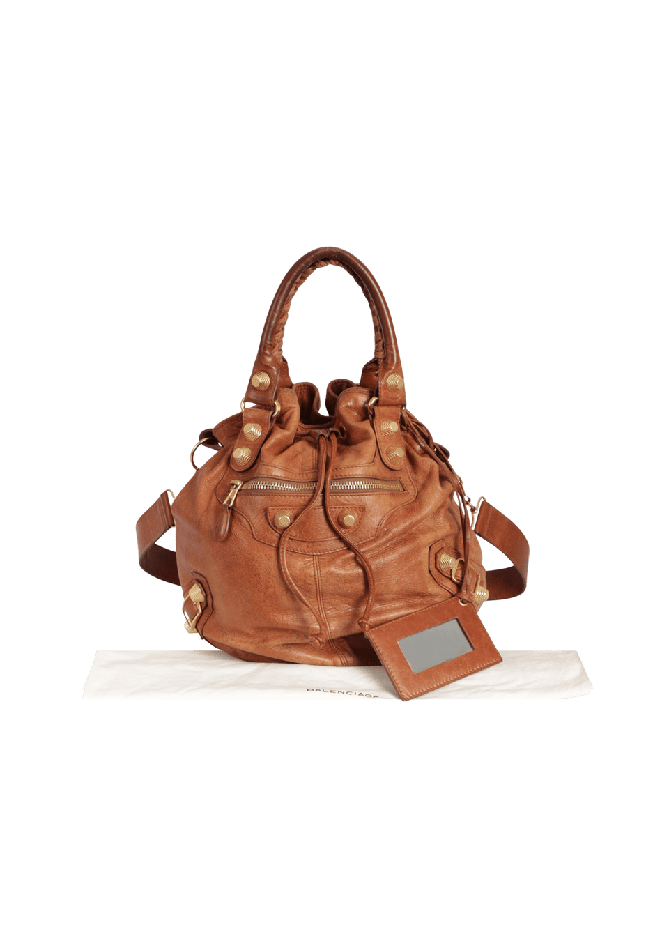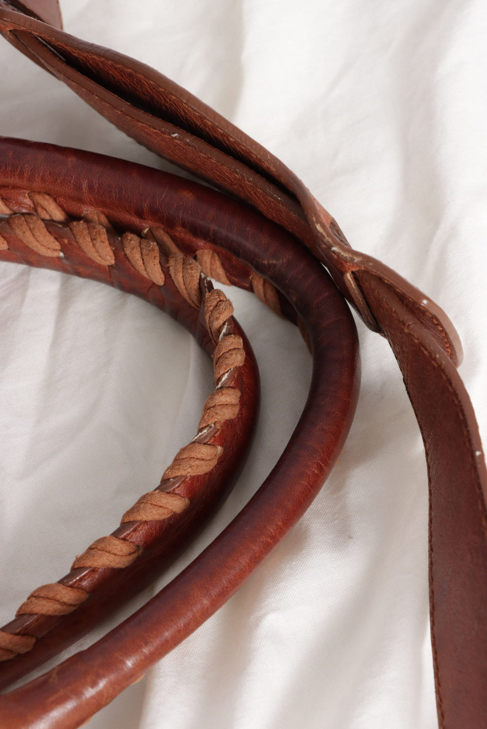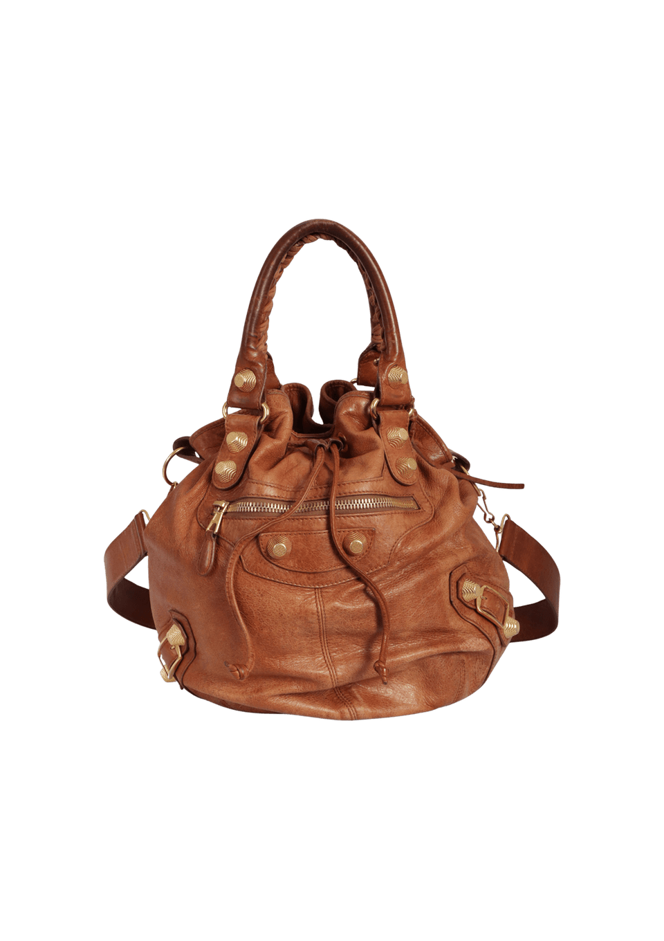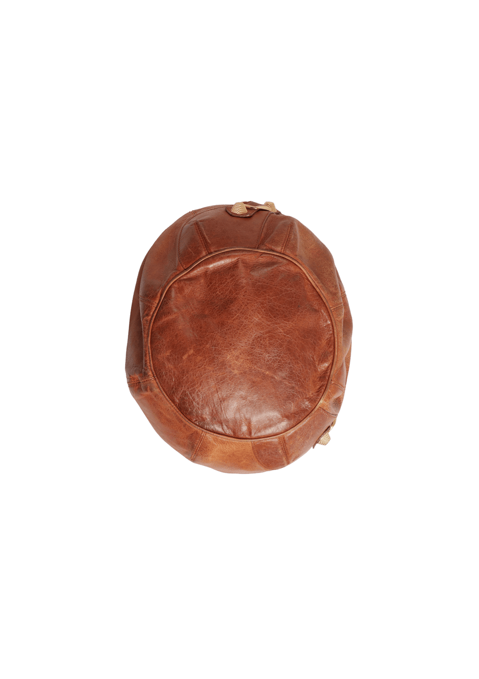 Condição: Regular. Apresenta consideráveis desgastes por todo o couro, especialmente nos cantos inferiores e nas laterais da bolsa, notáveis desgastes e fissuras nas selagens, principalmente nas alças de mão e ombro, consideráveis manchas escurecidas no couro da parte posterior inferior, notável deformação na estrutura das tiras de ajuste, consideráveis desgastes nas ferragens, notáveis marcas de uso nos forro, especialmente manchas esbranquiçadas e severo odor de item armazenado.
