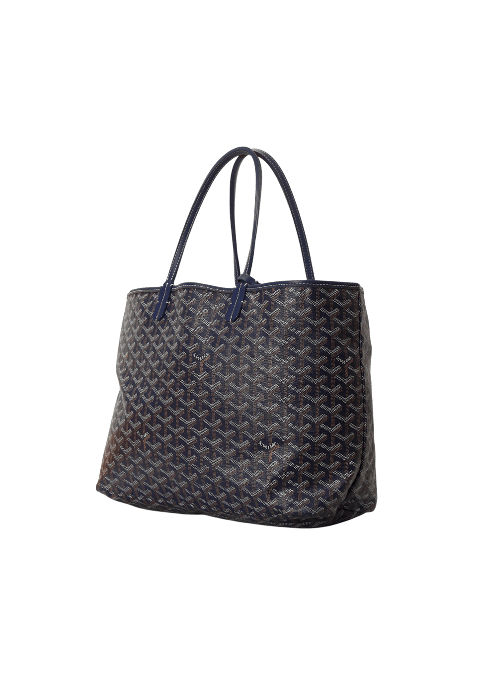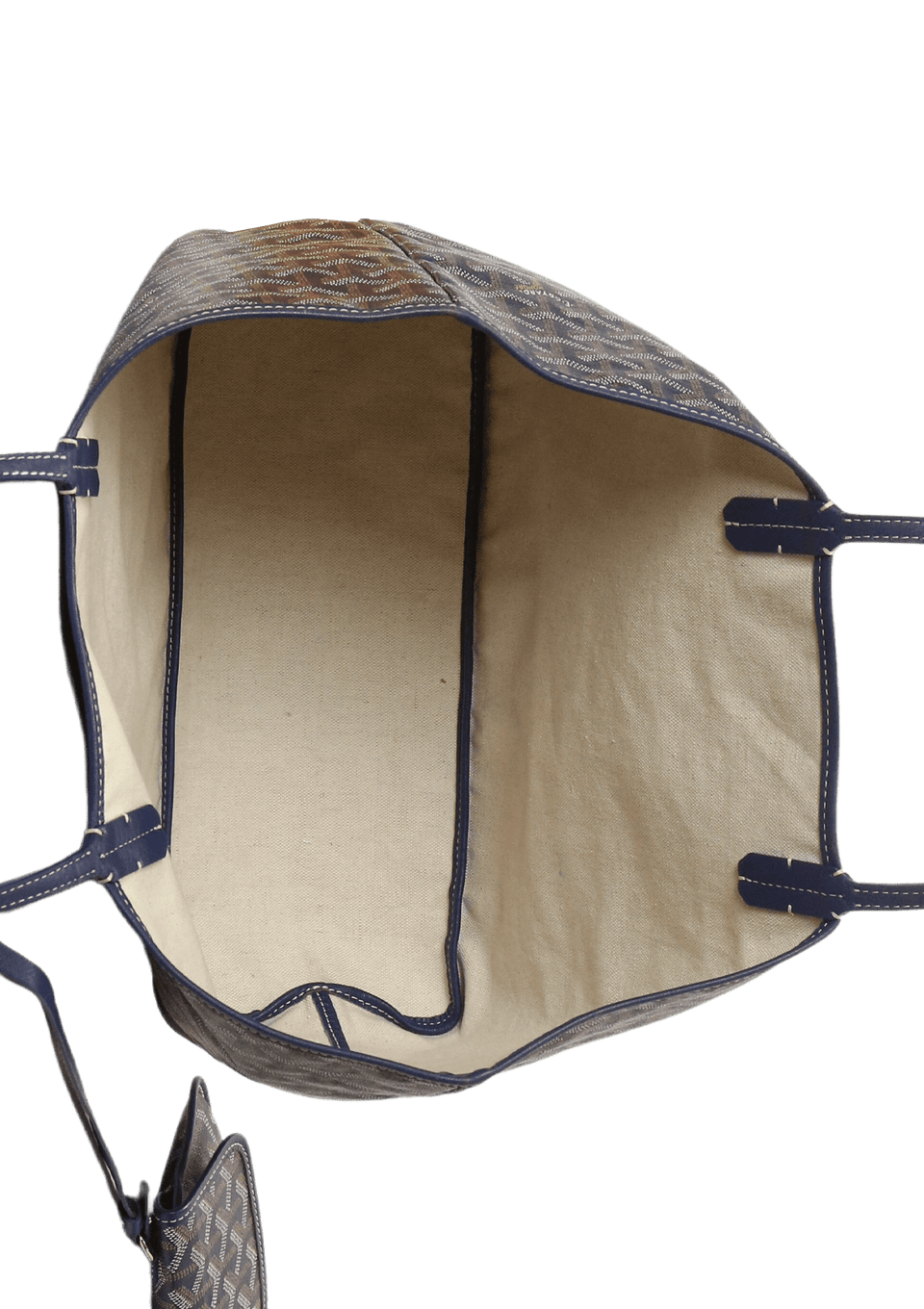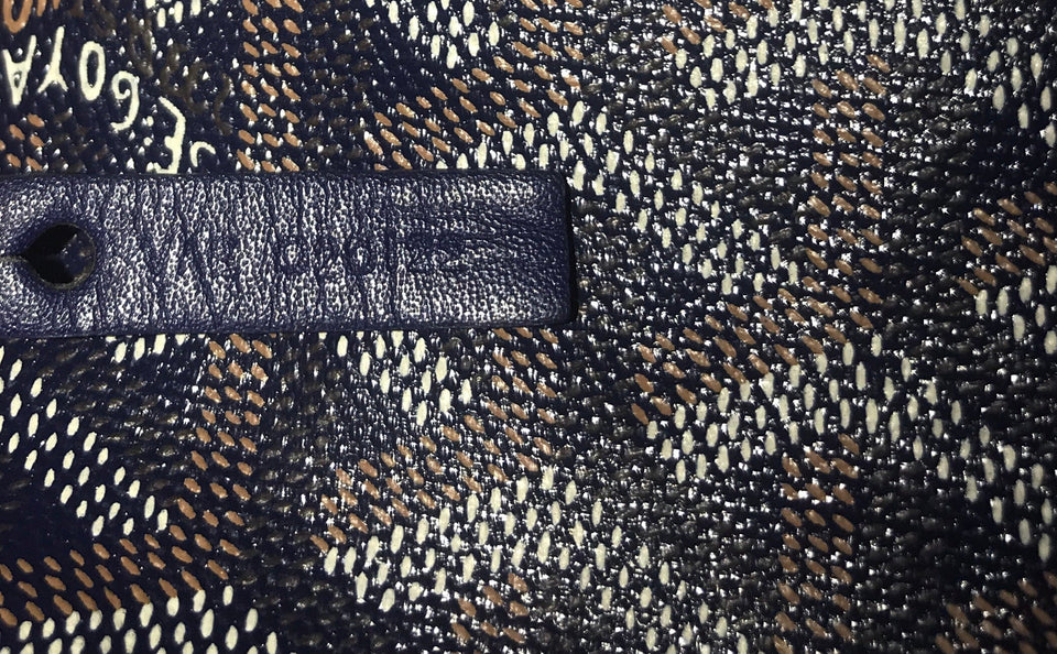- Canvas Chevron azul, branco e marrom e couro azul;