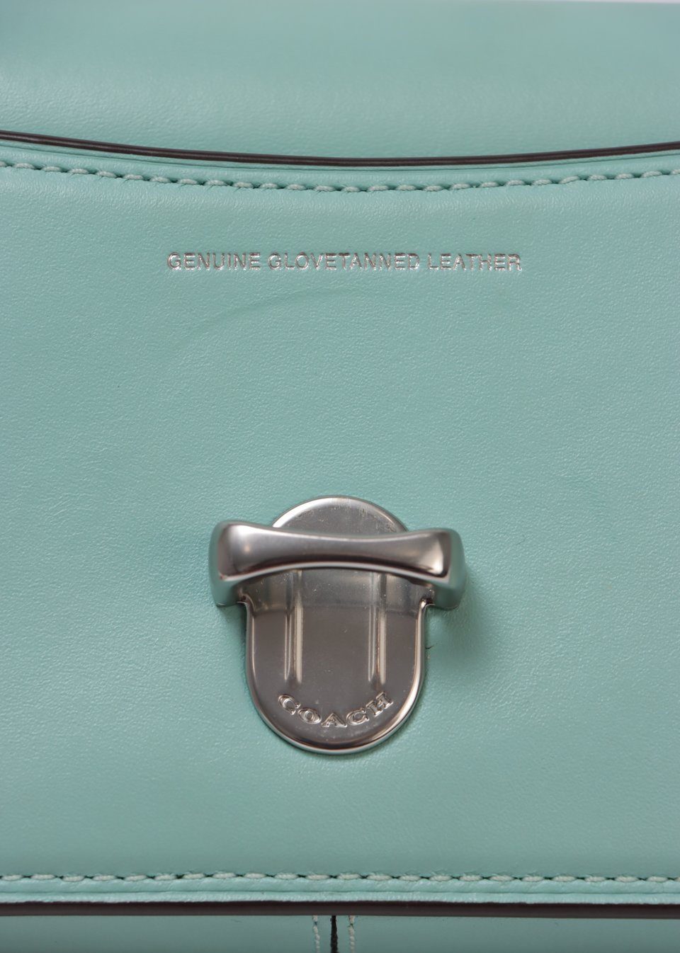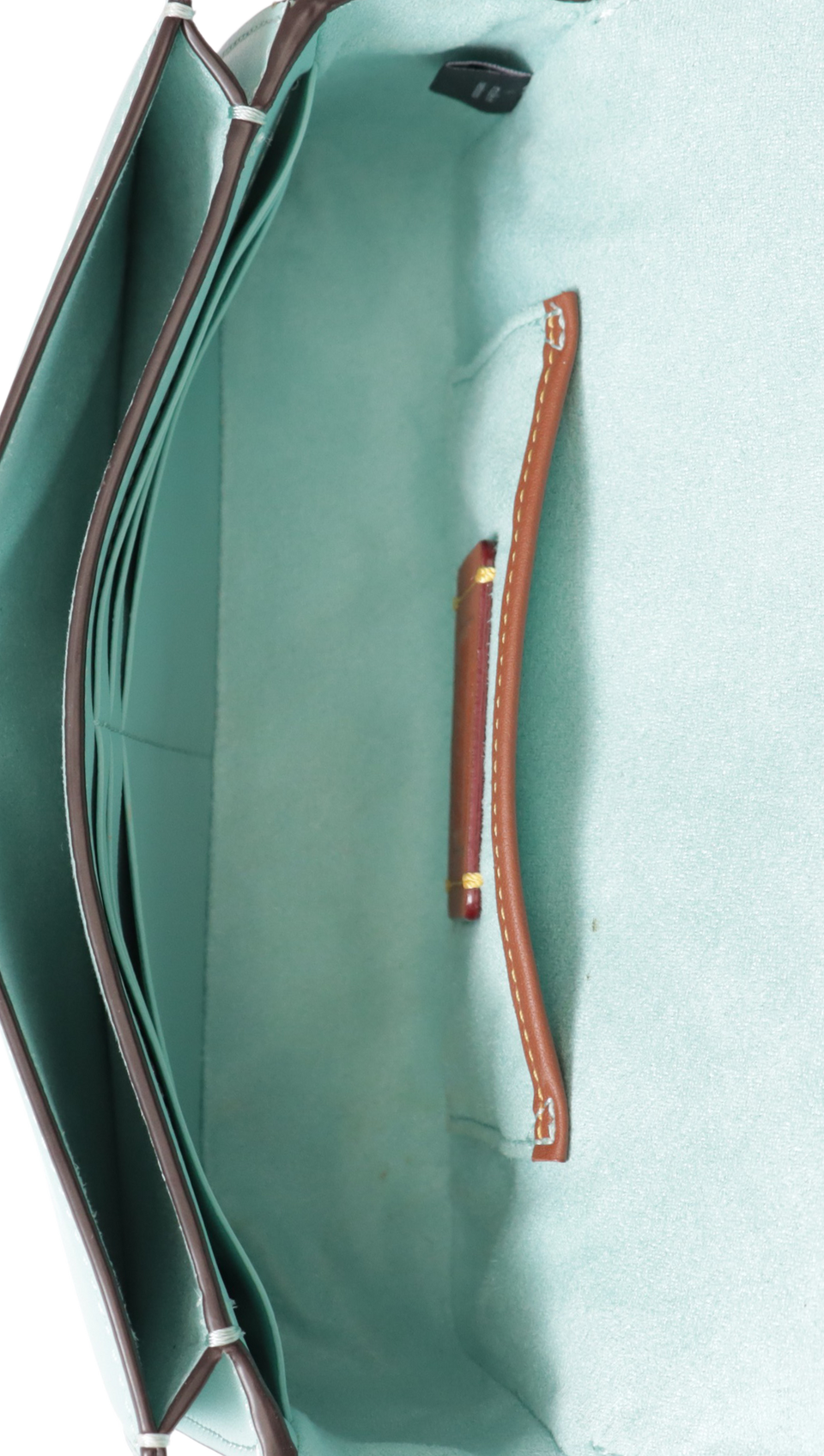 Muito bom, com aparência de seminovo. Apresenta levíssimas manchas e marcas de uso pelo couro, especialmente na parte frontal inferior do lado esquerdo, parte superior central da aba e base, mínima deformaçāo na parte central da alça curta, levíssimas marcas de uso nas ferragens e mínima mancha amarelada na parte superior do forro.