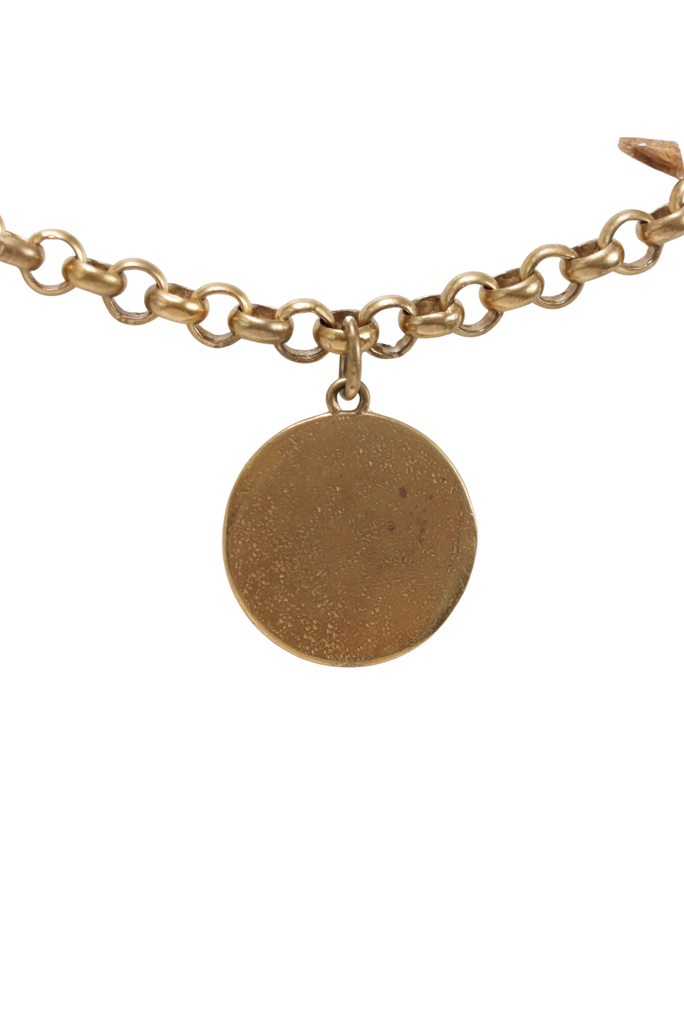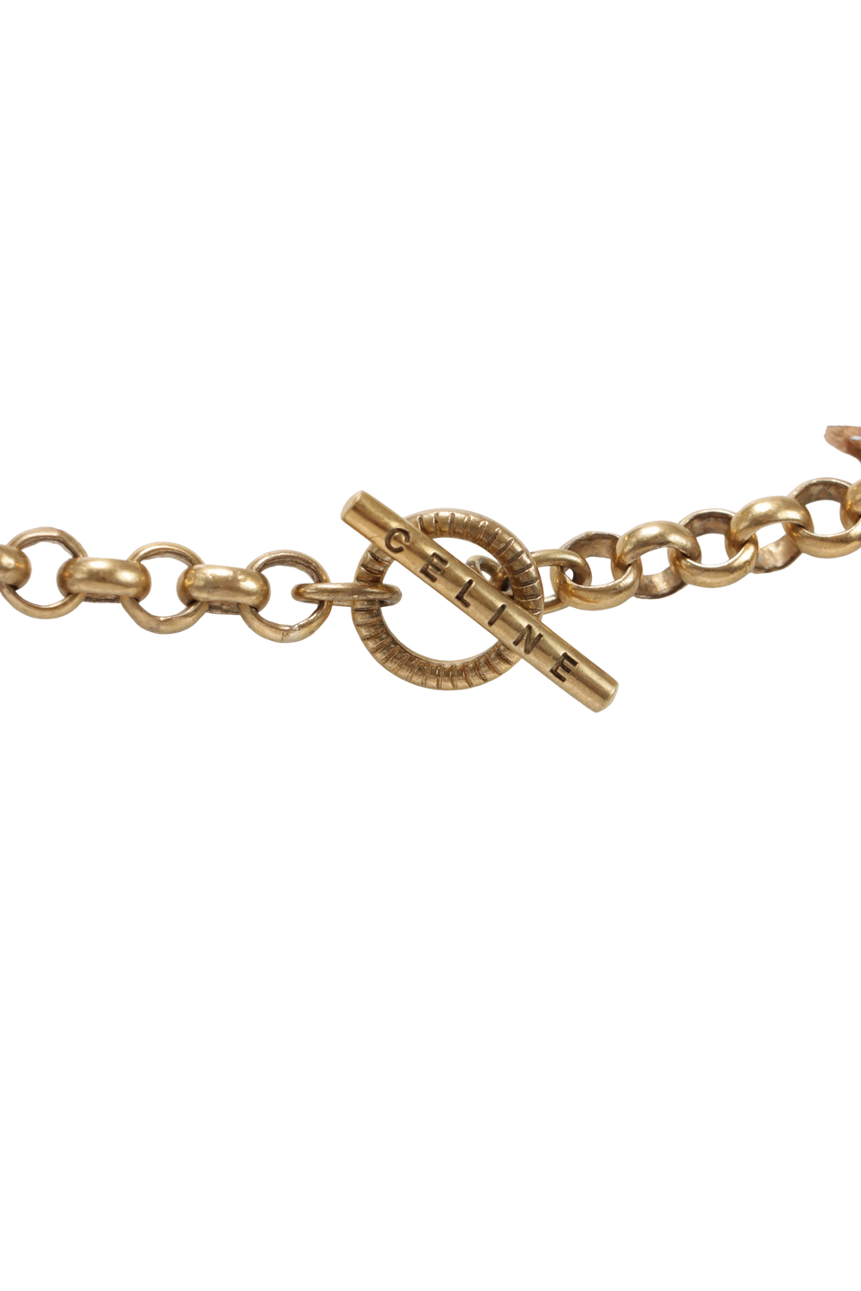 Regular. Apresenta severas manchas escurecidas, descolorações e marcas de uso pelo metal, especialmente na parte interna dos elos, na parte de trás do lado direito superior e no fecho.