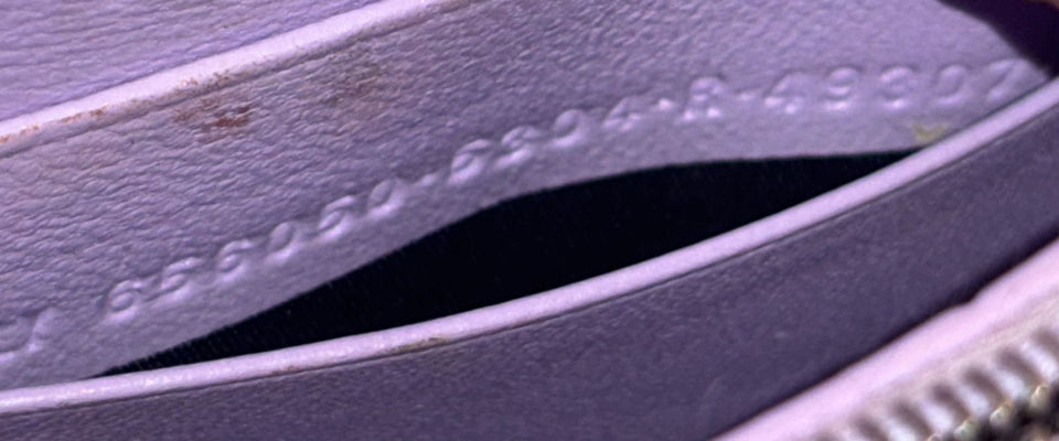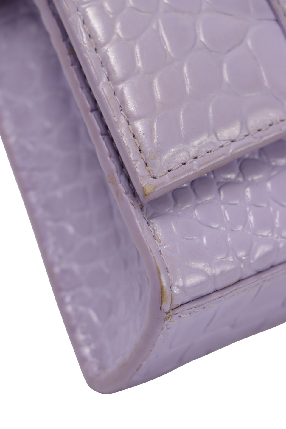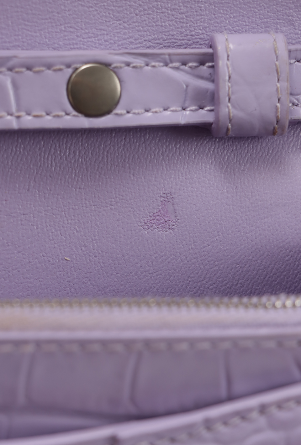 Descrição do Material: Couro calfskin roxo com acabamento de textura de pele de crocodilo