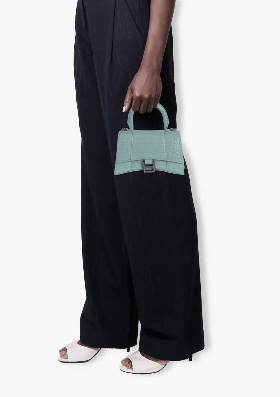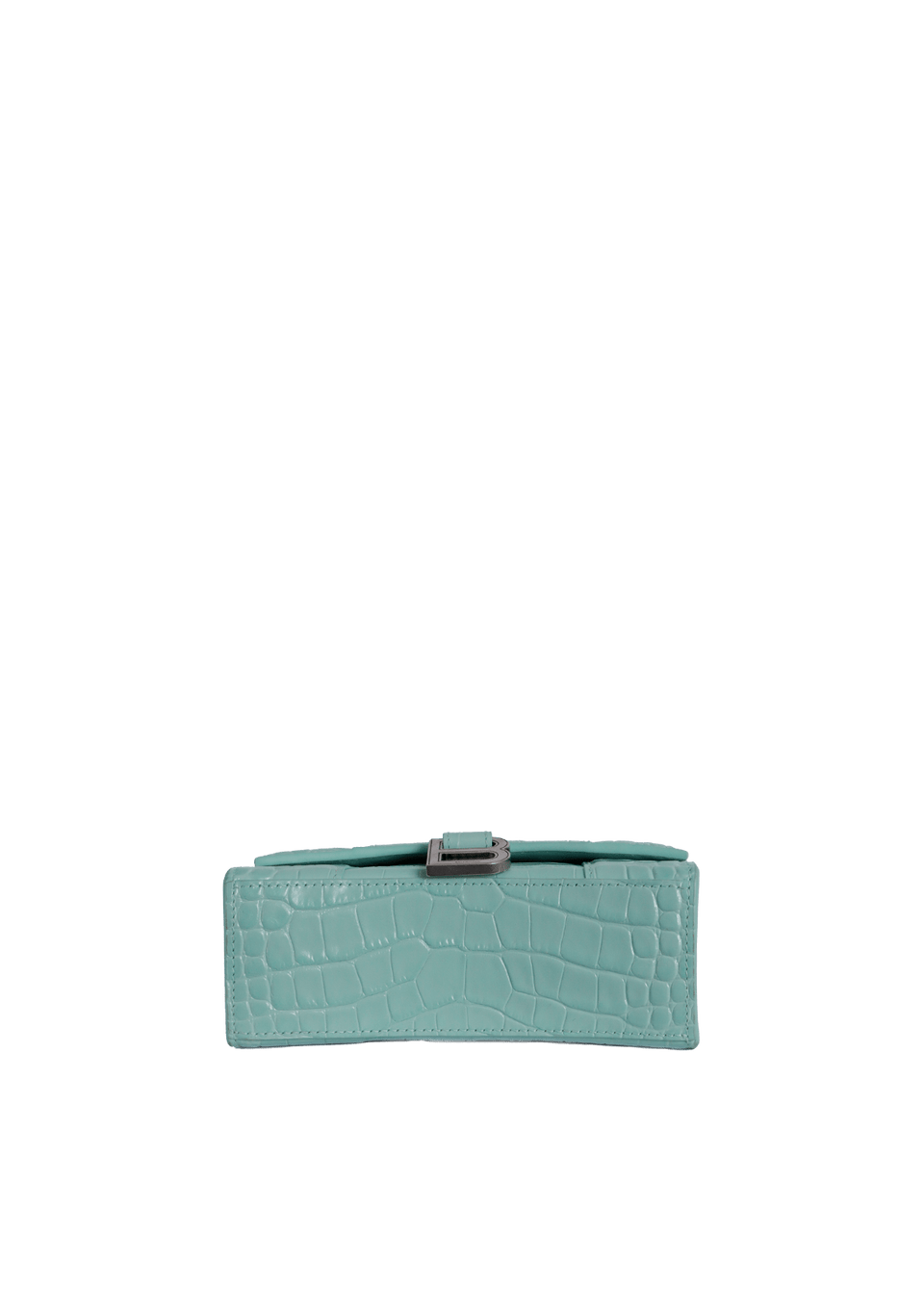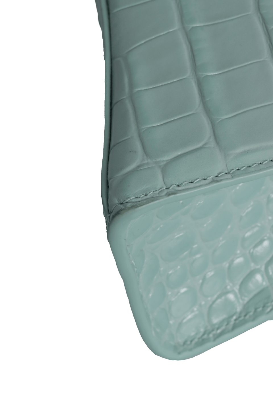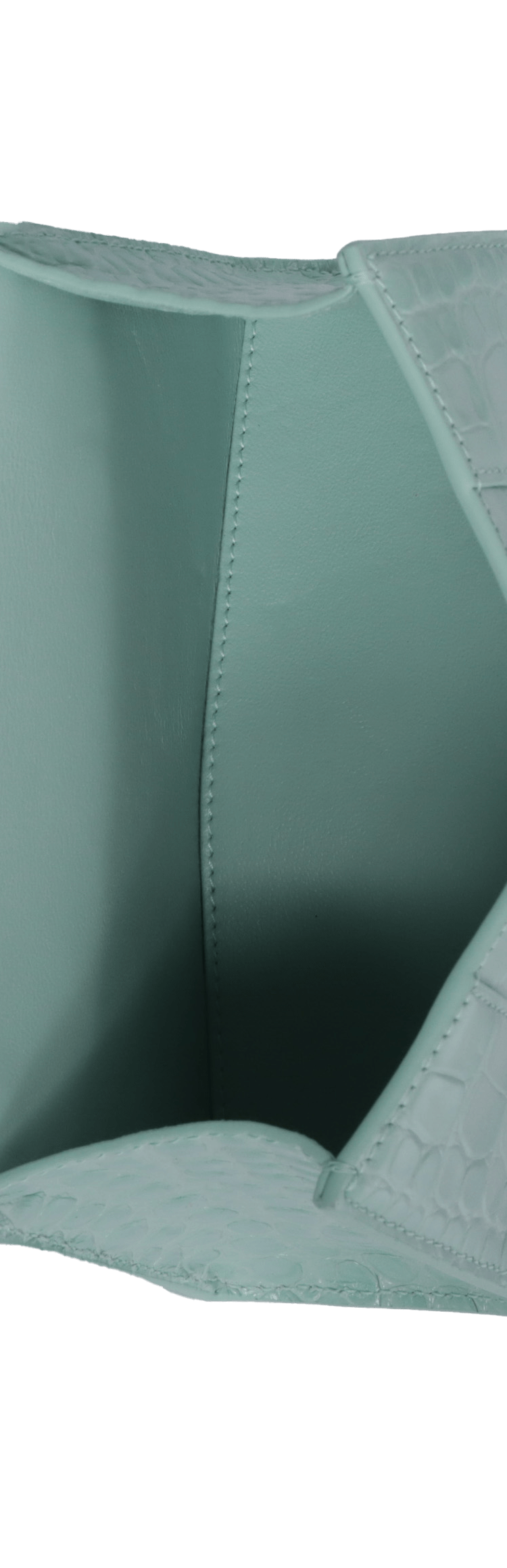 - Couro calfskin verde com acabamento de textura de pele de crocodilo;