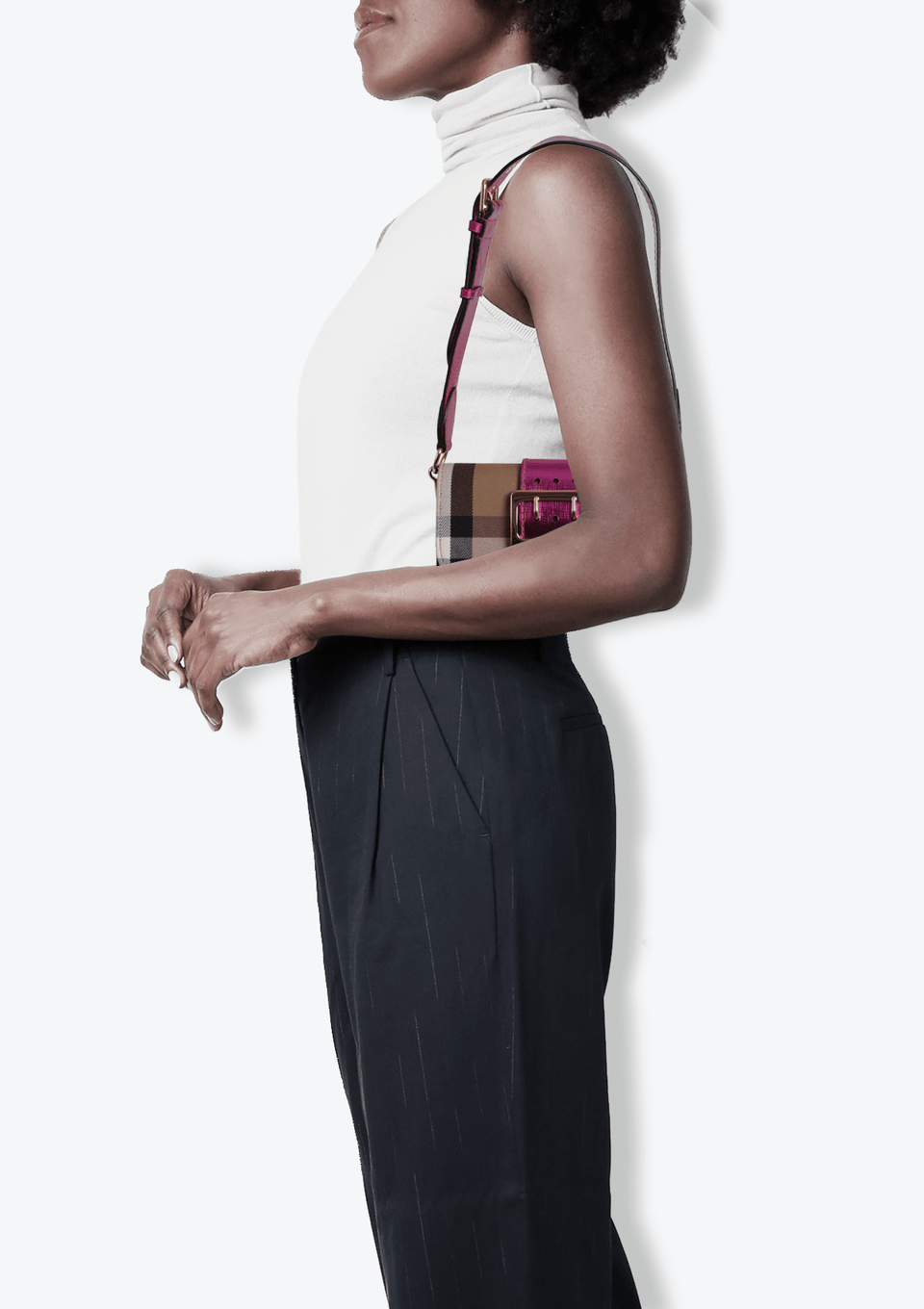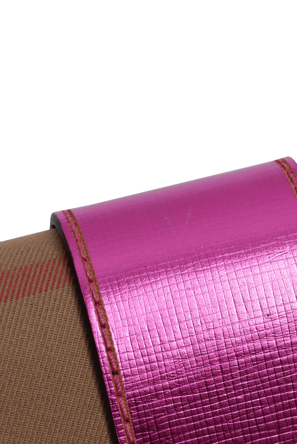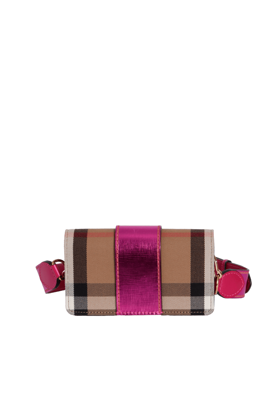 - Canvas House Check com detalhes em couro calfskin rosa metalizado com acabamento Embossed;