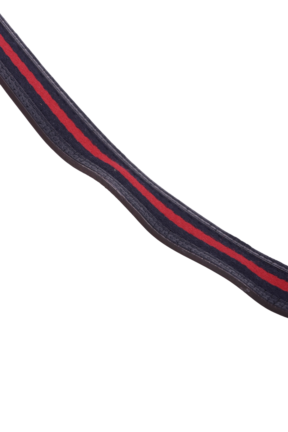 Regular. Apresenta severas marcas de uso e oxidações na fivela, notável deformação na estrutura, principalmente na parte central, consideráveis marcas de uso, desgastes e fissuras pelo couro na parte interna, notáveis fissuras e aberturas na selagem, especialmente na parte superior ao lado direito da fivela, leves puídos nas partes em tecido e notável resíduo de cola na parte interna da lateral esquerda.