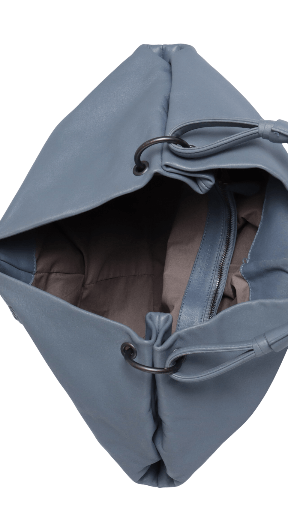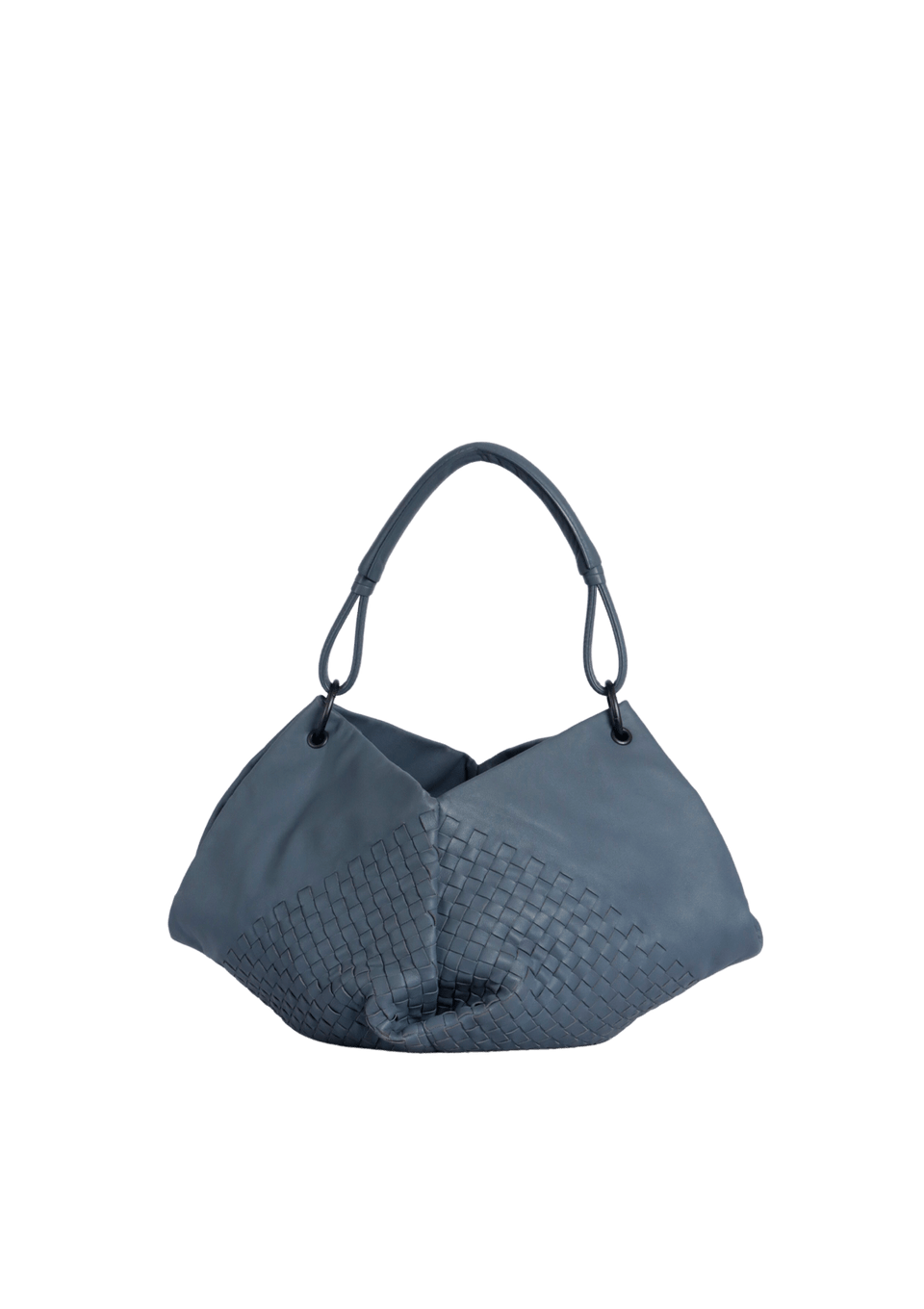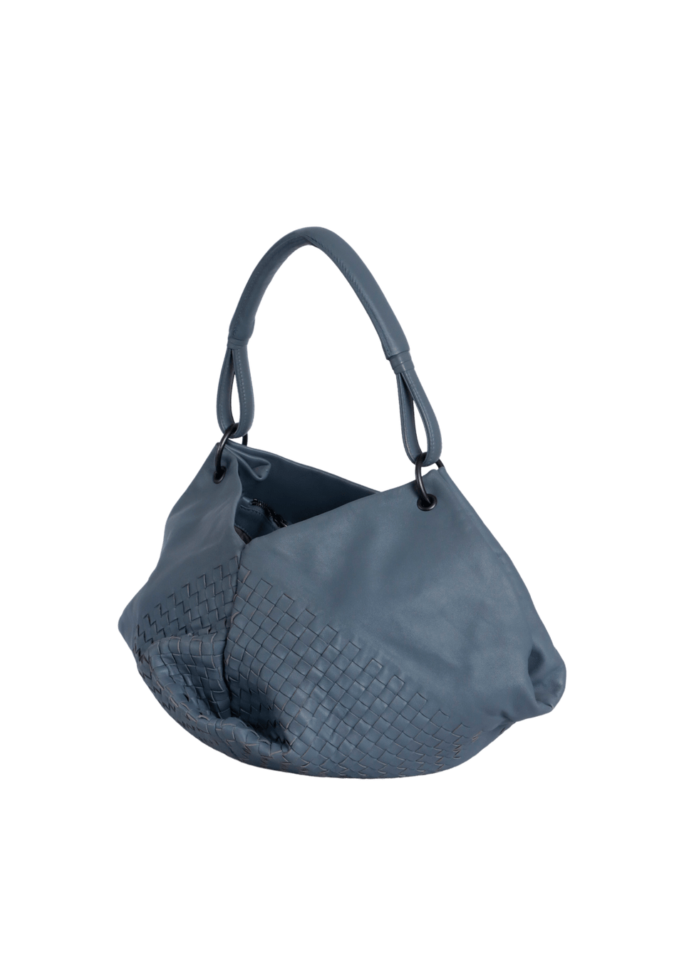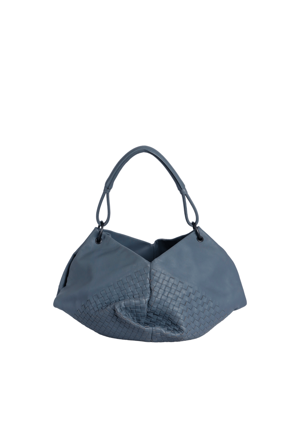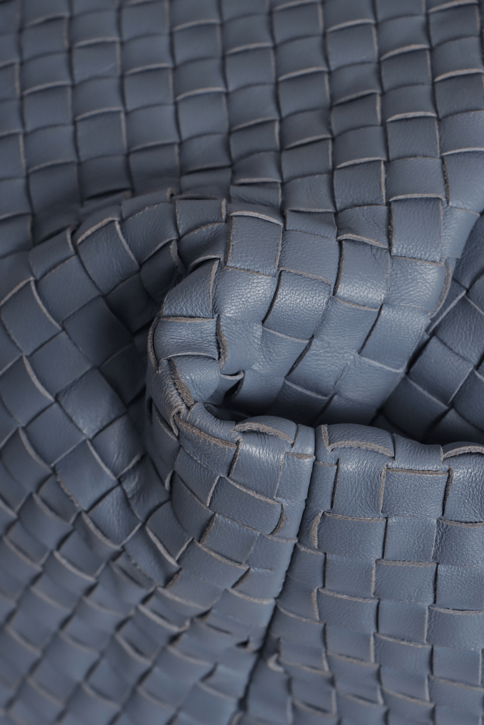 - Couro calfskin azul com detalhes em acabamento Intrecciato;