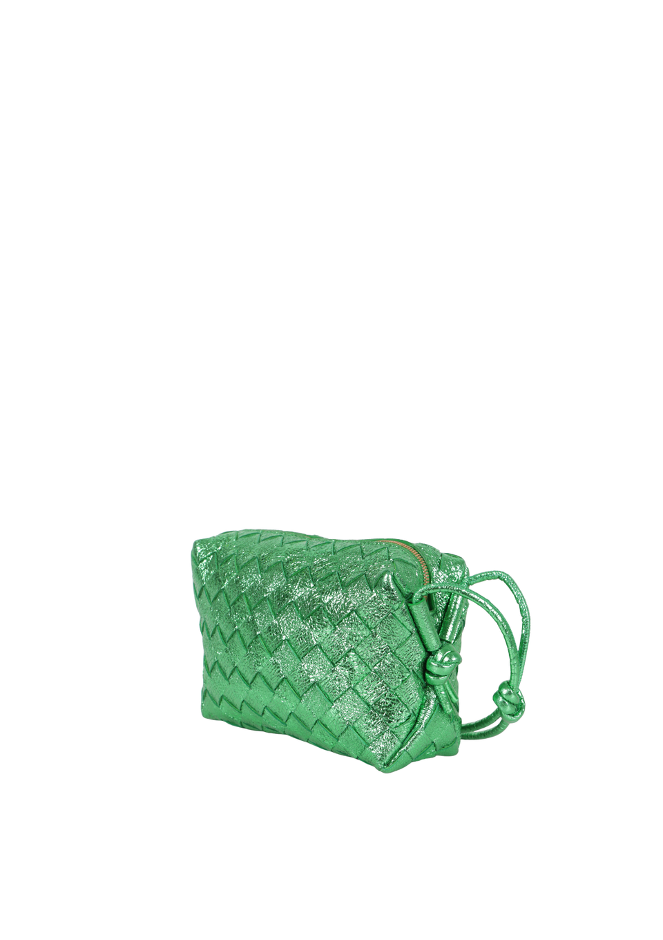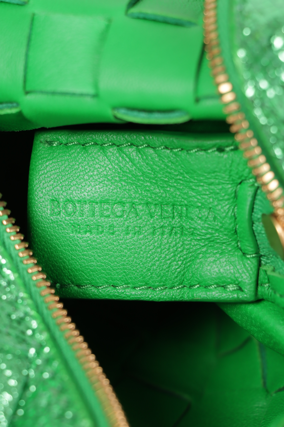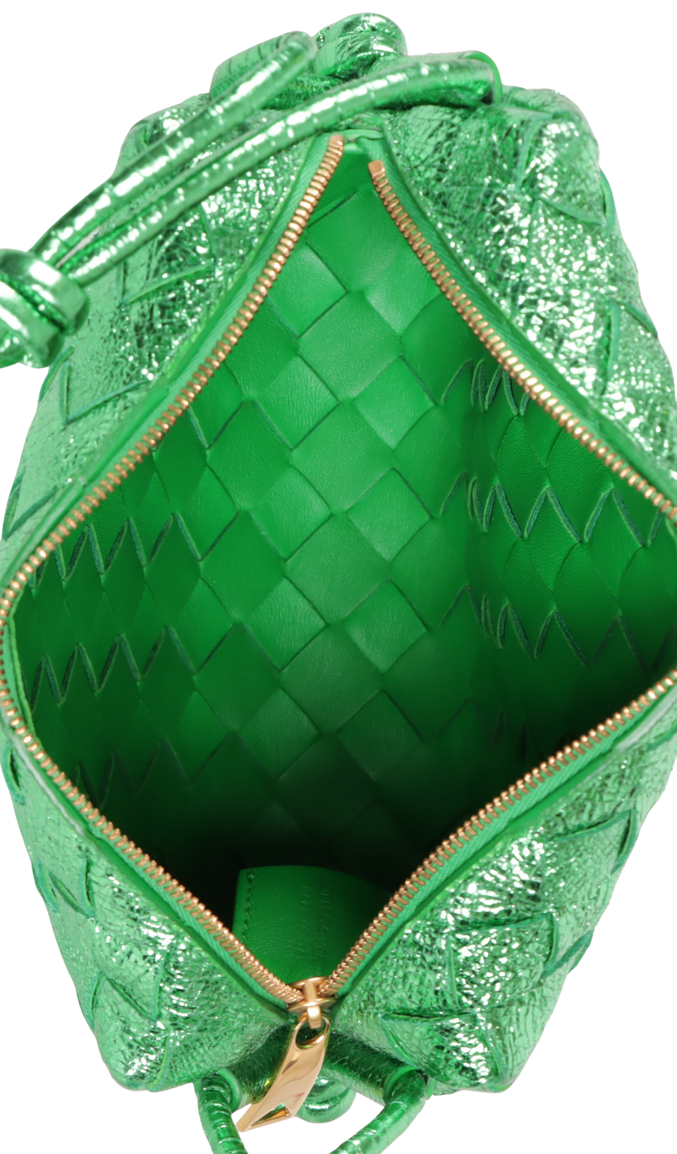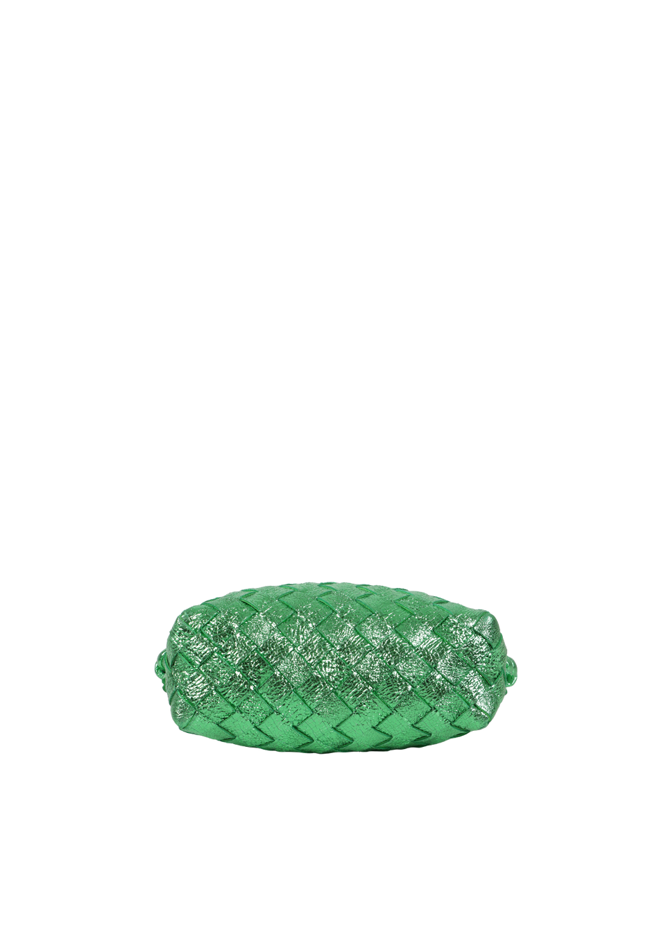 Descrição do Material: Couro lambskin verde com acabamentos Intrecciato, craquelado e metalizado