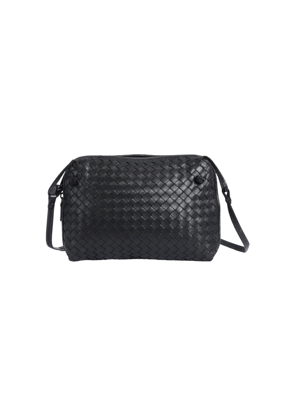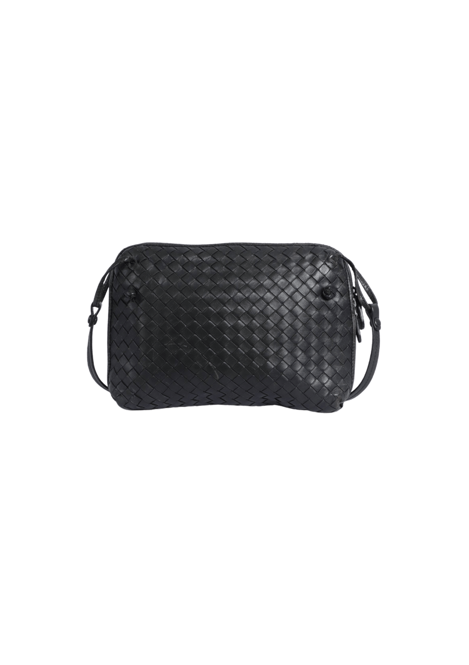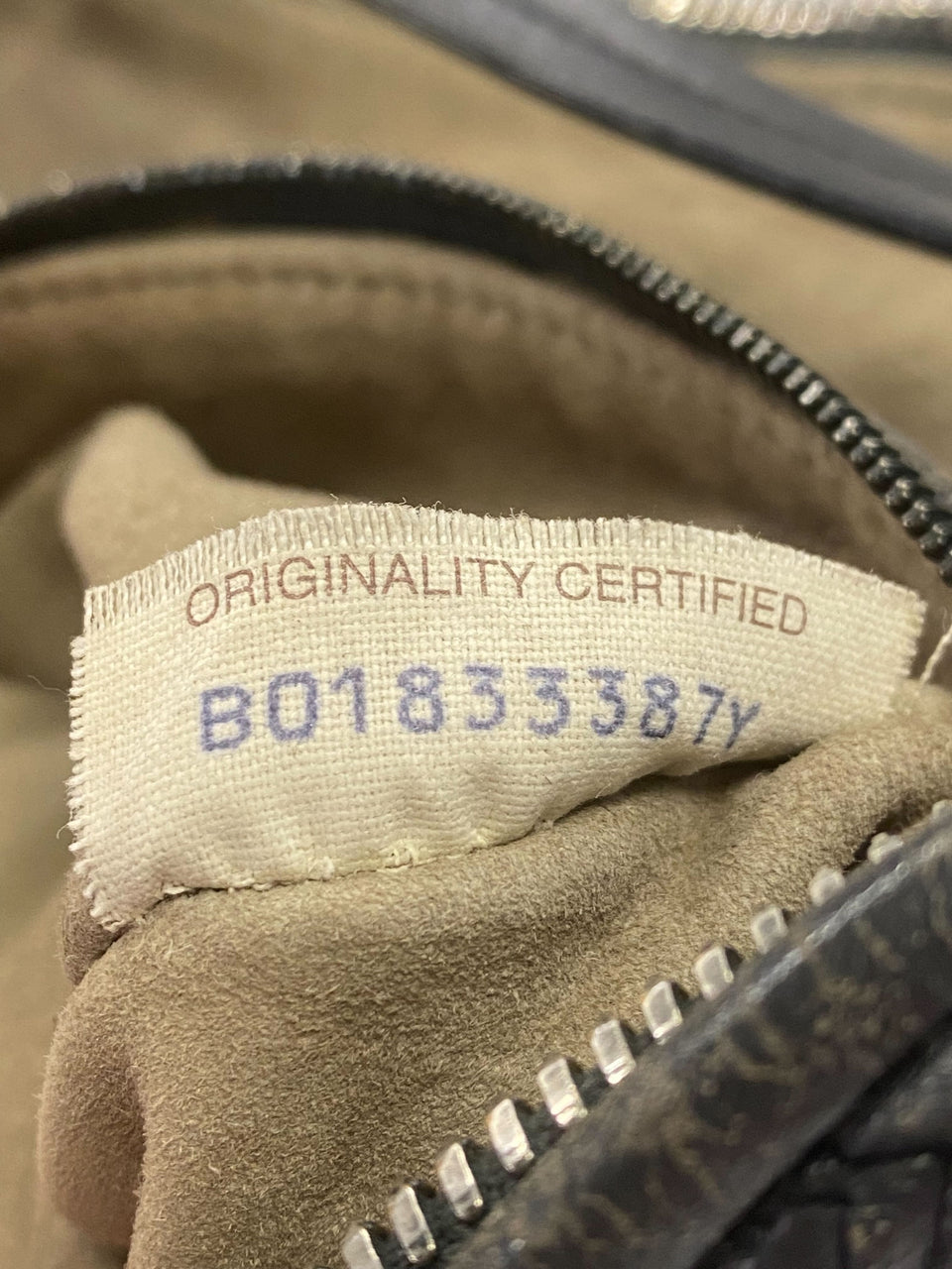 Condição: Regular. Apresenta severas fissuras e desgastes das selagens da alça dos acabamentos superiores da bolsa, severos desgastes no couro, principalmente nos acabamentos do Intrecciato e nos quatro cantos inferiores da bolsa e consideráveis desgastes no forro, principalmente desgastes nas costuras e manchas de caneta.