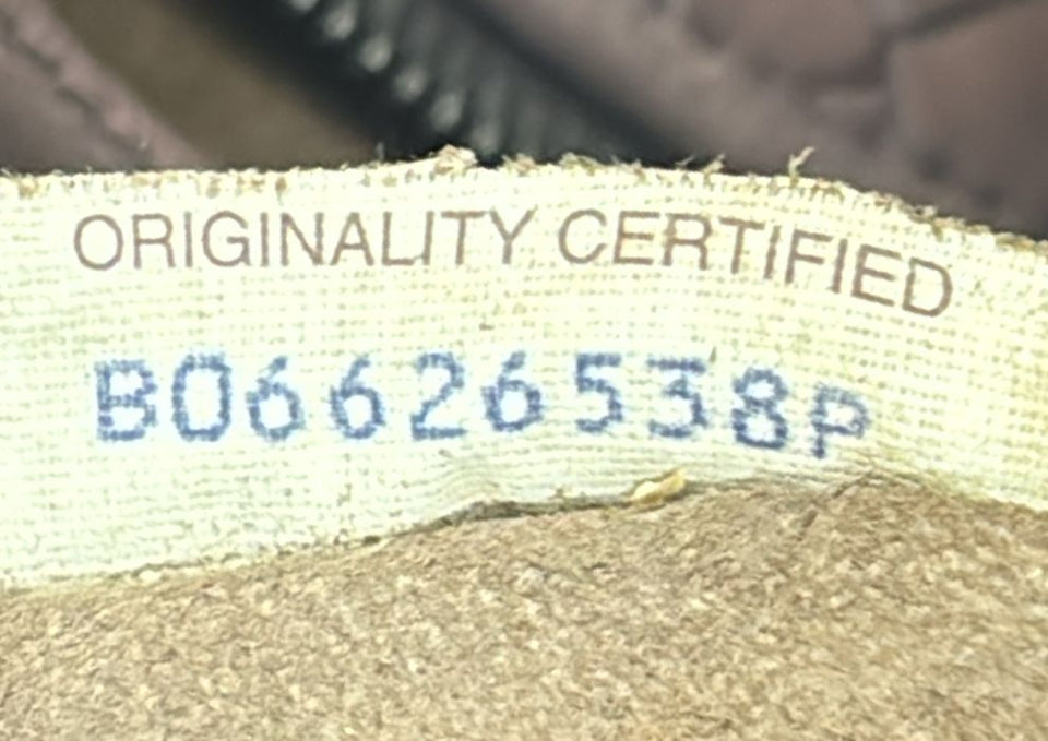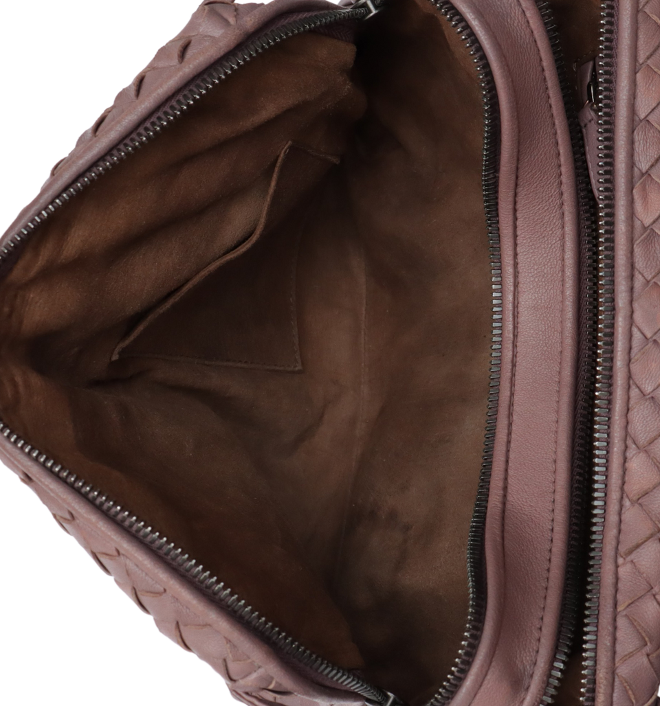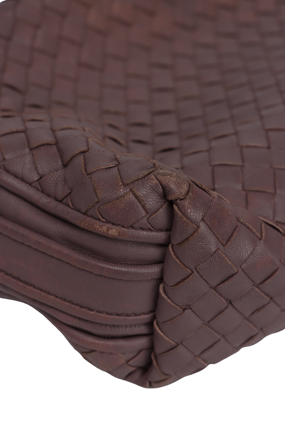 Bom, com aparência de usado. Apresenta leves desgastes, manchas e marcas de uso pelo couro, principalmente na parte superior frontal, cantos da base e lado direito superior de trás, pequenas deformidades pela estrutura, especialmente na base, leves desgastes nas extremidades do acabamento Intreciatto nos cantos da base e na parte superior, pequenas fissuras nas selagens da alça, leves descolorações e marcas de uso nas ferragens dos puxadores dos cursores e na fivela da alça e pequenas manchas e marcas de uso pelo forro.