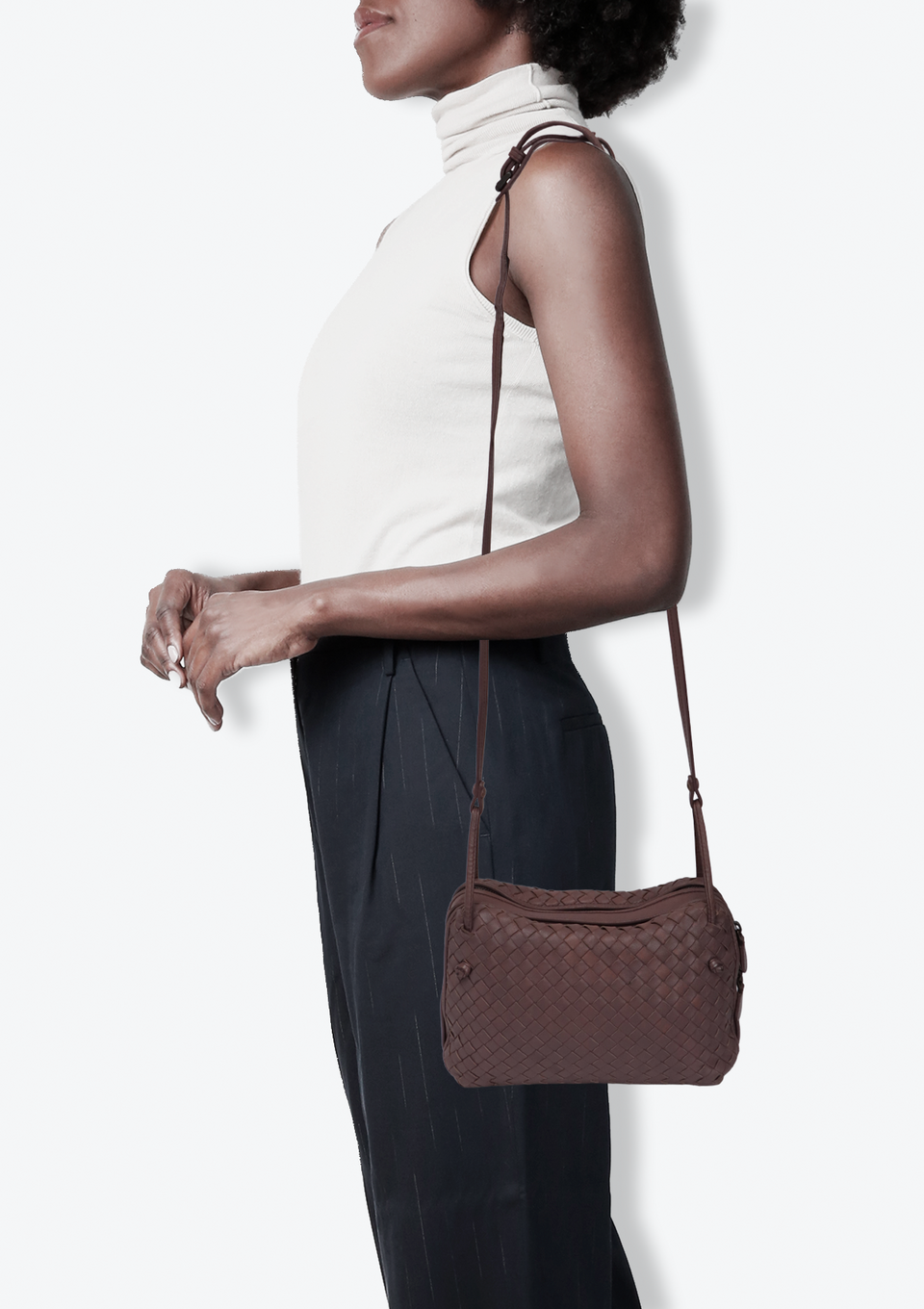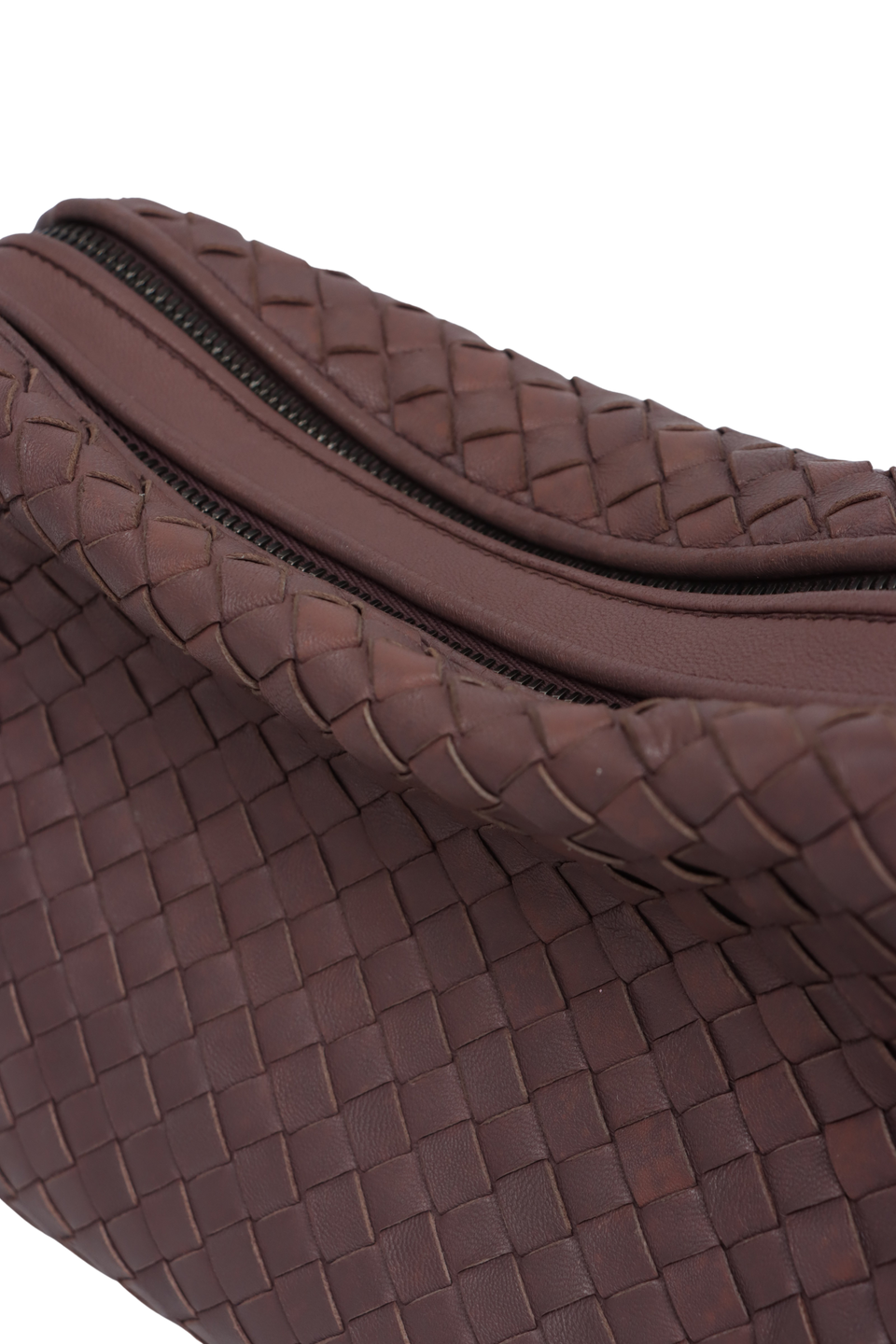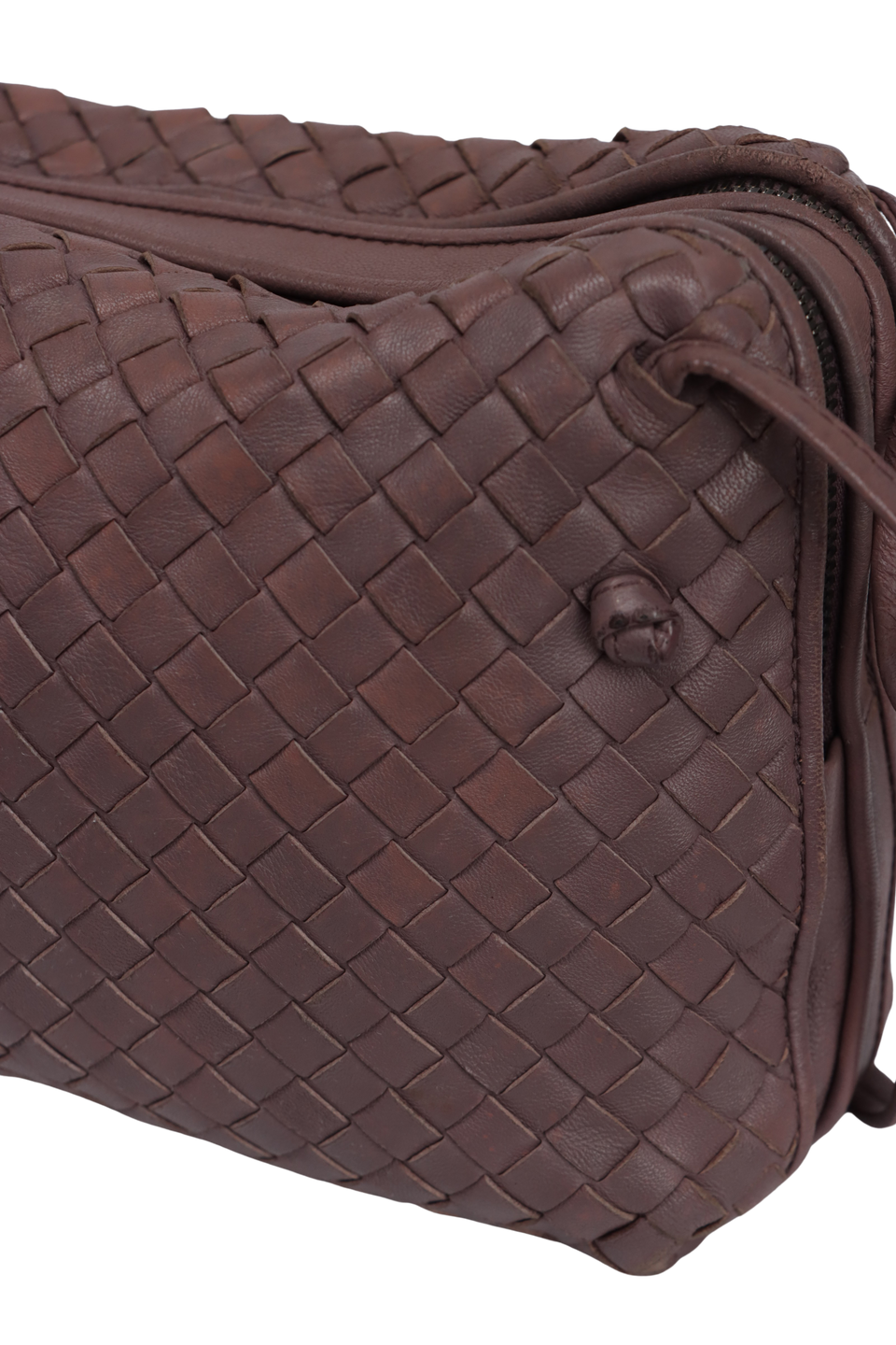Bom, com aparência de usado. Apresenta leves desgastes, manchas e marcas de uso pelo couro, principalmente na parte superior frontal, cantos da base e lado direito superior de trás, pequenas deformidades pela estrutura, especialmente na base, leves desgastes nas extremidades do acabamento Intreciatto nos cantos da base e na parte superior, pequenas fissuras nas selagens da alça, leves descolorações e marcas de uso nas ferragens dos puxadores dos cursores e na fivela da alça e pequenas manchas e marcas de uso pelo forro.