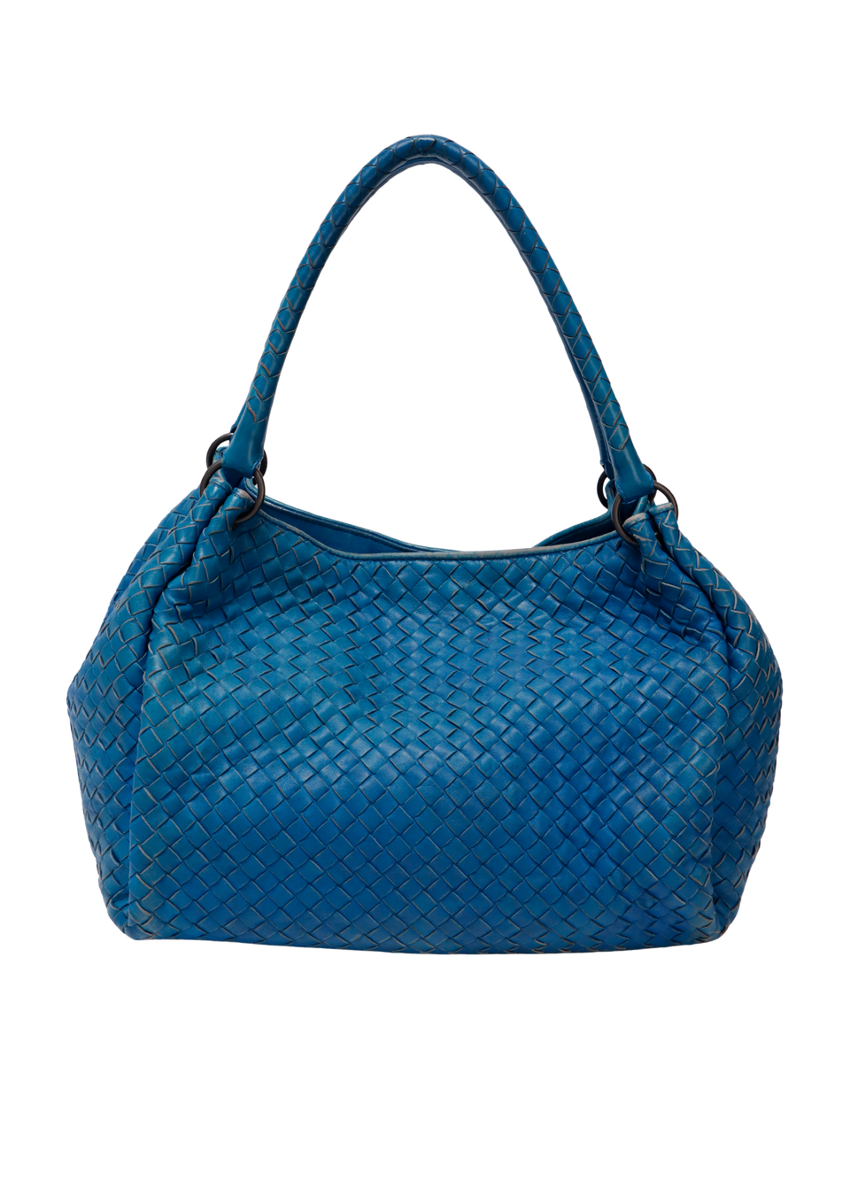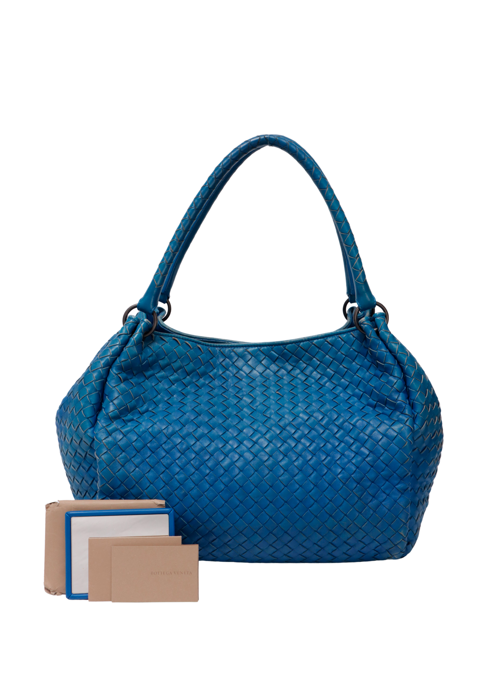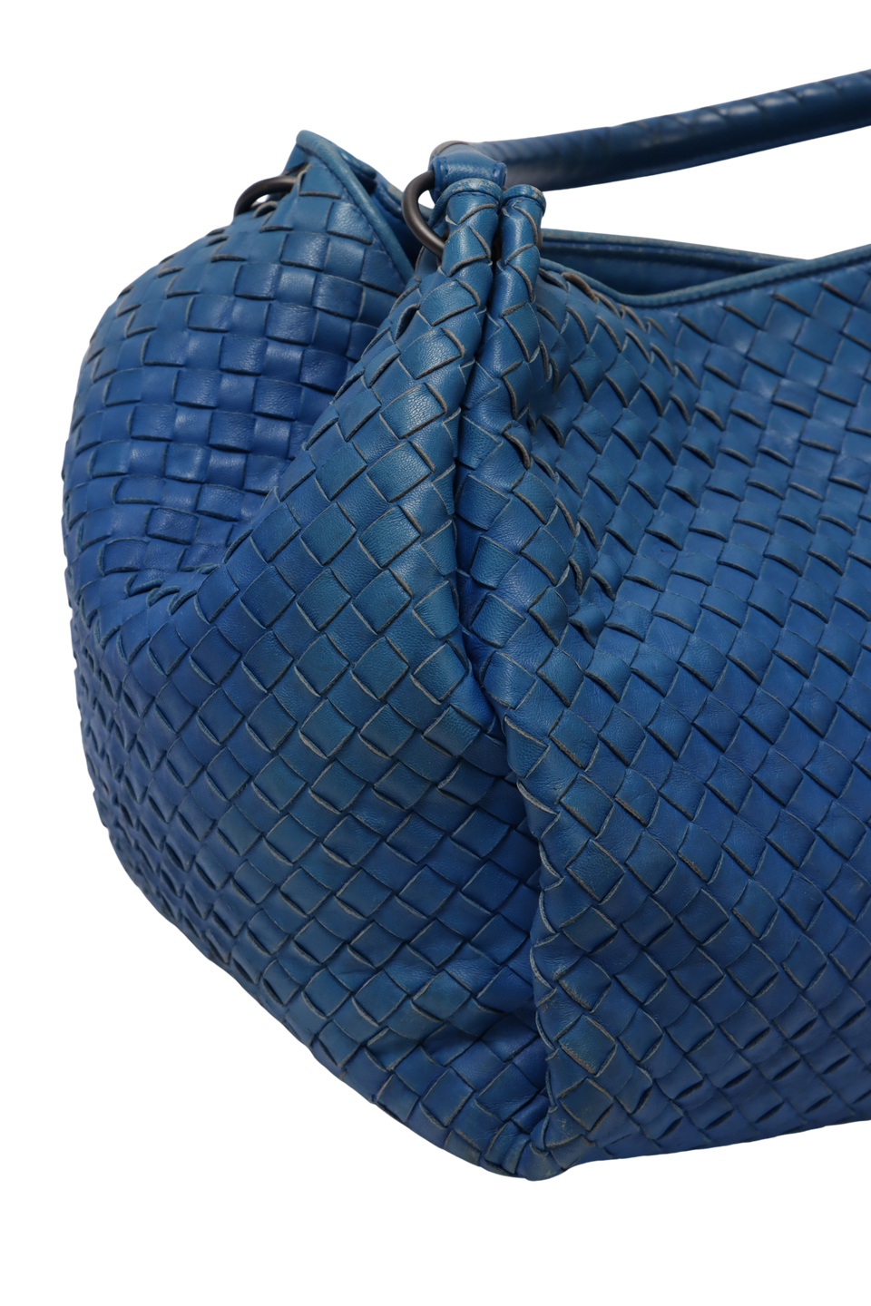 Descrição do Material: Couro lambskin azul com acabamento Intrecciato
