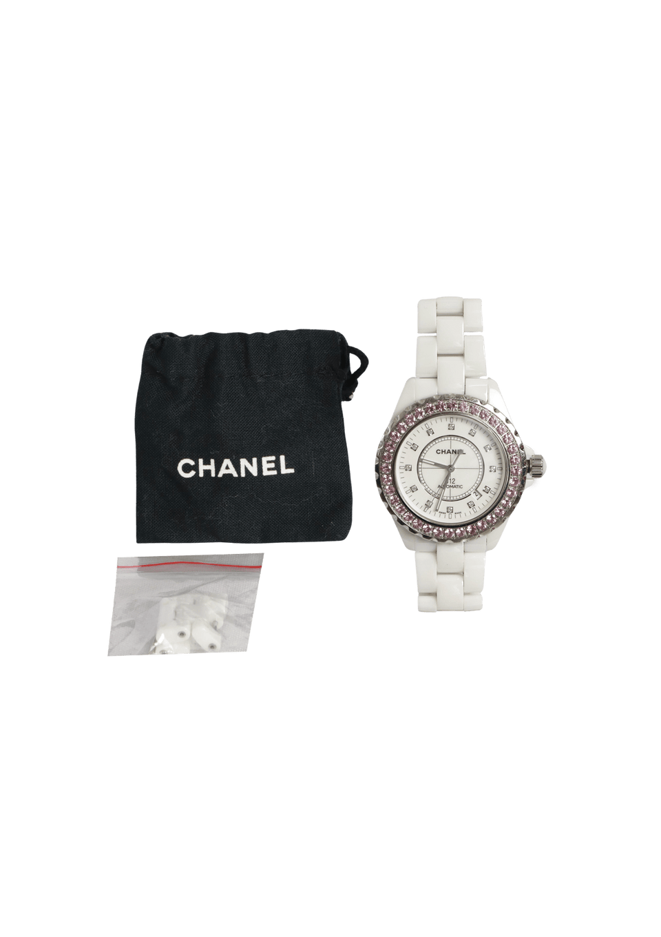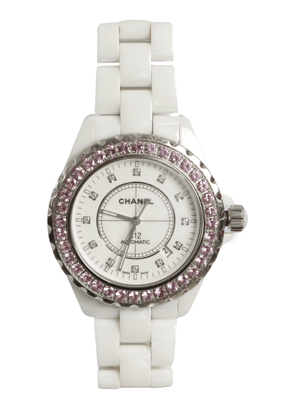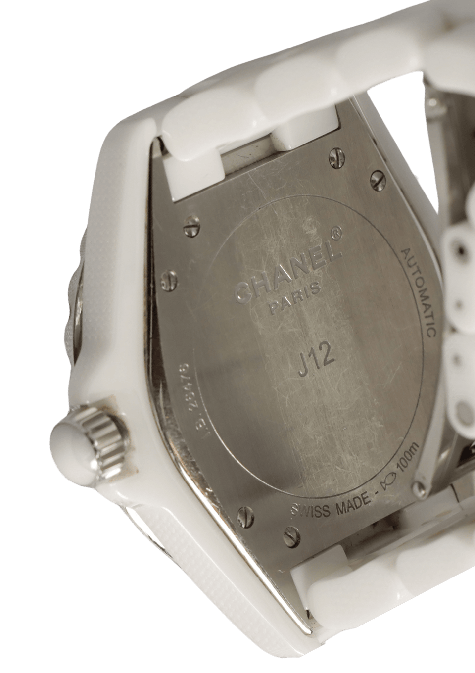• Marcas e Contrastes: Chanel R Trademark, Paris, J12, swiss made, símbolo ressistência à água 100M;