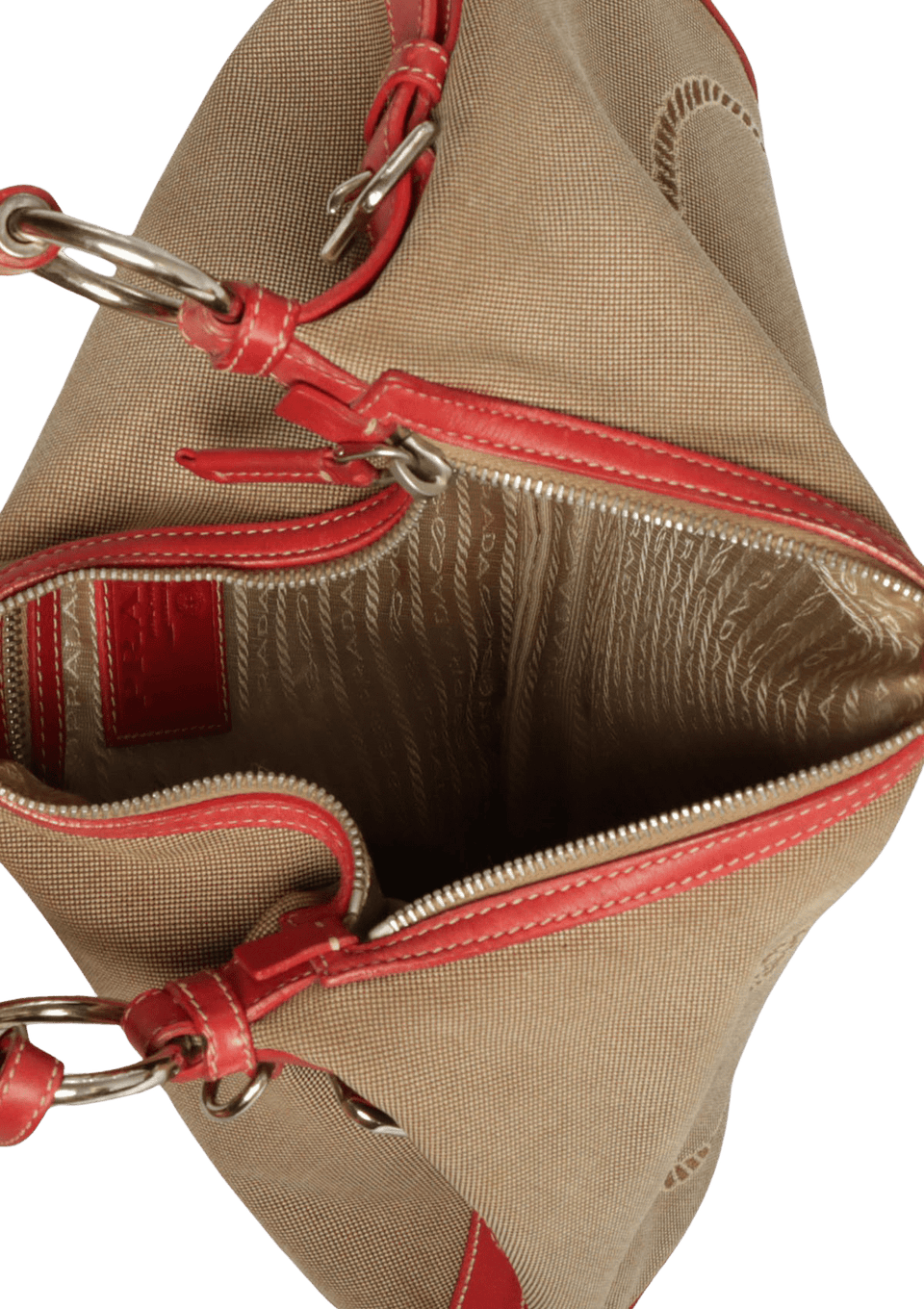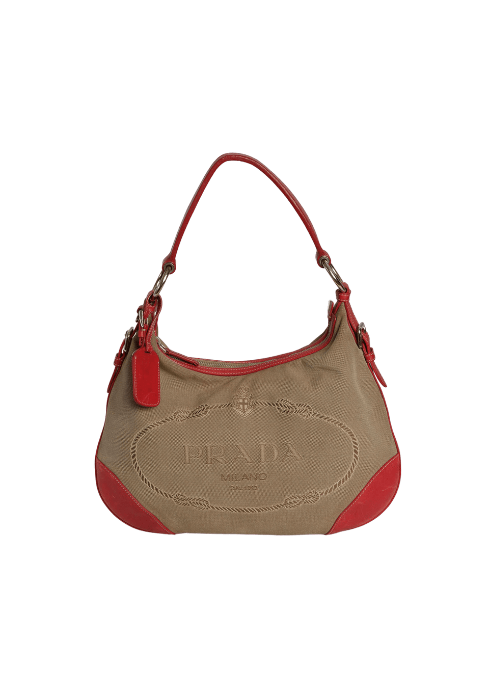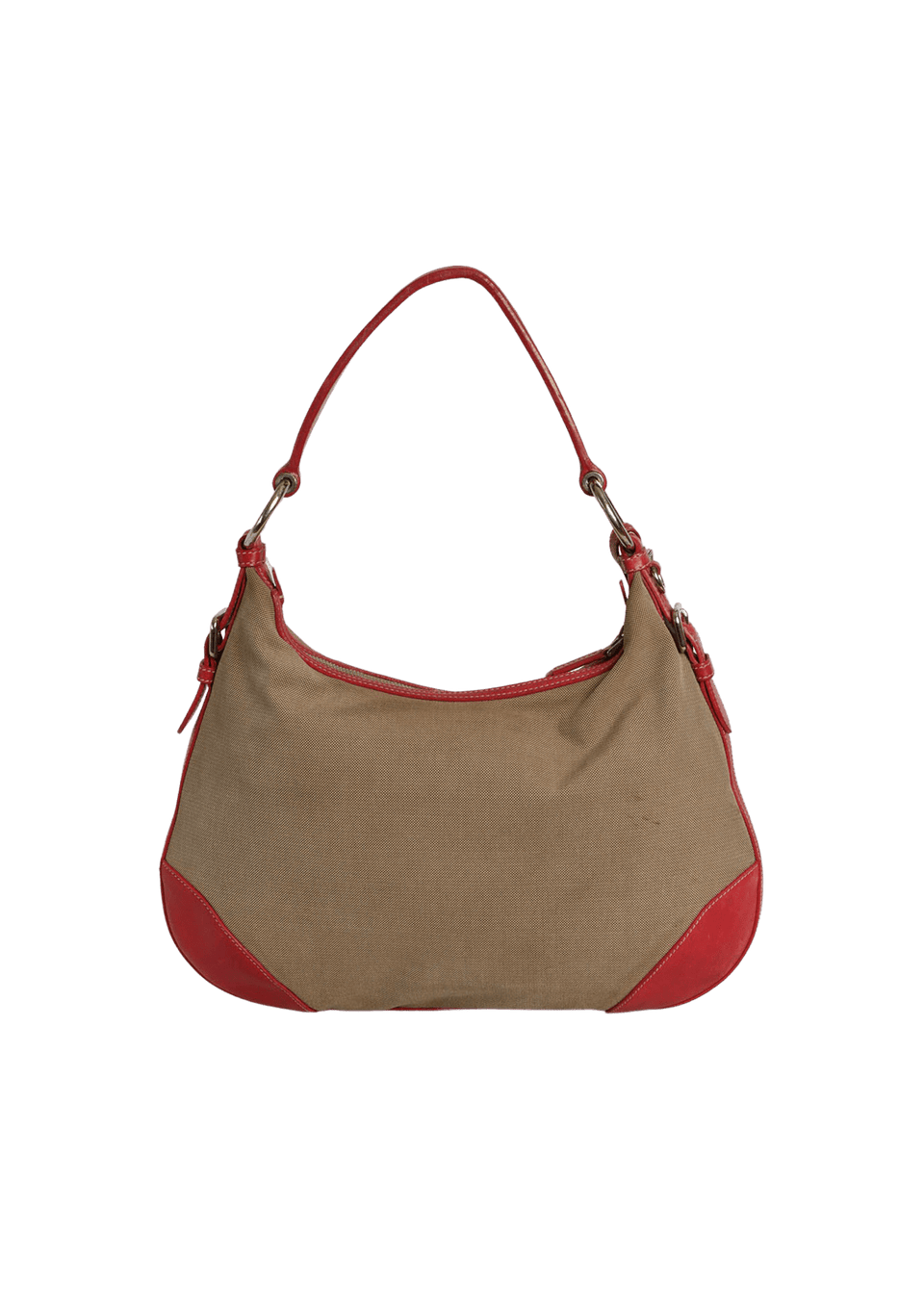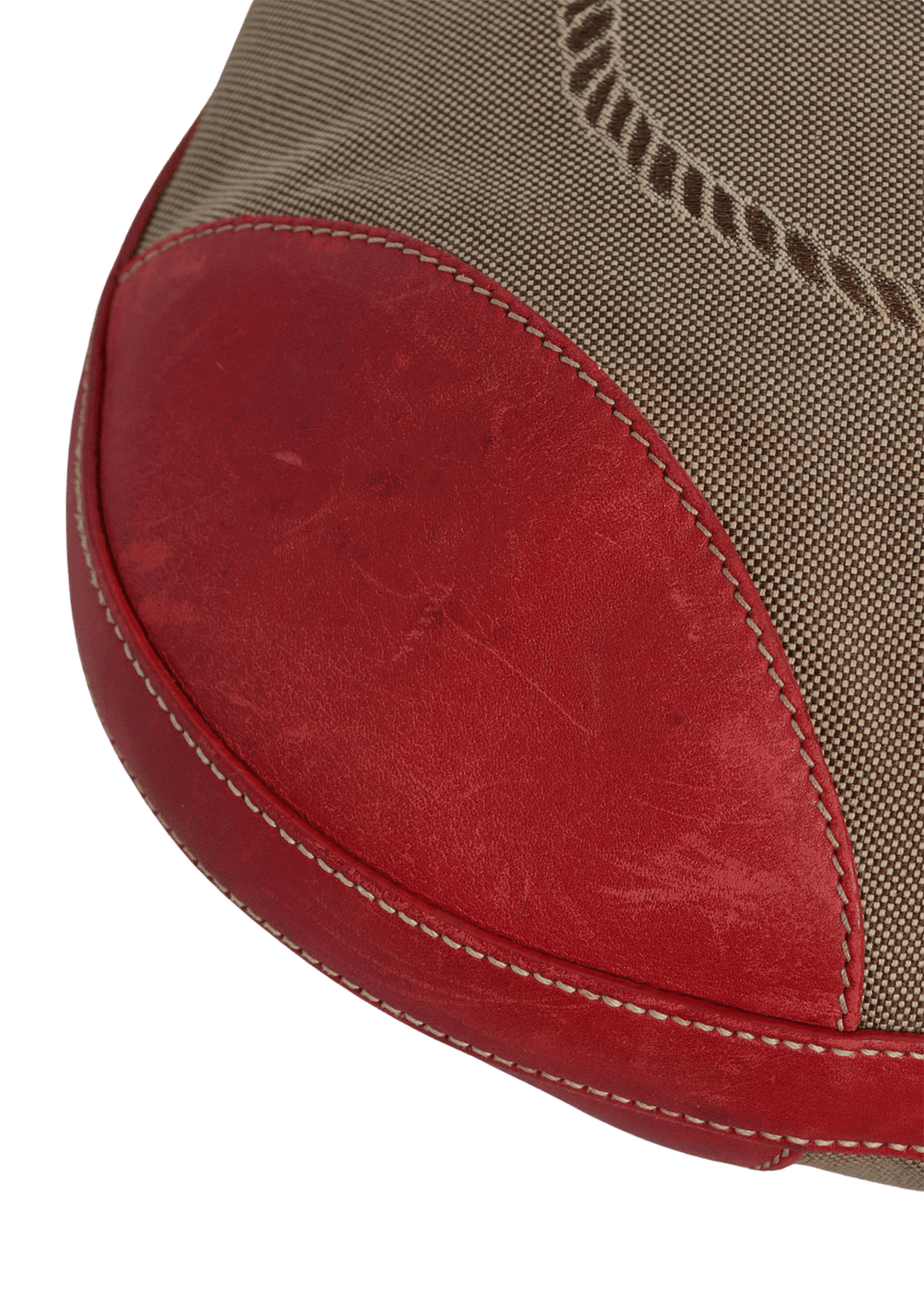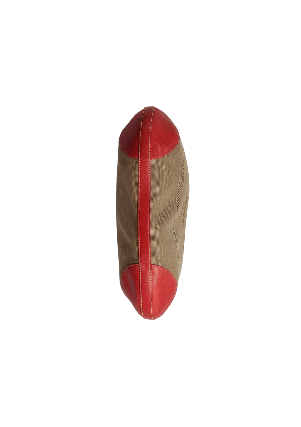 Condição: Bom, com aparência de usado. Apresenta leves desgastes por todo o couro vermelho, principalmente nos cantos da bolsa, leve deformação da alça, pequenos desgastes e opacidade das ferragens, pequena mancha escurecida no canvas do lado direito posterior e leve odor característico de item guardado.