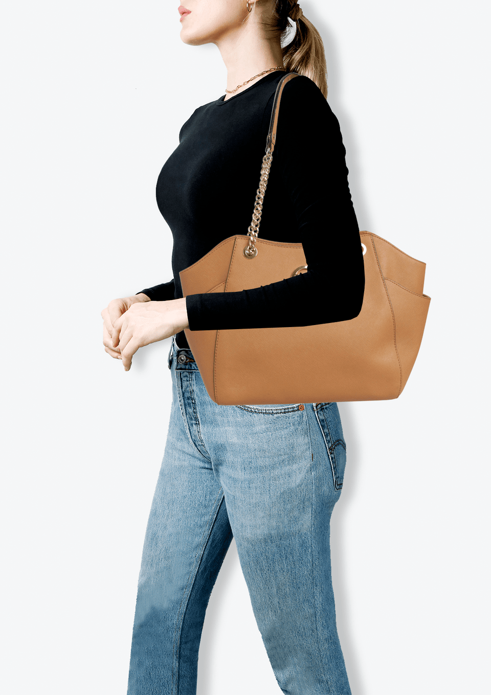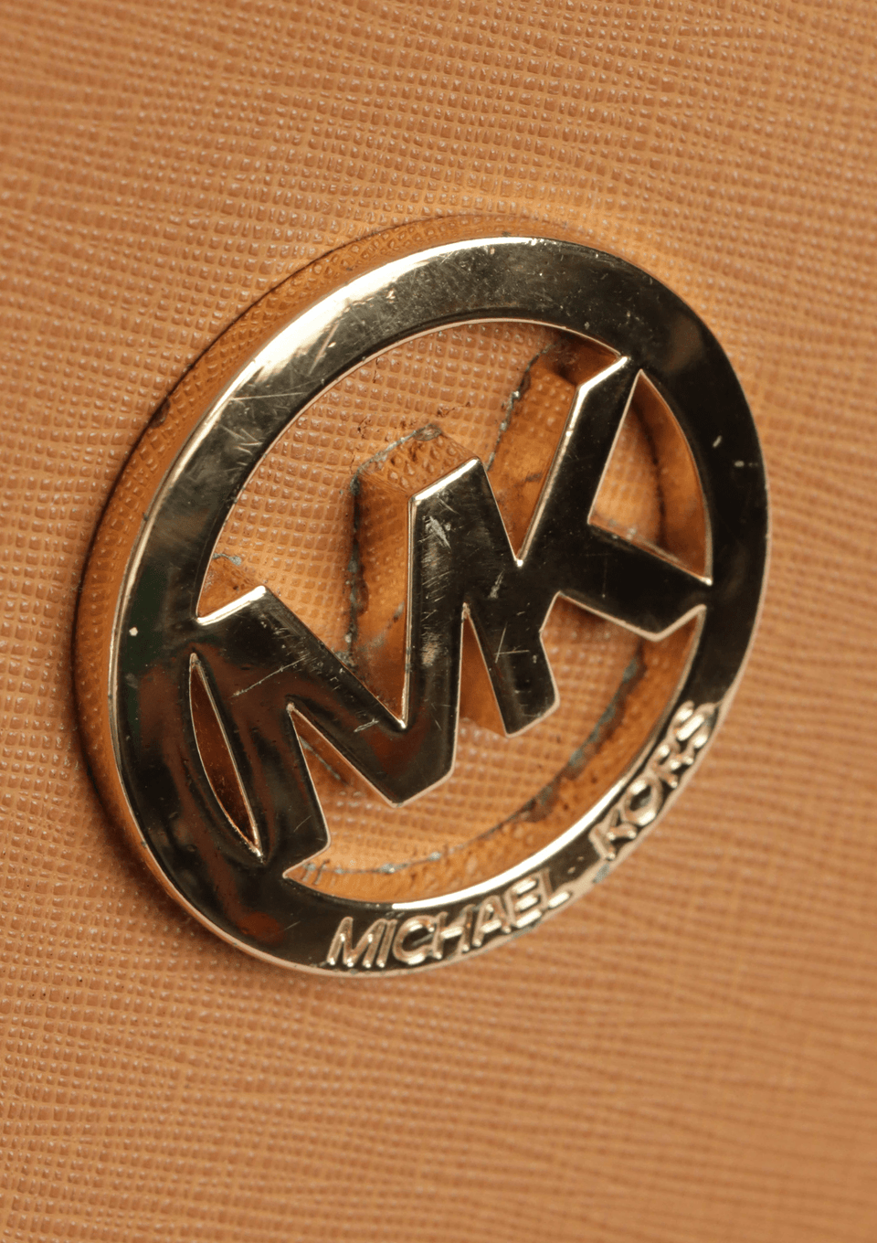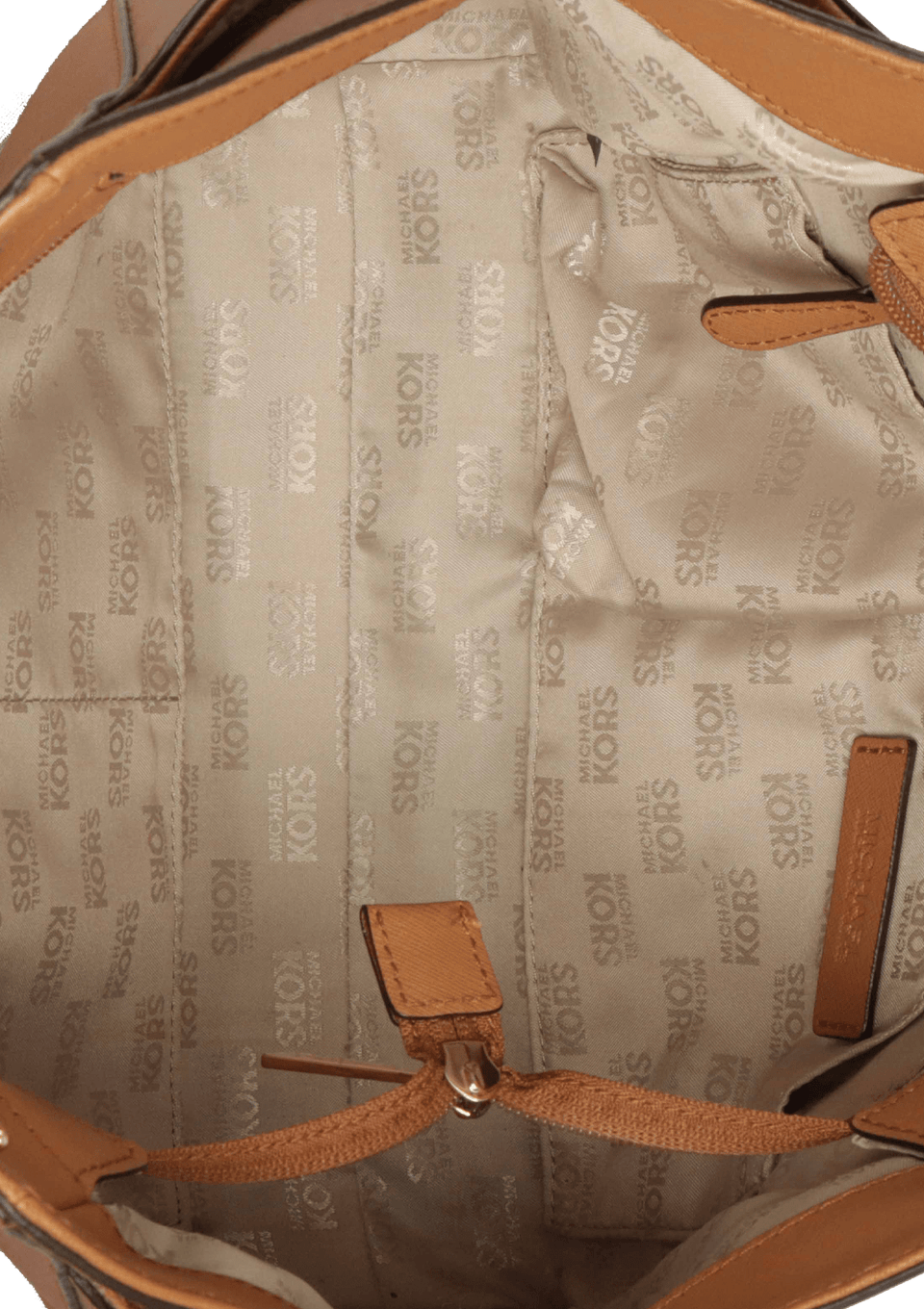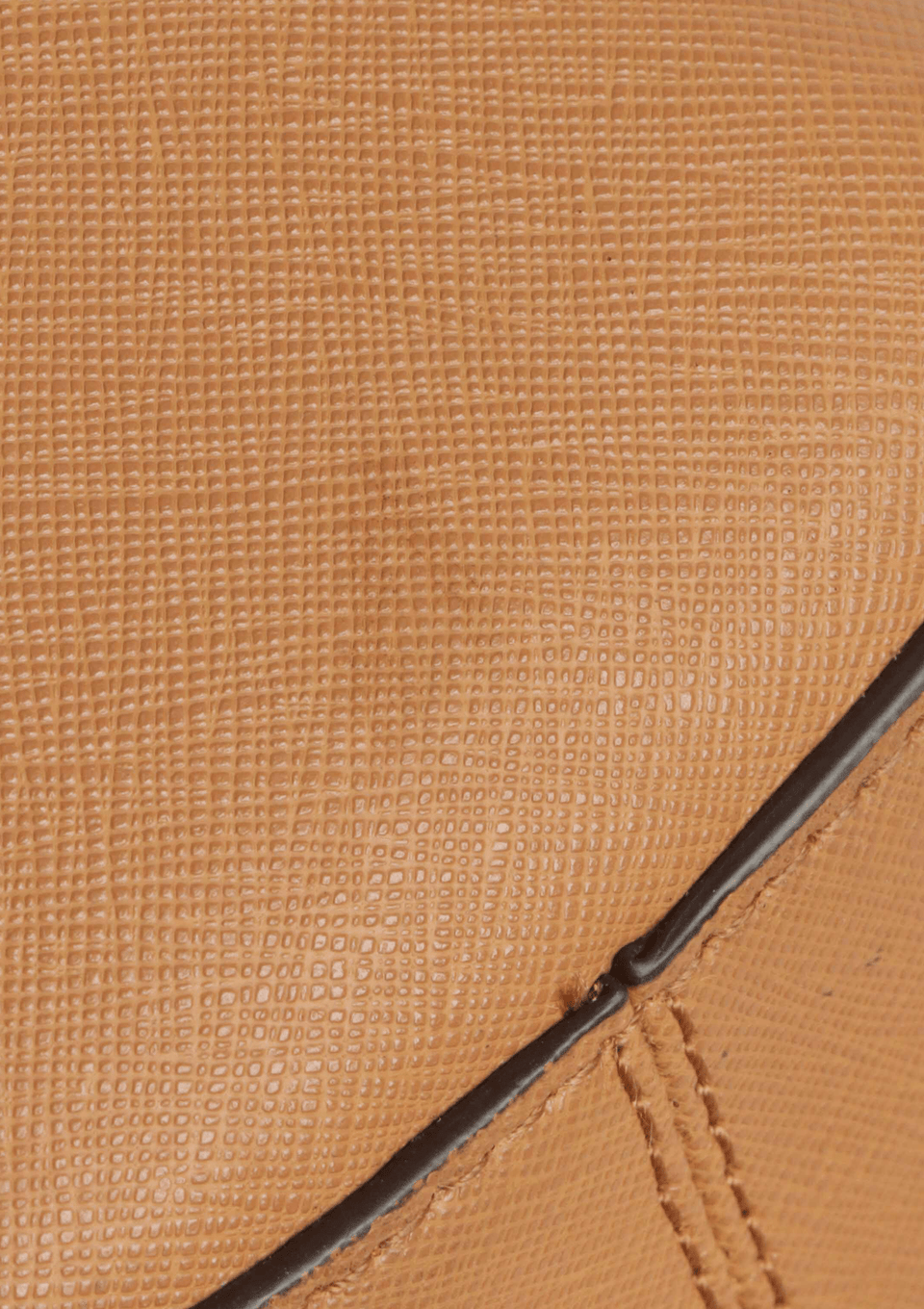 Condição: Regular. Apresenta oxidações severas e desbotamento de cor nas ferragens, manchas escuras nas laterais do couro, fissuras e deformação no couro das alças, pequena mancha escura no forro, manchas amareladas no tecido interno e tecido desgastado no bolso lateral esquerdo.