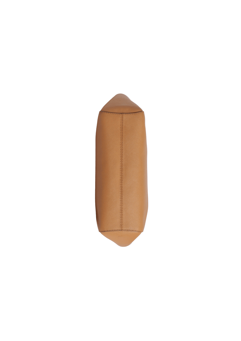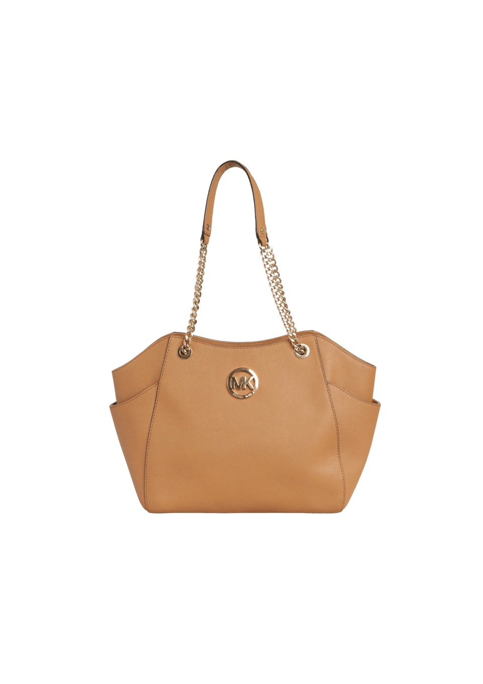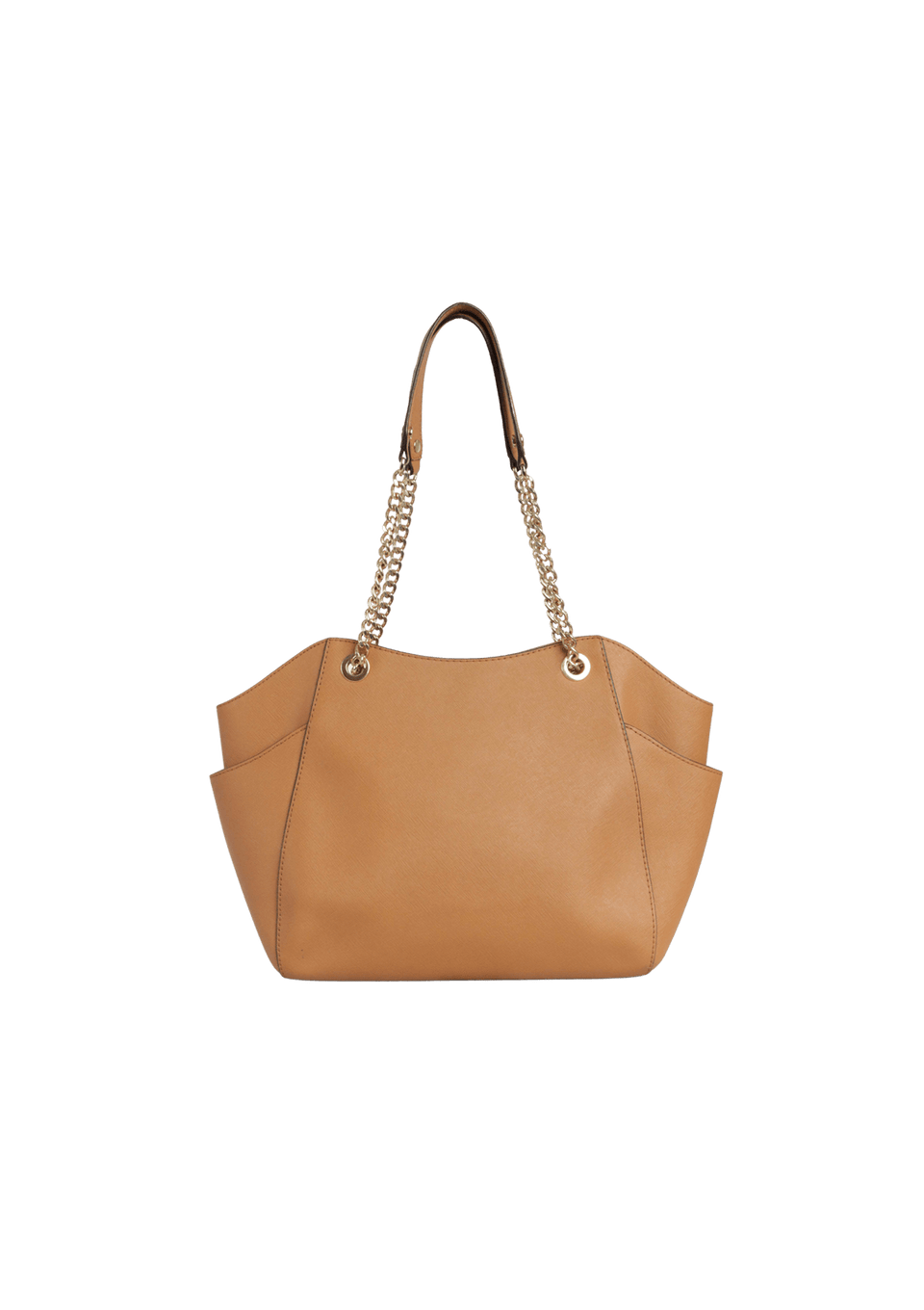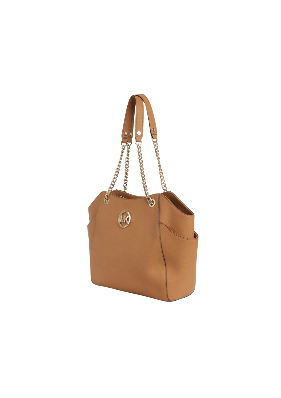 Condição: Regular. Apresenta oxidações severas e desbotamento de cor nas ferragens, manchas escuras nas laterais do couro, fissuras e deformação no couro das alças, pequena mancha escura no forro, manchas amareladas no tecido interno e tecido desgastado no bolso lateral esquerdo.