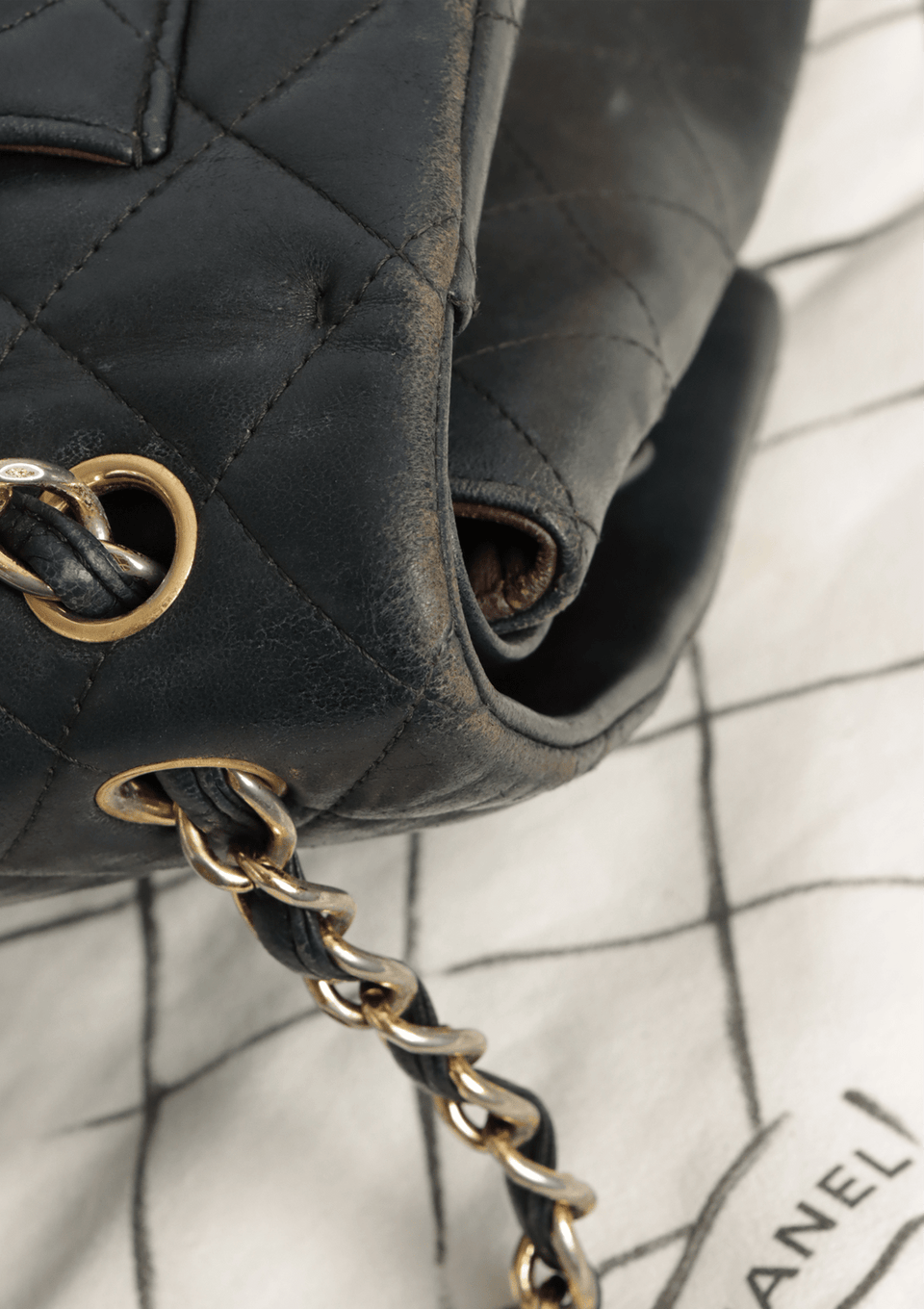 Condição: Regular. Apresenta severos desgastes pelas extremidades do couro, principalmente nos cantos da base e laterais da aba, severas marcas de uso pelo couro na parte interna, principalmente nas laterais, marcas de uso e descolorações pelas ferragens de fechamento, ilhoses e corrente das alças, leve desgastes na gravação interna da marca e couro ressecado.