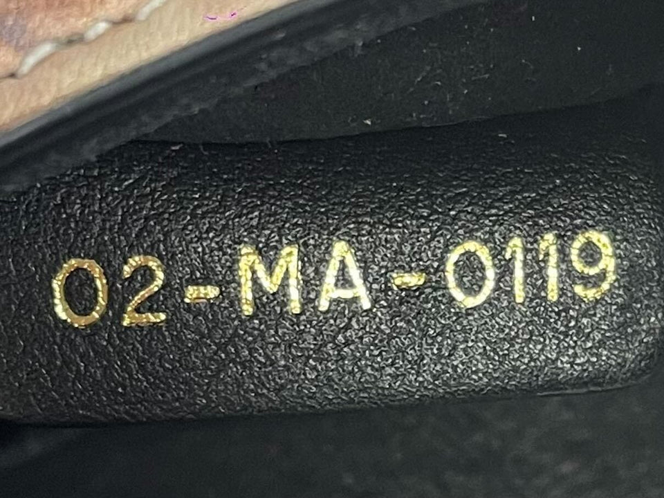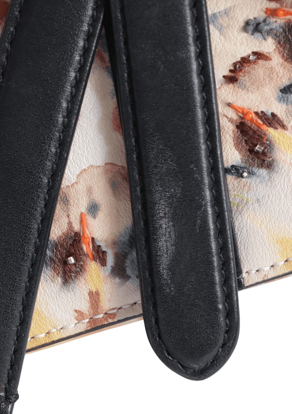 - Couro calfskin com estampa Kaleidiorscopic com aplicação de bordados e miçangas, e detalhes em couro calfskin preto;
