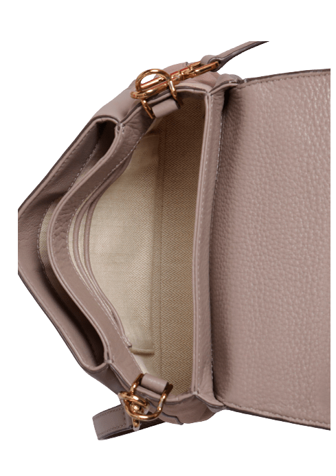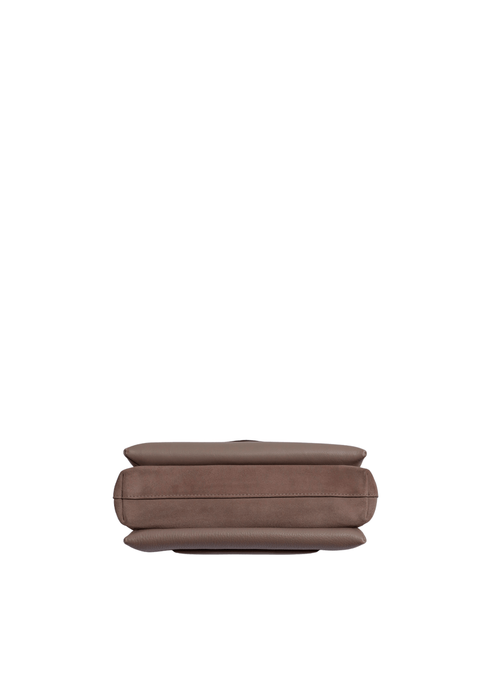 Condição: Bom, com aparência de usado. Apresenta leves desgastes nas ferragens, especialmente descolorações no fecho, pequenas fissuras nos acabamentos internos da aba, leves desgastes no couro nos cantos inferiores, leves marcas de uso no suede e na parte inferior frontal e pequenas manchas avermelhadas no forro do compartimento central.