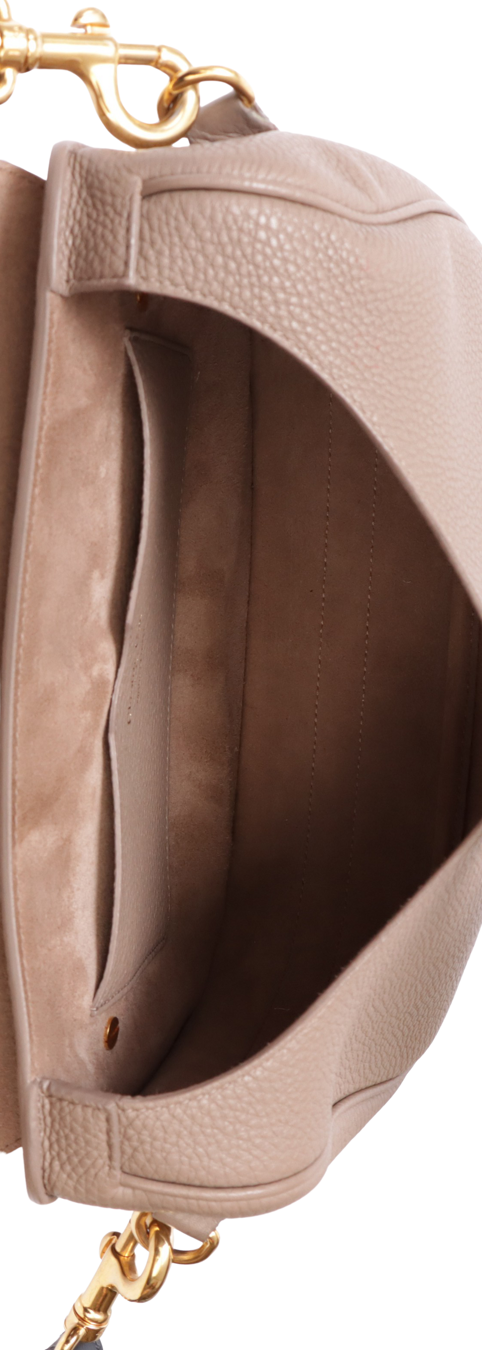 Bom, com aparência de usado. Apresenta leves desgastes, marcas de uso e manchas escurecidas pelo couro, principalmente ao redor da logo e nos acabamentos inferiores, pequenas fissuras e desgastes nas selagens, especialmente nos acabamentos laterais superiores, leves marcas de uso e descolorações nas ferragens, principalmente na logo, pequena deformação na estrutura, especialmente nas laterais superiores, leves desgastes e fios puxados pela alça e pequenas manchas escurecidas, marcas de uso e desgastes no forro, principalmente nos acabamentos da aba e na base.