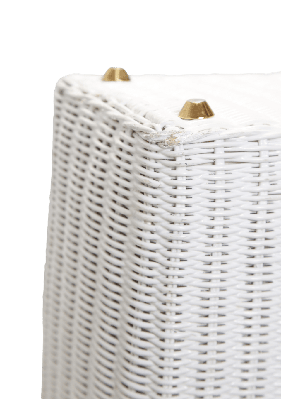 Condição: Bom, com aparência de usado. Apresenta pequenos desgastes no vime nos cantos da base, manchas nas alças e no forro e pequenos desgastes nas ferragens.